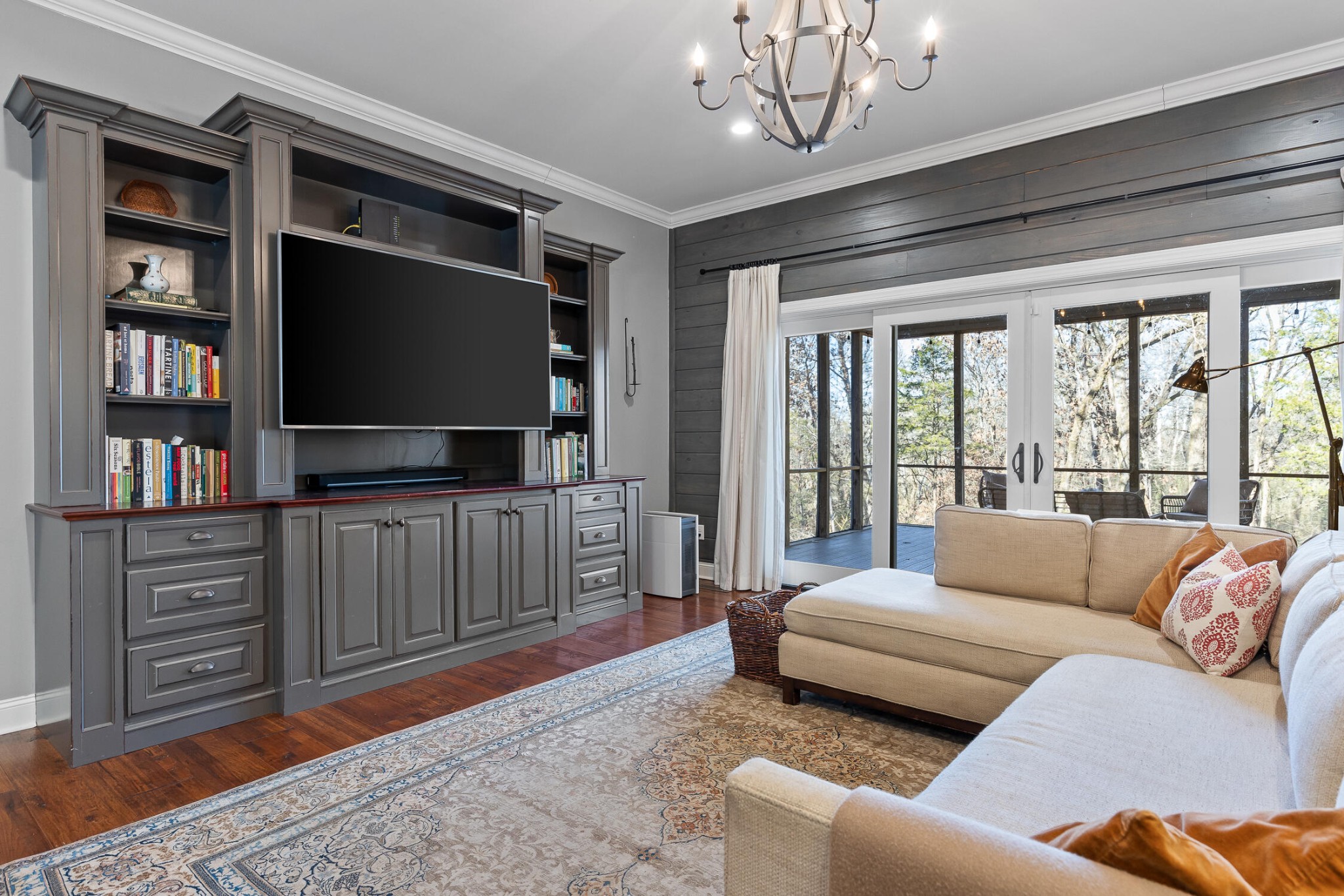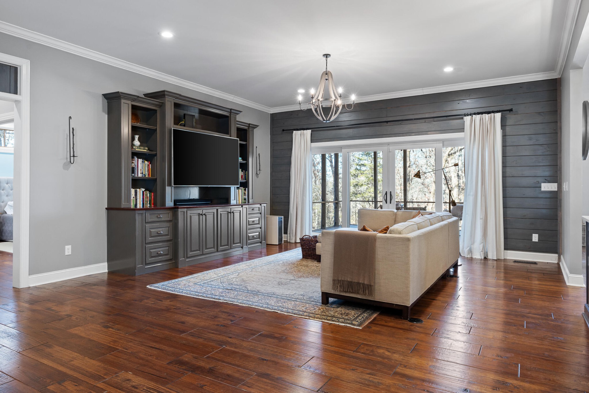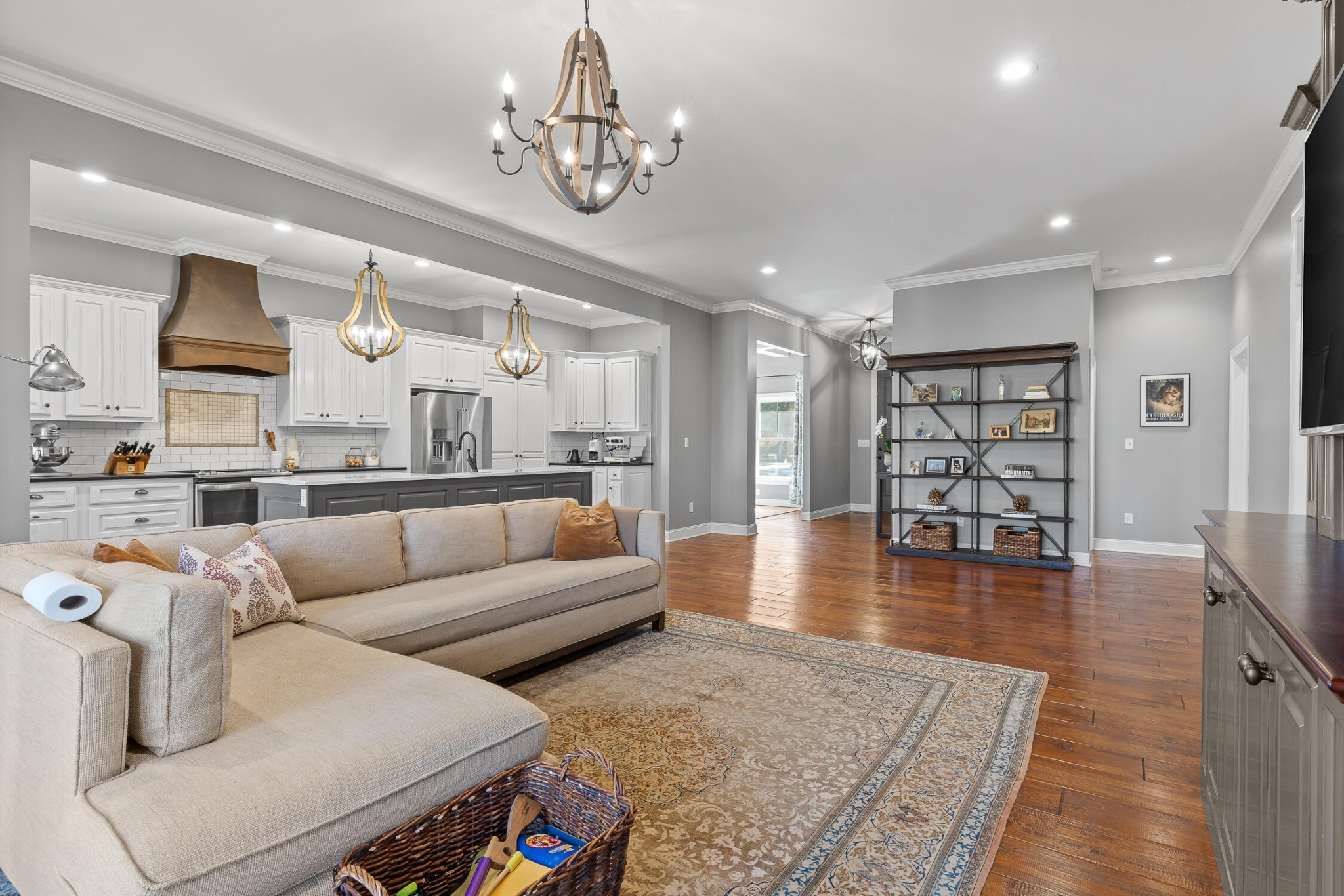 Welcome to your private sanctuary on nearly 14 acres along the serene West Chickamauga Creek. Take a drive along the meandering driveway and immerse yourself in luxury as you enter this 4-bedroom, 3.5-bathroom, 4000 sqft home, meticulously built in 2015. The grandeur begins with exquisite hardwood floors, high ceilings, and an inviting open floor plan. As you enter the home, you are greeted with the formal dining room, adorned with coffered ceilings, adjacent to the stylish kitchen. The exquisite kitchen features beautiful white cabinets, granite counters, and stainless steel appliances. Discover a hidden pantry with matching cabinet doors and a seamless pass-through to the garage for convenient grocery delivery. Seamlessly flowing into the expansive living room, revel in the tongue-and-groove accent wall and custom entertainment center or to the sunlight bathed breakfast room with custom built in hutch. The primary suite is on the first floor and dazzles with tray ceilings and a walk-in closet doubling as a storm shelter with reinforced walls and a steel door. The en-suite primary bathroom features double sinks, a spacious walk-in tile shower with double shower heads and a private water closet. There are two additional guest bedrooms on the first floor, both with walk-in closets. The spacious first guest bedroom could easily double as a second primary suite with a full en-suite bathroom and tray ceilings with tongue and groove accents. The second guest bedroom is versatile in design as this room doubles effortlessly as a convenient office space. The adjacent guest bathroom ensures comfort and convenience, making it an ideal haven for visitors or a functional workspace to suit your needs. The laundry room is a vision of functionality with custom cabinets with storage galore, a double basin sink, and beautiful tile floors.