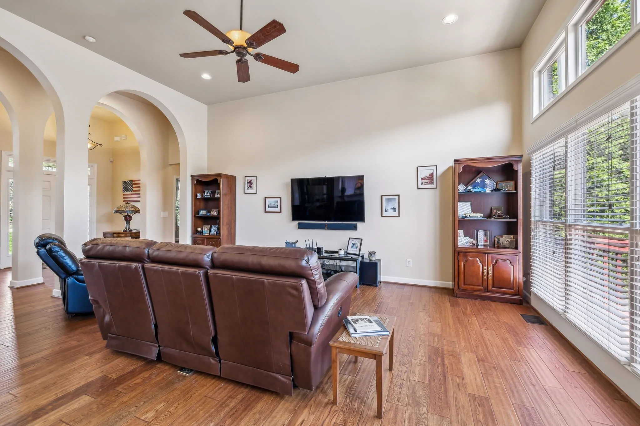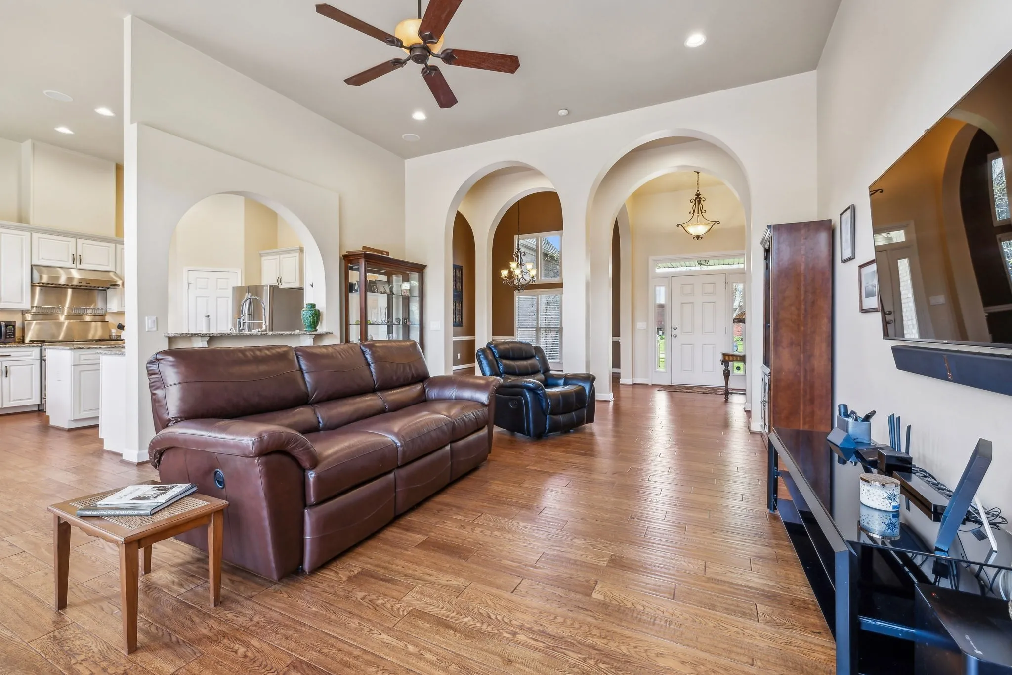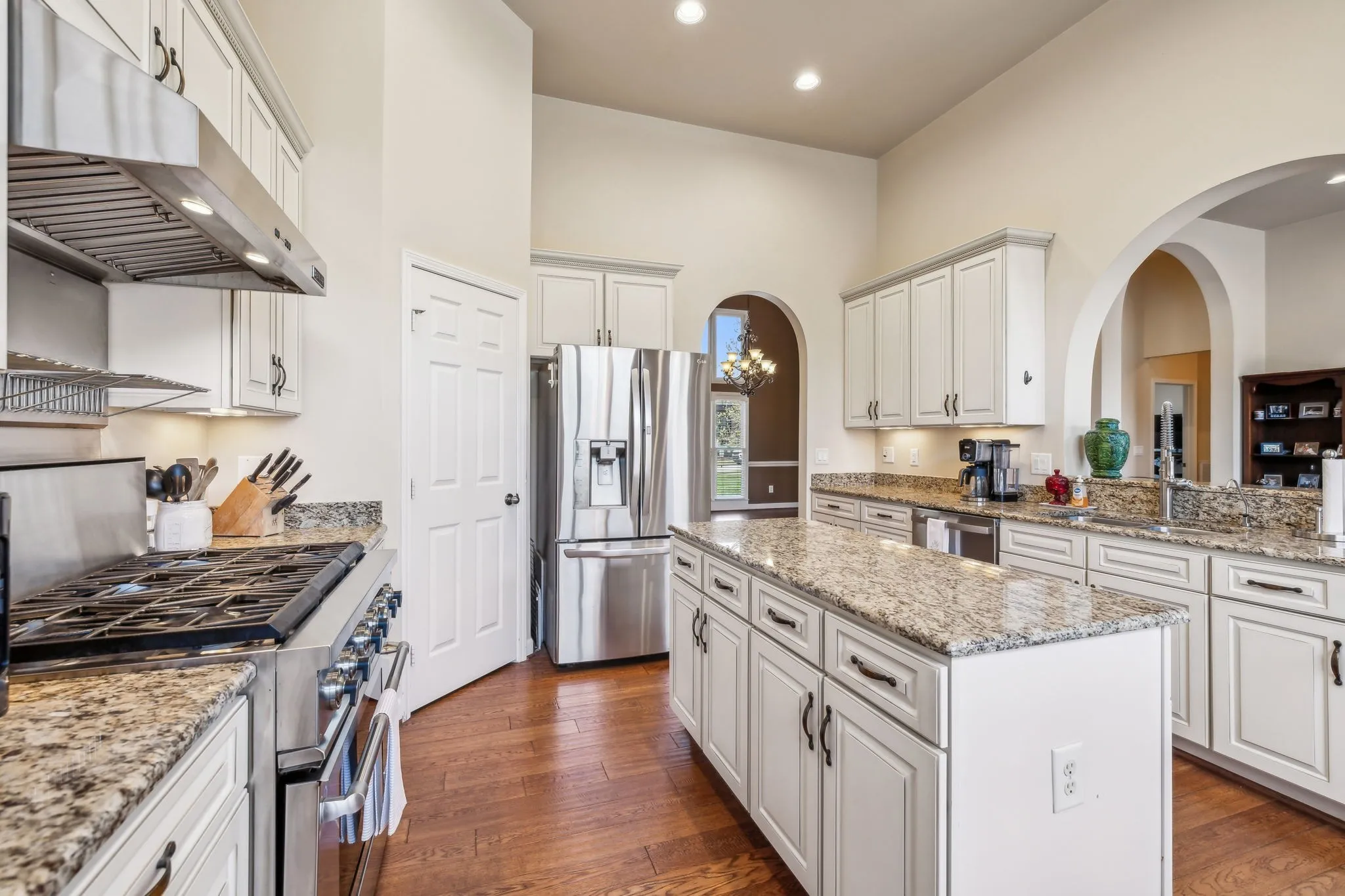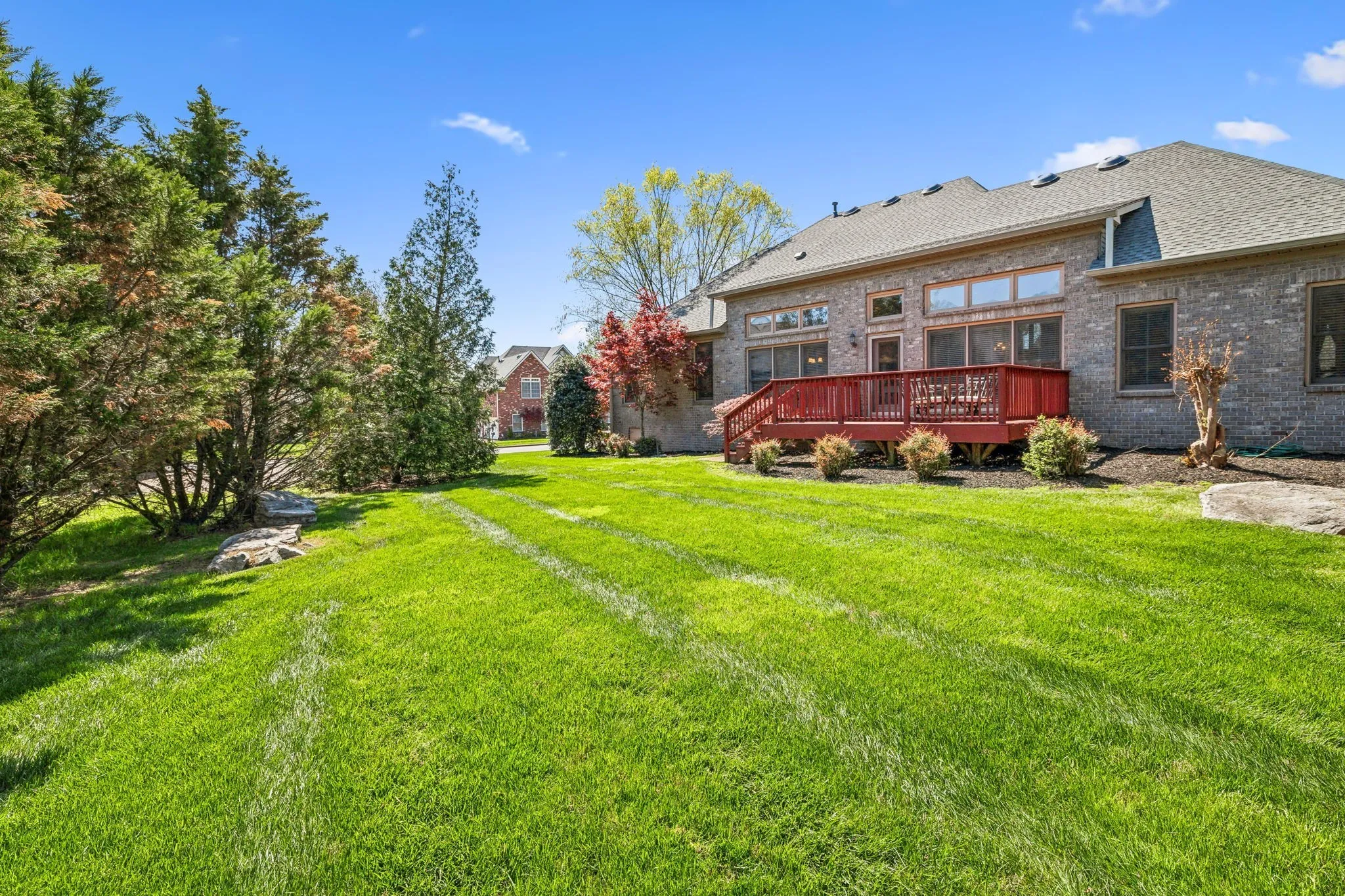 Beautiful 4 BR/3.5 BA home in desirable Meadows of Seven Points situated on a heavily landscaped .39 Acre level lot ~ MAIN LEVEL LIVING featuring THREE spacious bedrooms down ~ Hand scraped white oak hardwoods throughout the entire main level ~ Walls of windows & 12 ft ceilings in the main level living areas all in a light-filled open floor plan that invites the outdoors in ~ Great room, kitchen & dining flow together effortlessly for ideal entertaining ~ Chef’s Kitchen boasts stainless steel appliances including a JENN AIR 6 burner gas range & hood, Granite counters & workstation island + a corner pantry ~ Beautiful Primary Suite on the main level w/ His/Her WIC’s & en suite bath featuring Granite cabinet vanity & step in shower ~ Upstairs, you’ll find an expansive Bonus/Flex room with a Movie Theatre screen & projector, the private 4th bedroom & 3rd full bath perfect for teens/guests ~ The backyard, surrounded by mature trees, is ideal for outdoor activities or future enhancements + features the freshly stained deck w/ a gas grill hook up ** NEW ROOF (2024) ** Rain Soft Water Filtration System ~ Irrigation ~ Rare THREE CAR side entry garage w/ ample storage & workspace ~ CAT6/CAT5 Wiring ~ This home offers an extremely convenient location in a lovely neighborhood within minutes to Providence Market Place, two beautiful lakes, BNA Airport & a short commute to downtown Nashville!