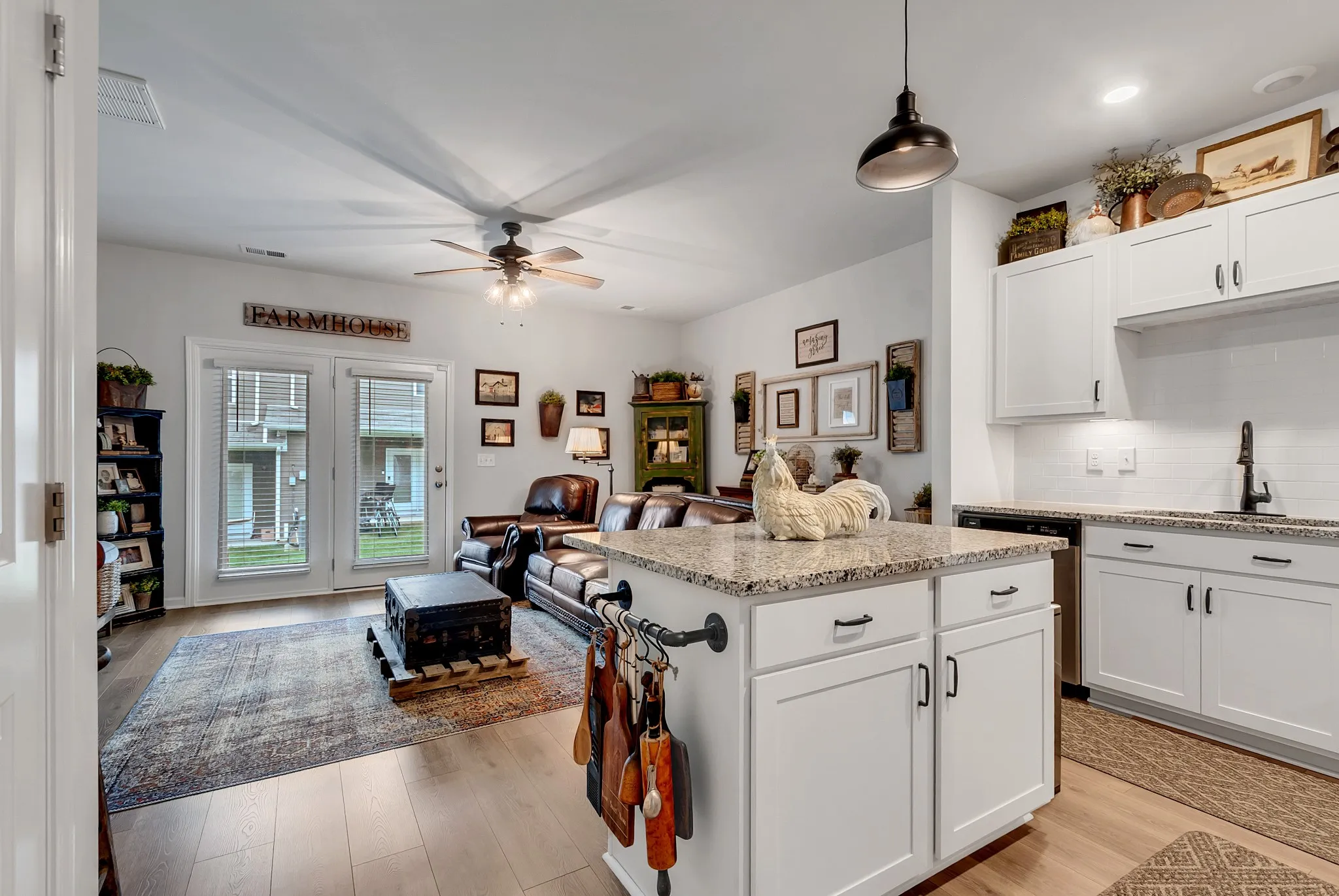 Step inside to find hardwood floors throughout the entire first level and second-floor hallway, complemented by custom-stained stairs with elegant handrails, newel posts, and wrought iron spindles. The kitchen features granite countertops, a tiled backsplash, under-cabinet lighting, and matte black fixtures and hardware for a modern touch.