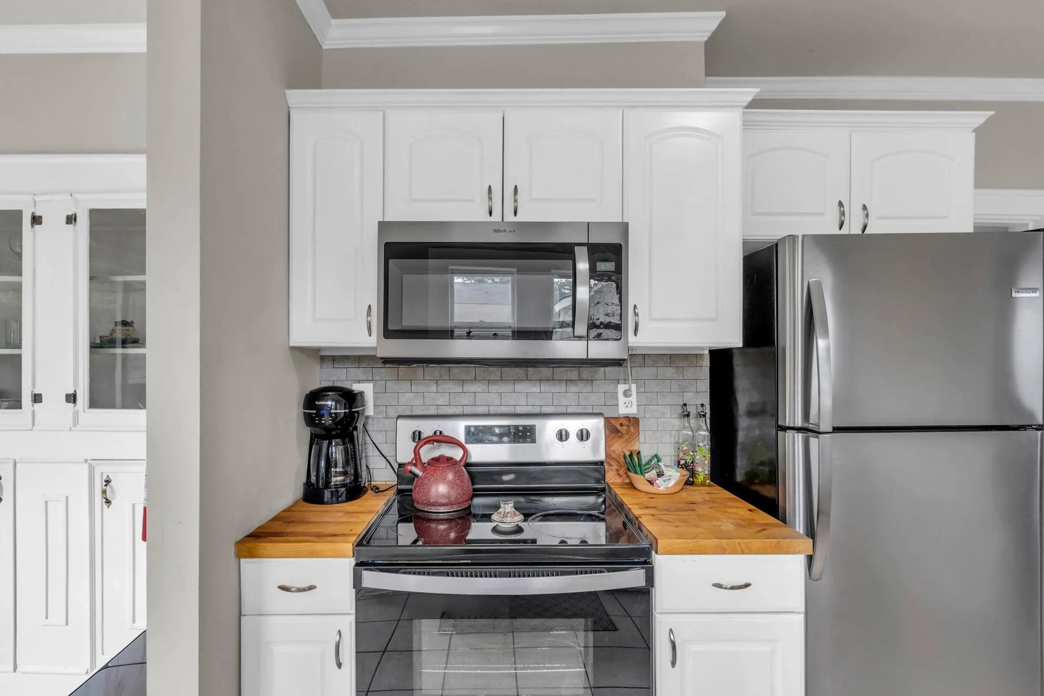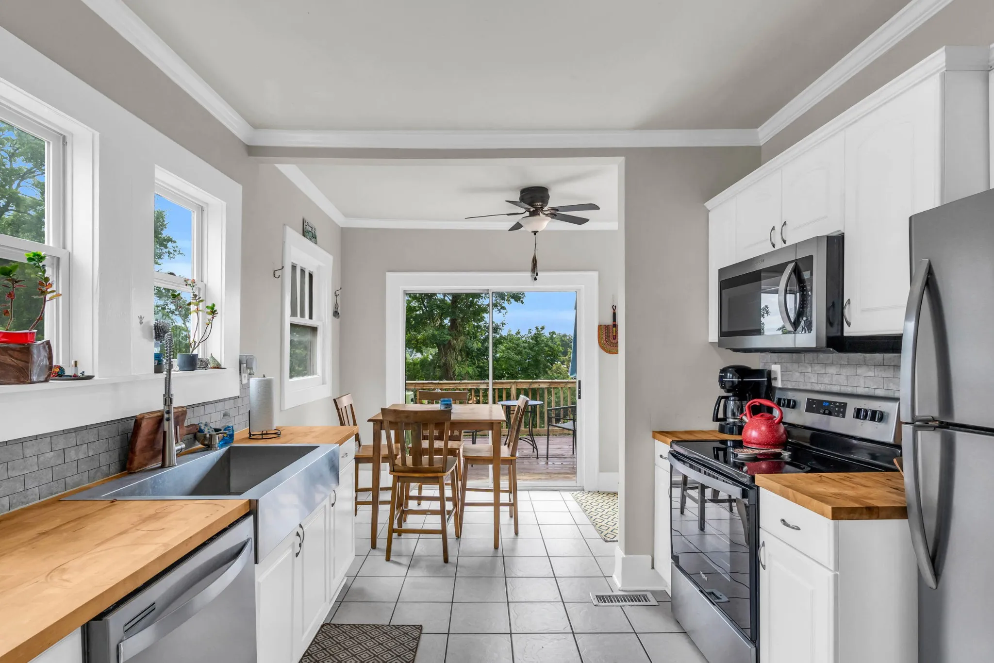 The bright eat-in kitchen includes butcher block countertops, a tile backsplash, stainless steel appliances and a cozy breakfast area with a built-in hutch and sliding glass doors that open to the rear deck—perfect for outdoor entertaining.