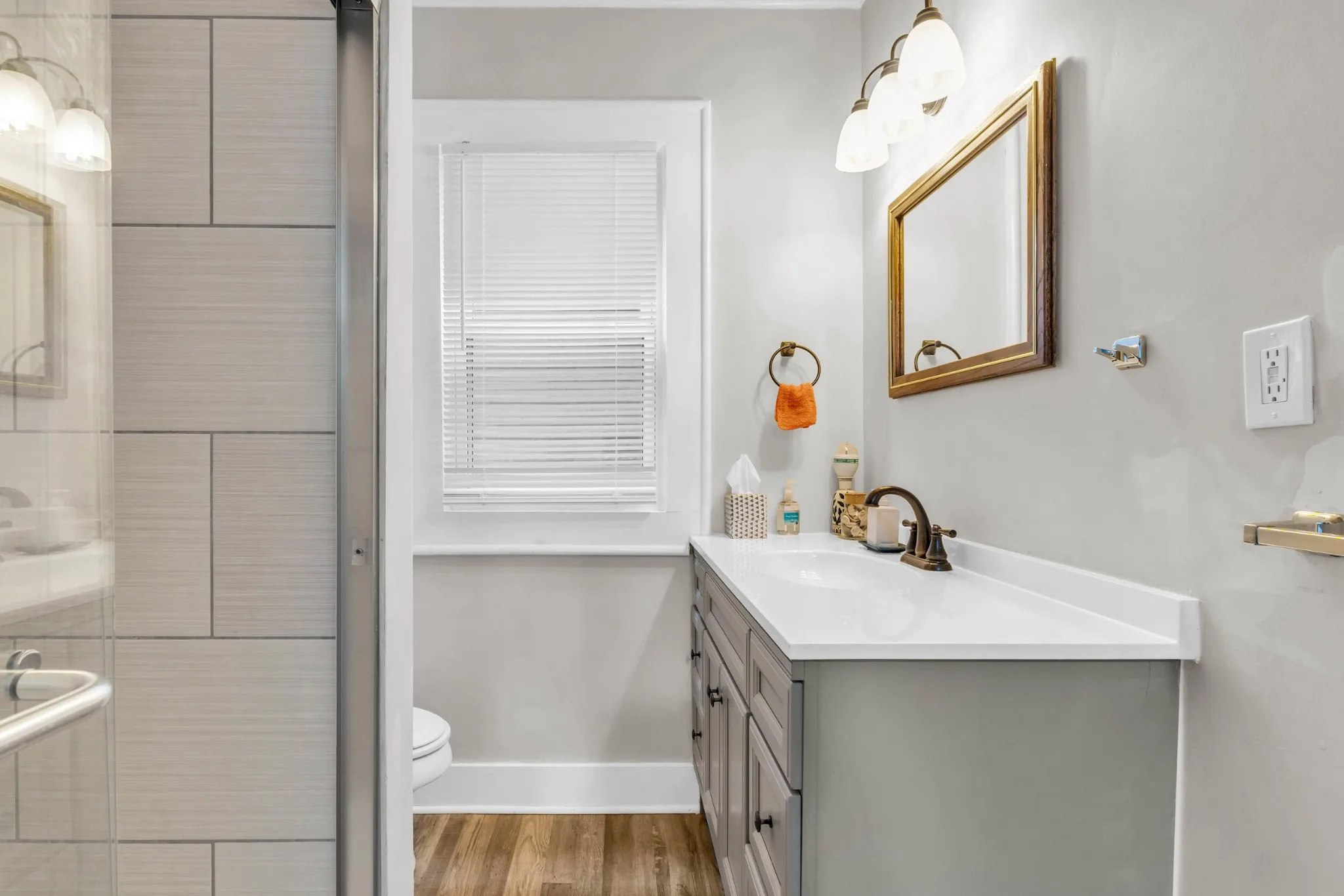 Two bedrooms with hardwood floors and a full hall bath featuring a spa-like vanity and a tile-and-glass shower complete the main level.
