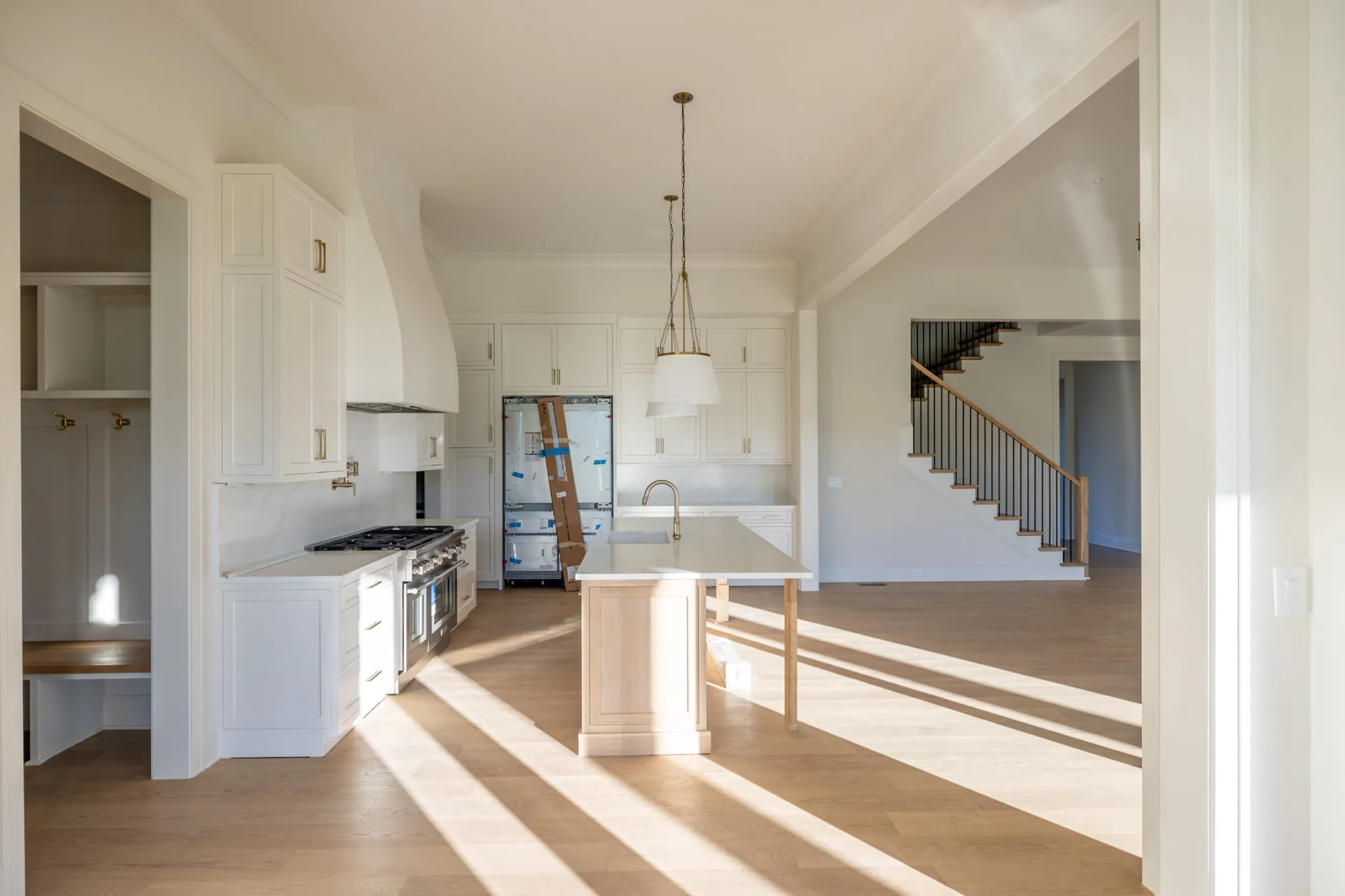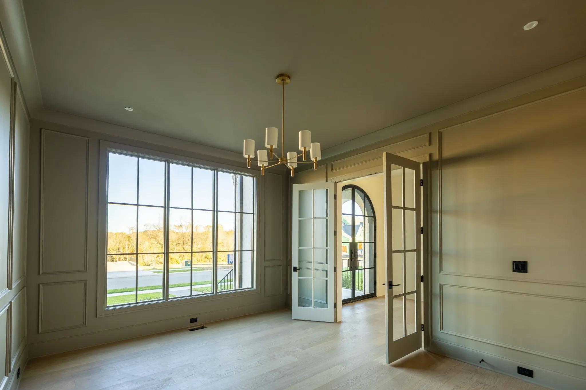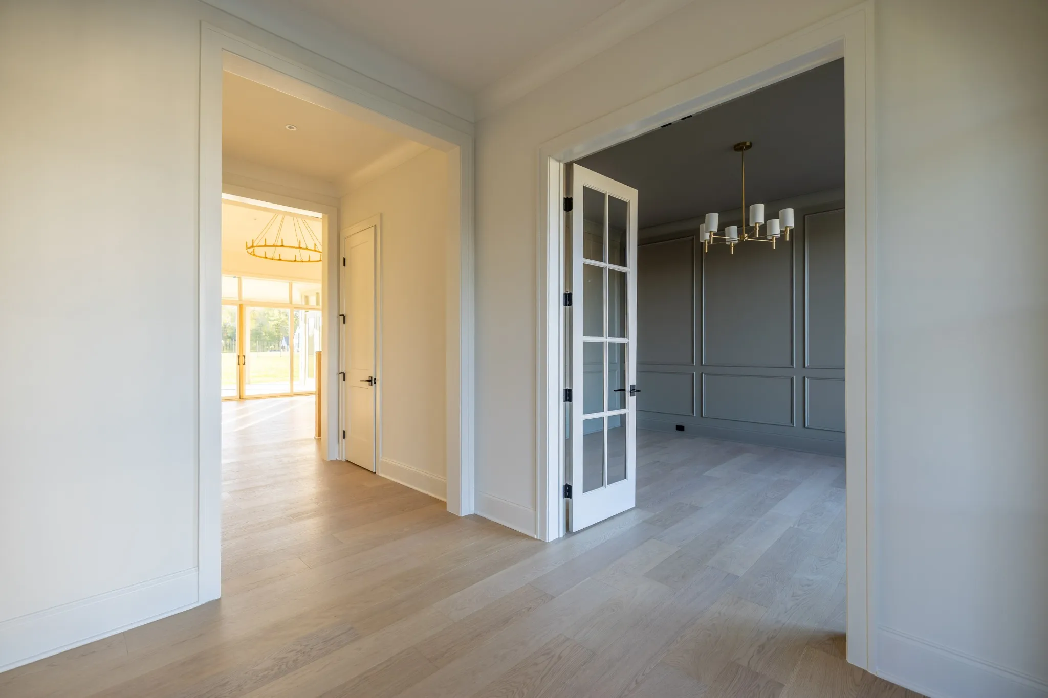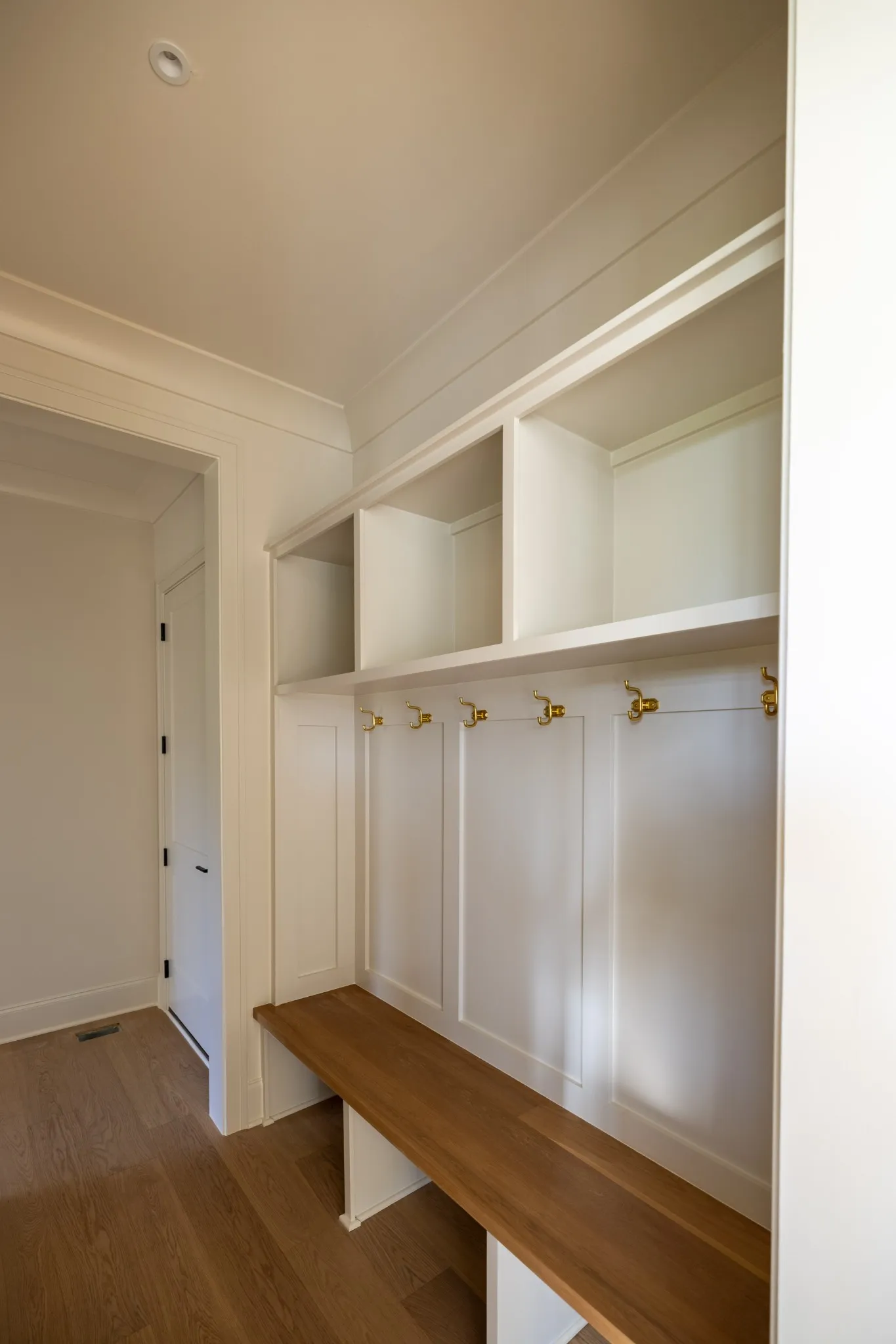 A formal study with French glass doors and floor-to-ceiling windows offers the perfect space for a home office or library. Off the garage, a custom drop zone with built-in hooks and cubbies provides practical organization for daily life.