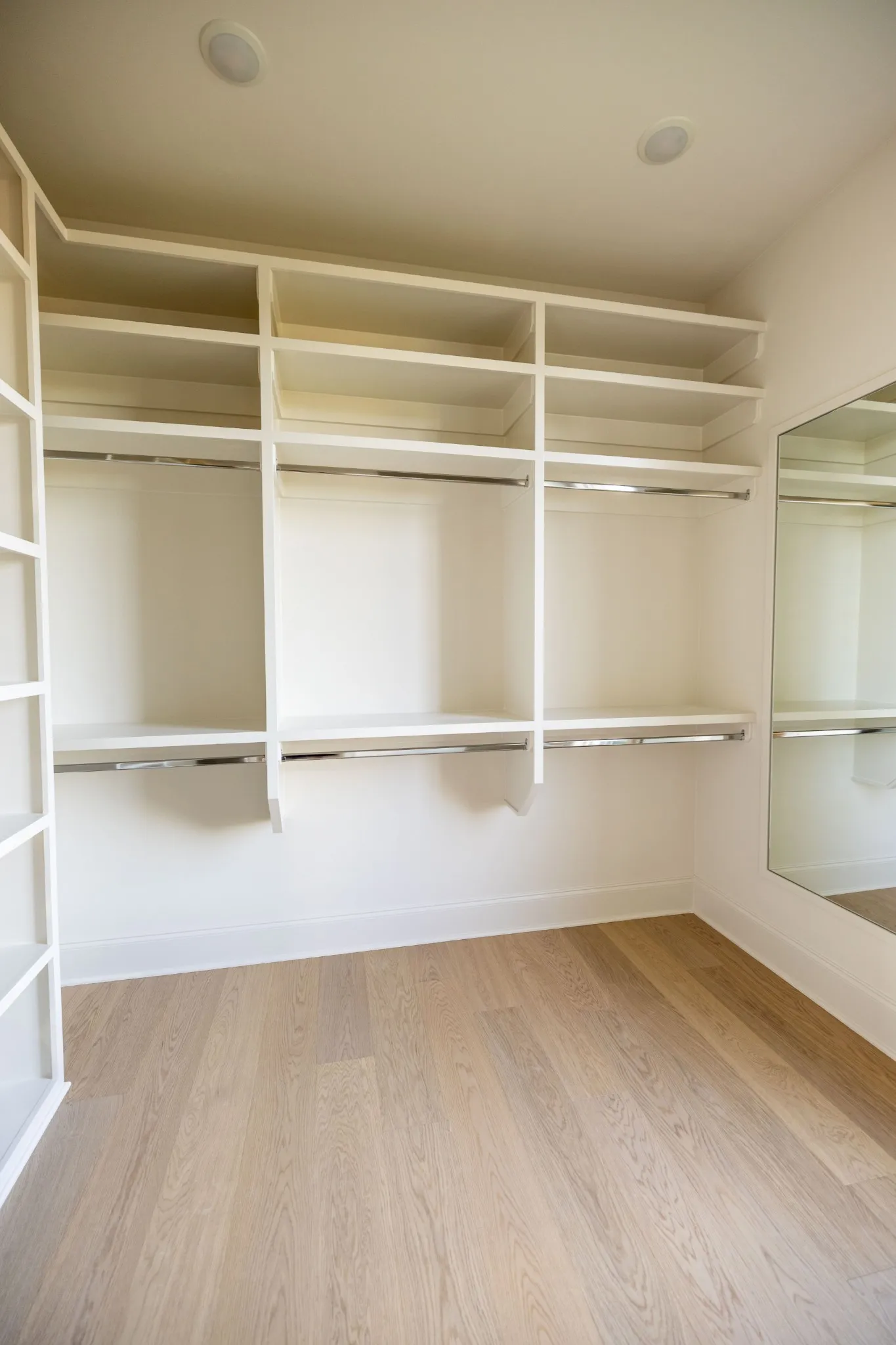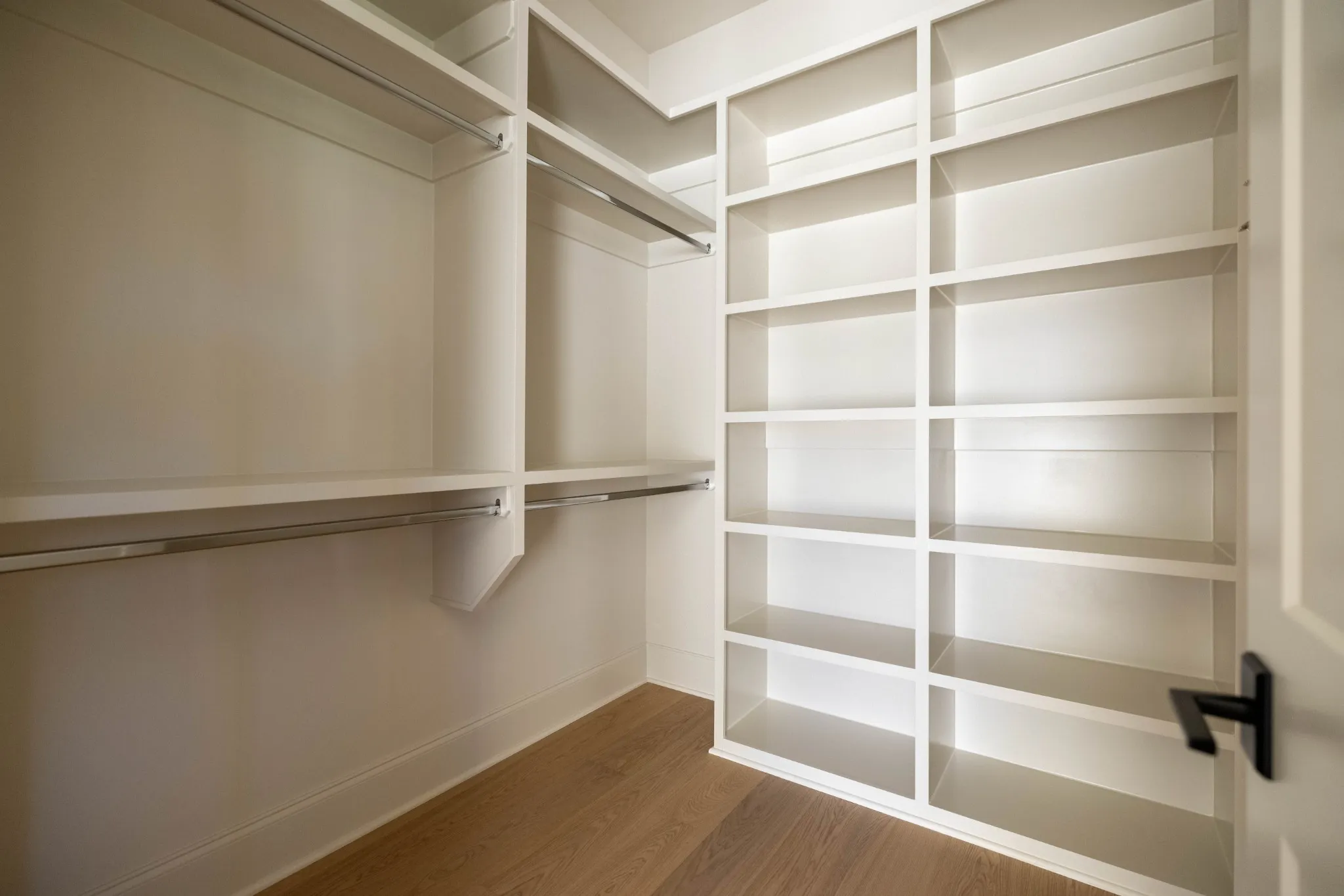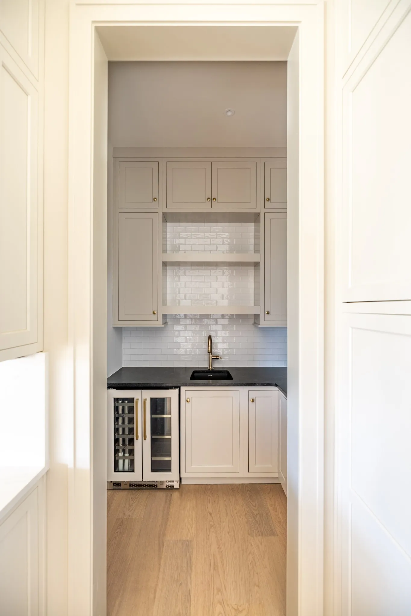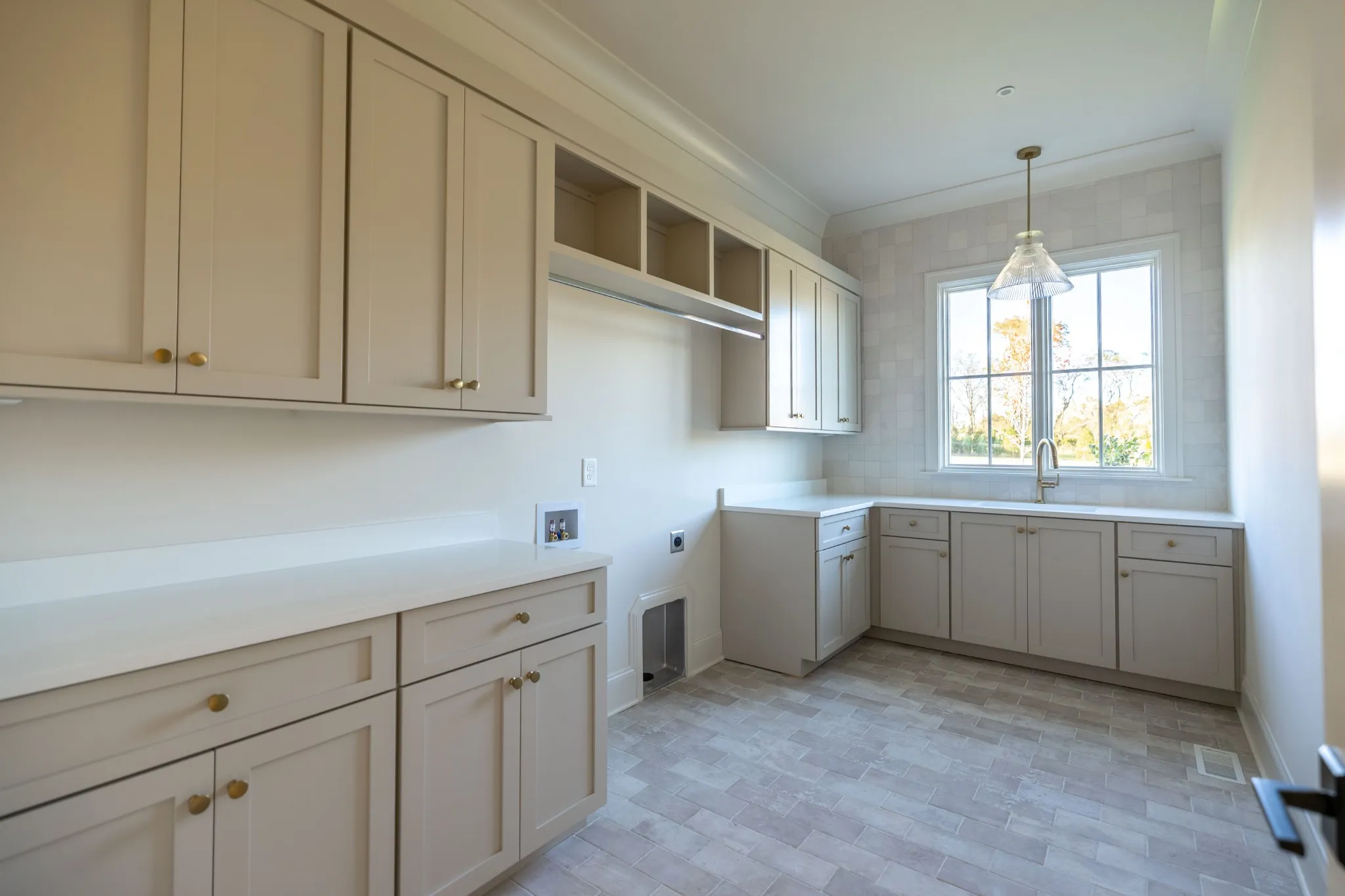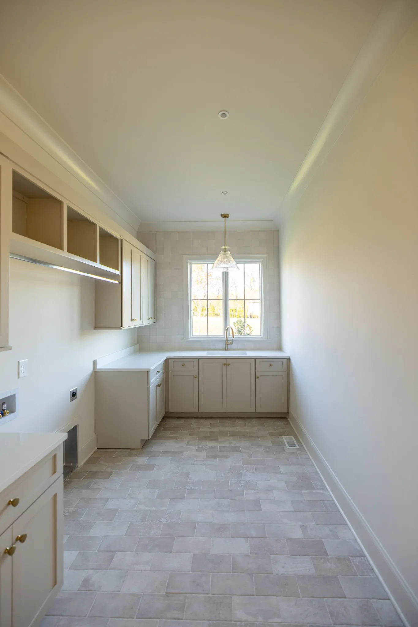 A formal study with French glass doors and floor-to-ceiling windows offers the perfect space for a home office or library. Off the garage, a custom drop zone with built-in hooks and cubbies provides practical organization for daily life.