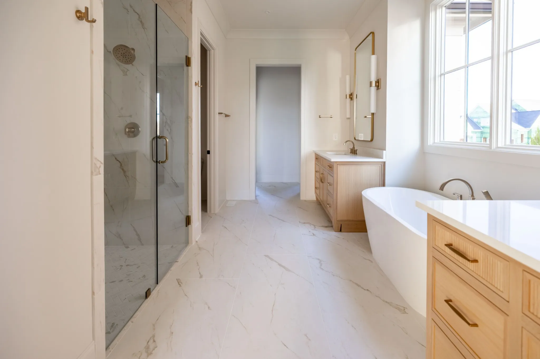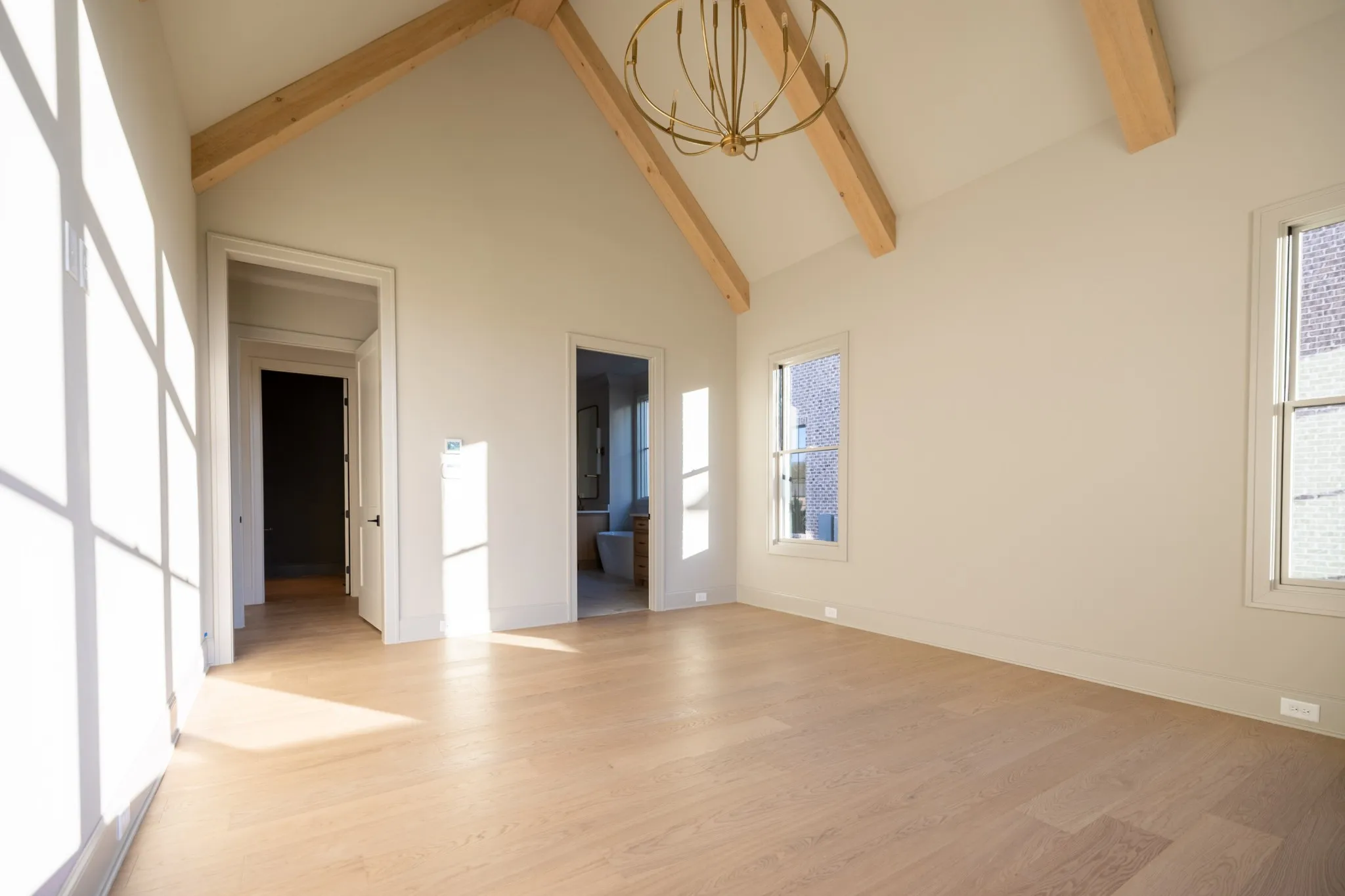 The main level boasts two bedrooms, including a luxurious primary suite with vaulted ceiling, wood beam accents, and dual walk-in closets. The spa-like primary bath features double vanities, a soaking tub, and a spacious walk-in shower. Upstairs, three additional bedrooms each include en suite baths and walk-in closets, along with a large bonus room perfect for media, play, or recreation.