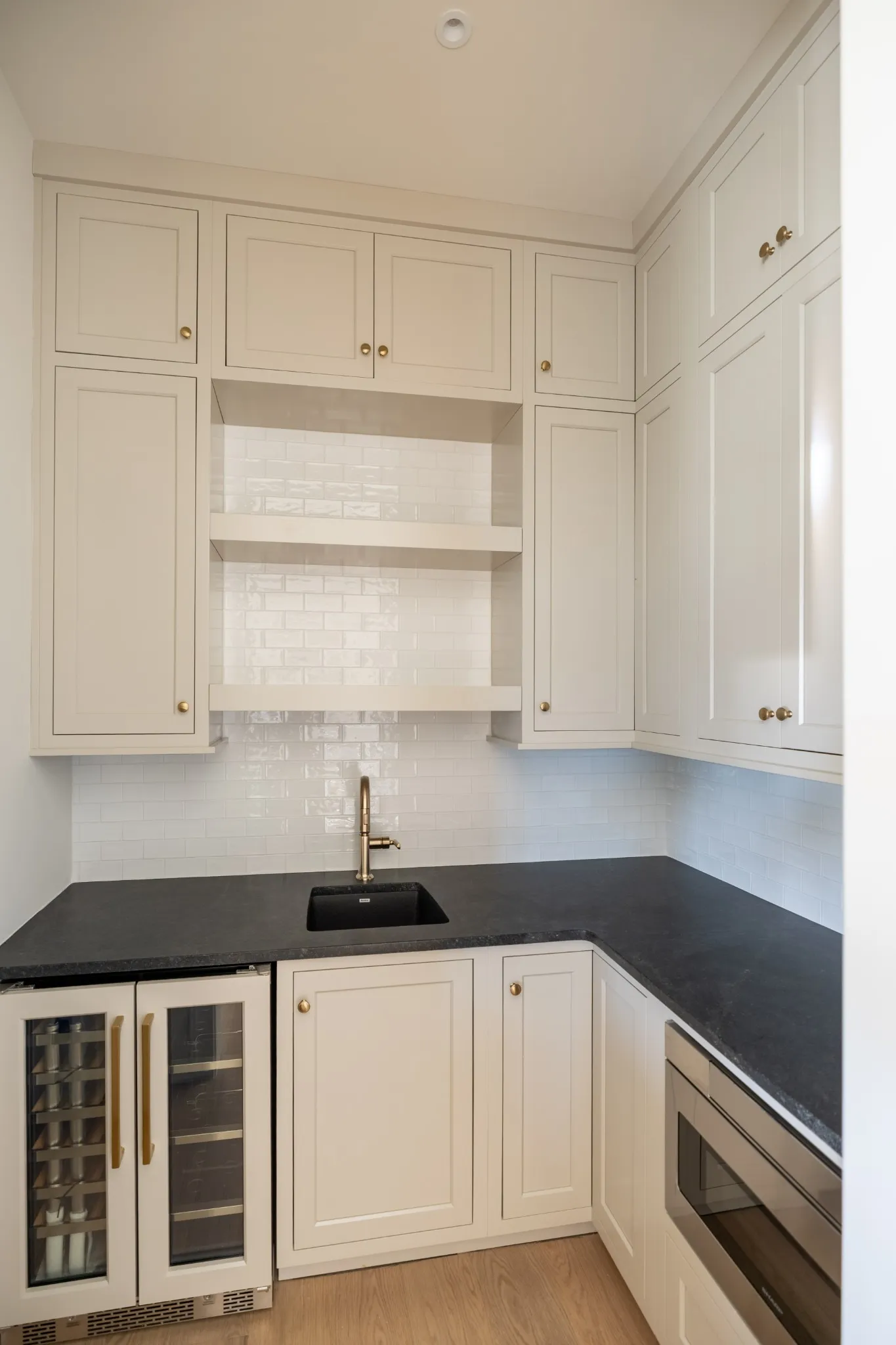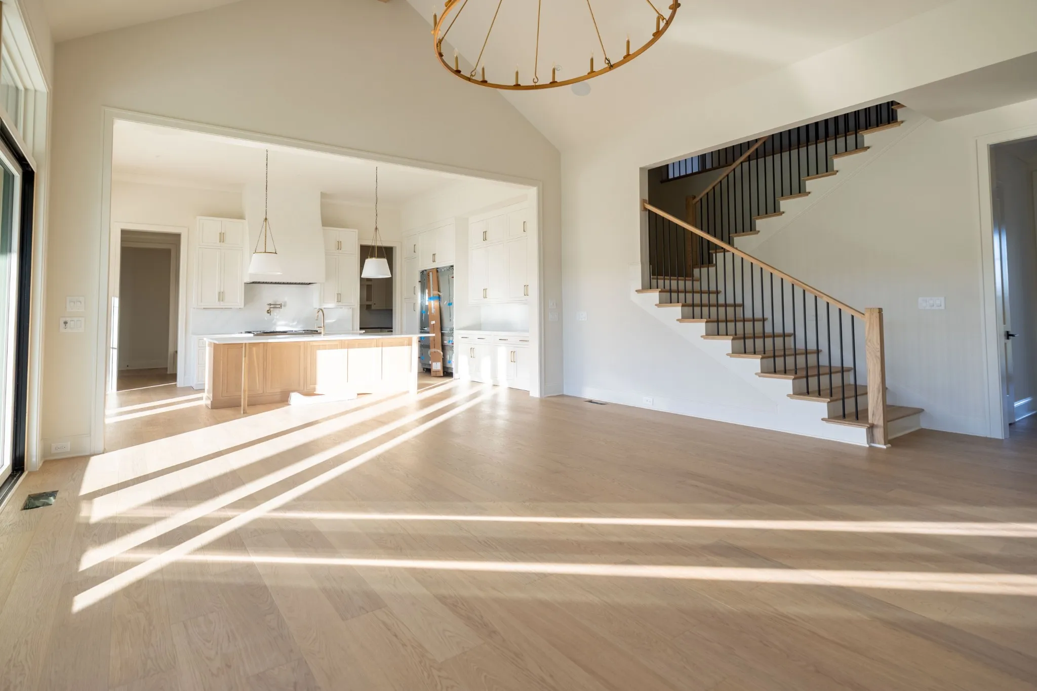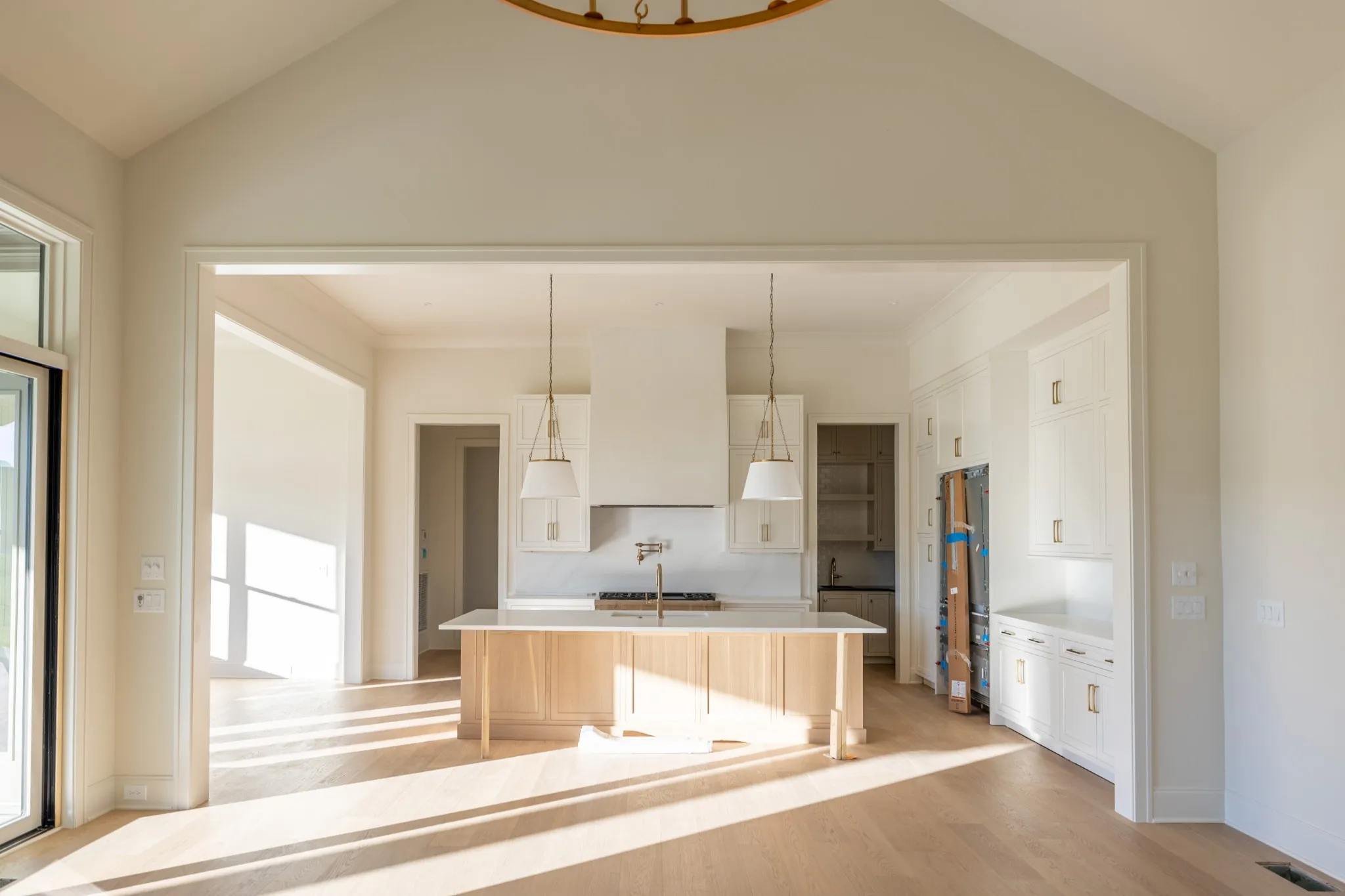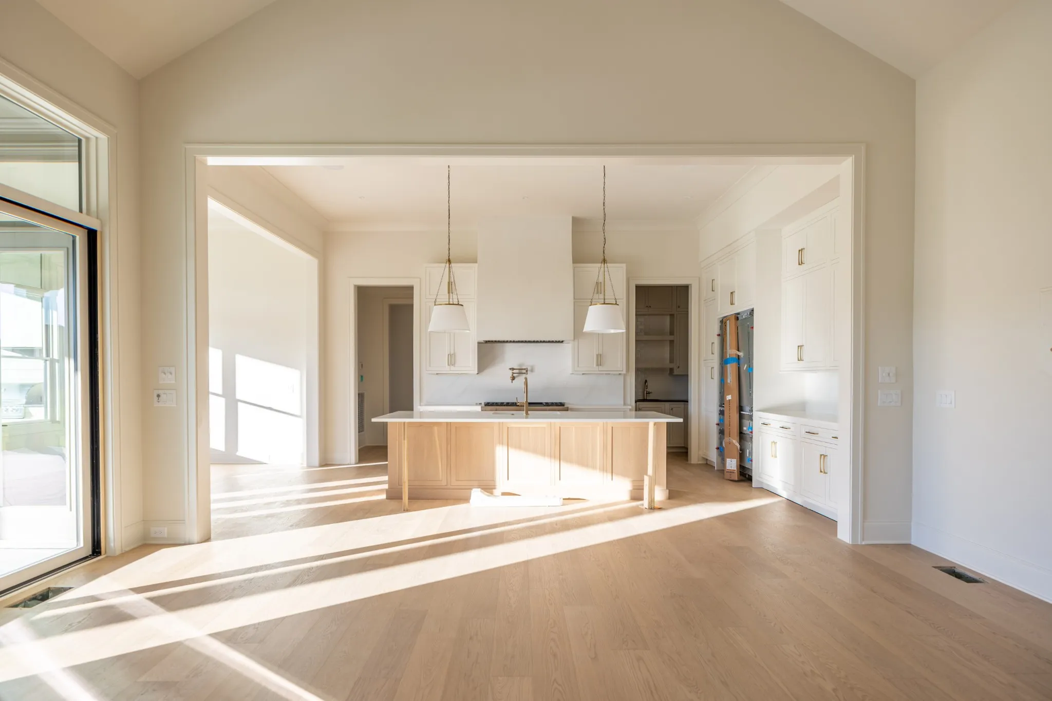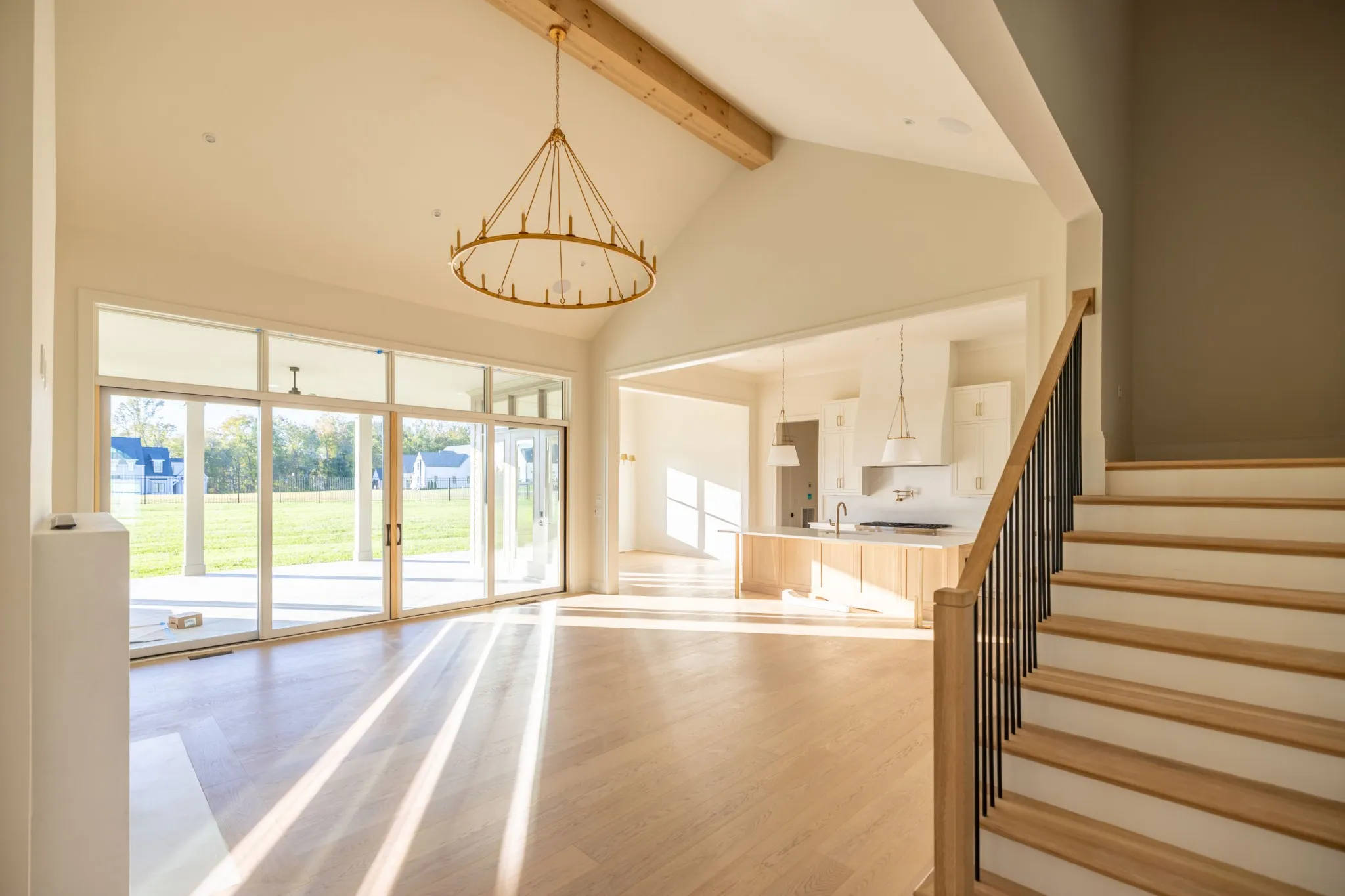 Step into a bright and open interior filled with natural light, featuring a formal dining room with floor-to-ceiling windows and a striking vaulted living room accented by wood beams, a gas fireplace, and custom built-in cabinetry. The spacious eat-in kitchen is a true showstopper, complete with ceiling-height custom cabinetry, under-cabinet lighting, a large center island, and a walk-in pantry with custom shelving—conveniently connected to a designer wet bar with beverage cooler.