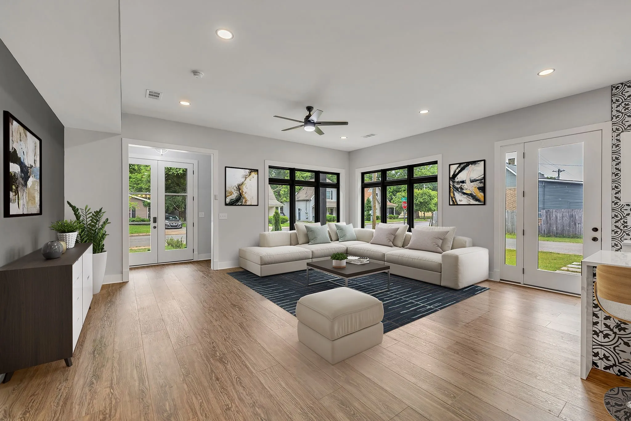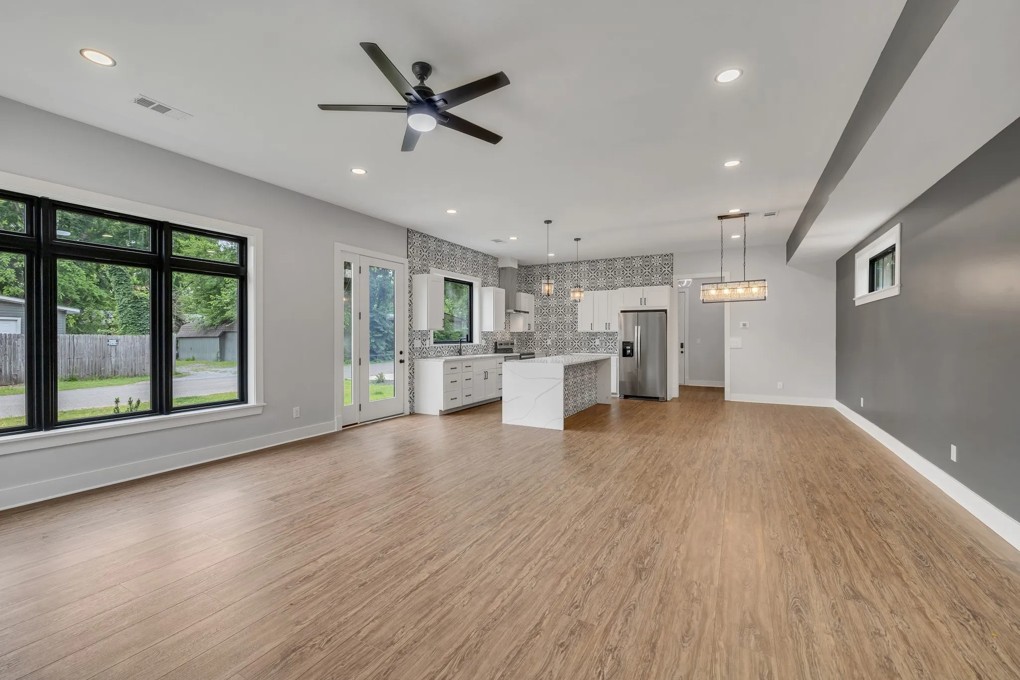 Step inside to an expansive open-concept floor plan boasting four spacious bedrooms and three and a half luxurious bathrooms. The chef’s kitchen is a showstopper with a quartz extended island, custom tall cabinets, modern hardware finishes, and stainless steel appliances—perfect for entertaining. Oversized storm-rated windows flood the home with natural light, highlighting the rich hardwood floors throughout.