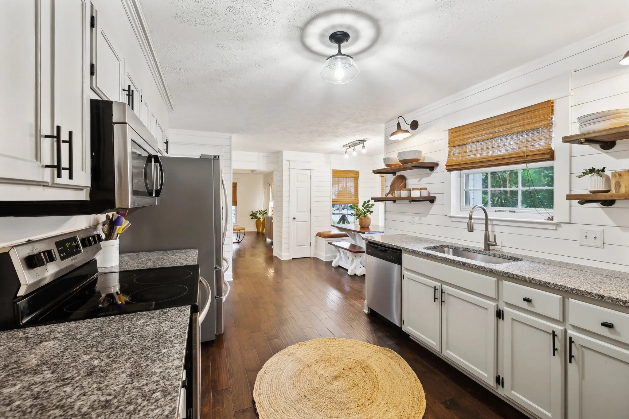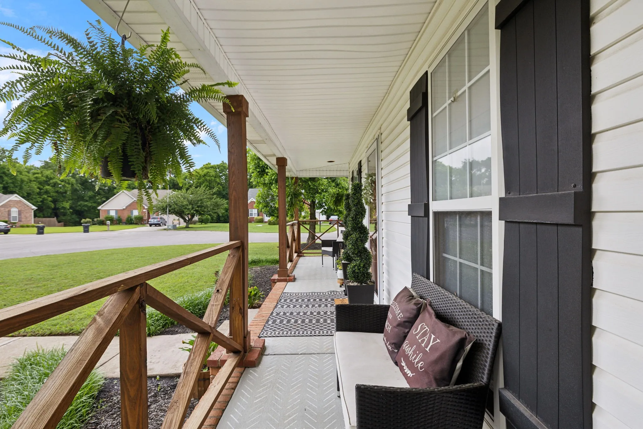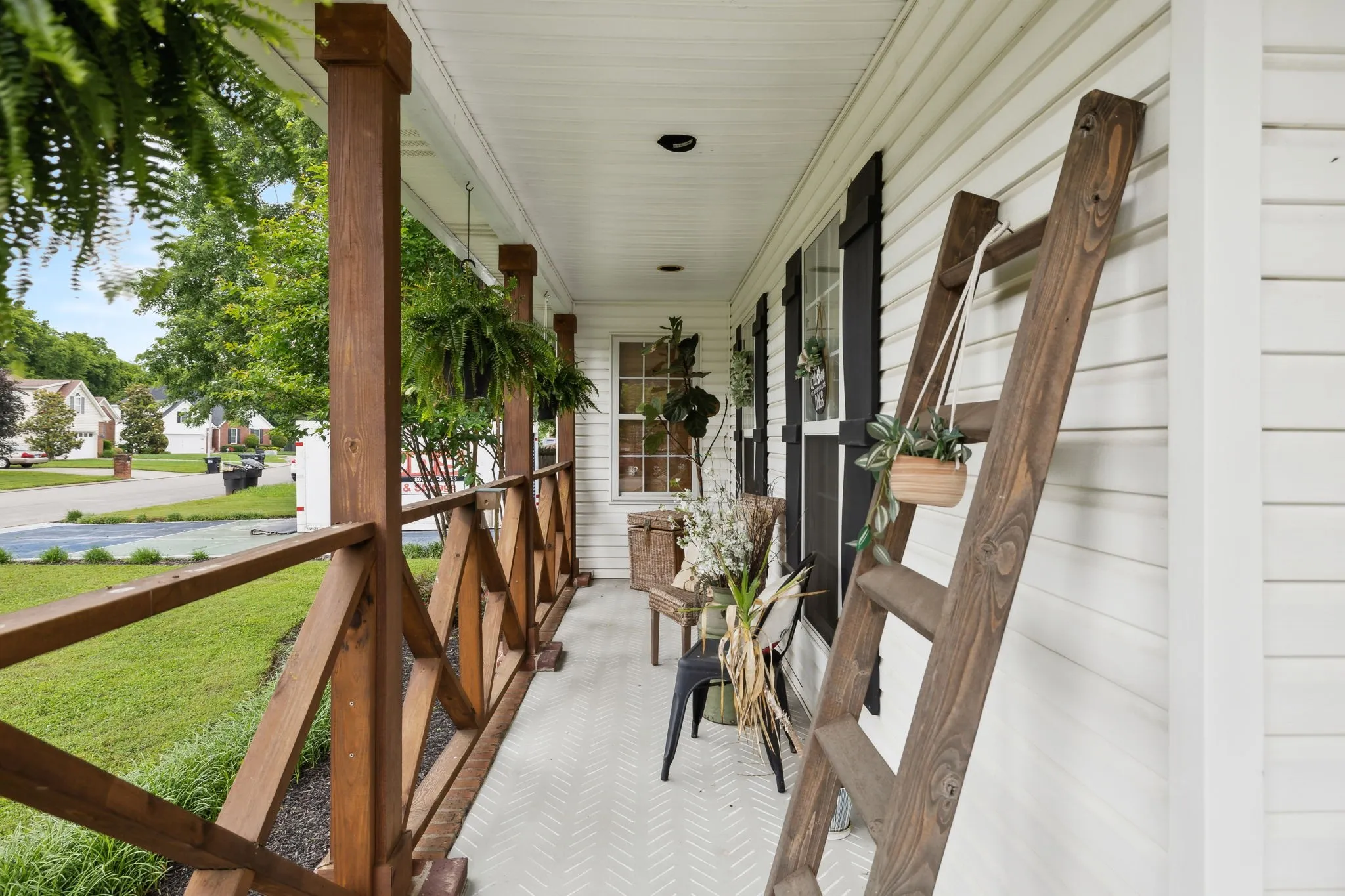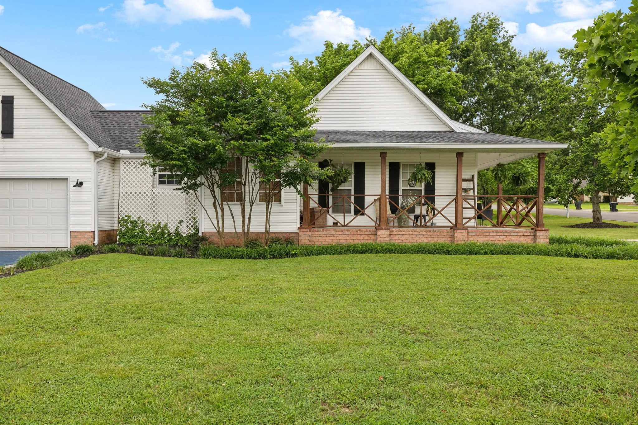 Show stopper on a corner lot! The wrap around, covered front porch is the perfect spot to relax. Roof NEW 2025, HVAC NEW 2025, Gutters NEW 2025! One level living with an upstairs bonus room/fourth bedroom with a half bath. 5 inch engineered hardwood floors. New landscaping 2025. Fully fenced in back yard. Very large storage shed accessing back yard. The custom built in table and benches in the eat in kitchen will be a new favorite place to gather each day. Side entry two car garage. Driveway is a Pickleball Court! Gorgeous updates and details throughout! Newly painted and ready for you to make this house your HOME!