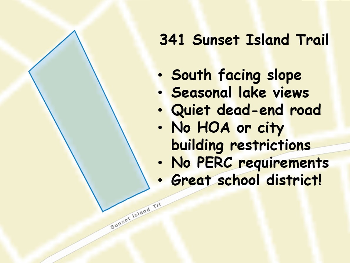 - Directions: Head south on Douglas Bend Rd., continue straight onto Bayview Dr., turn left onto Sunset Island Trail, Lot will be on the left (north side of Sunset Island Trail).