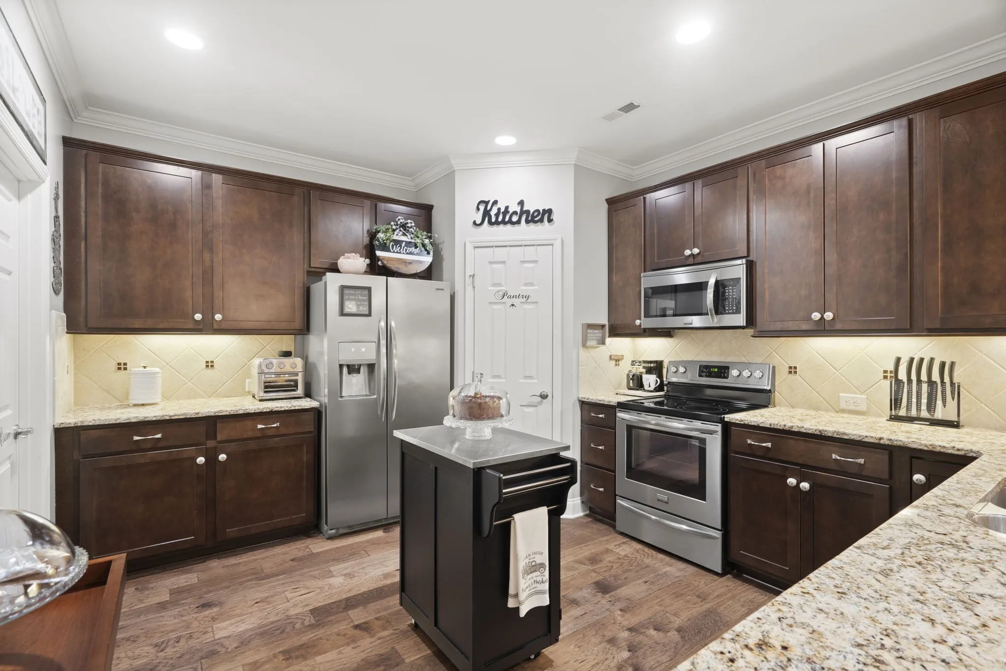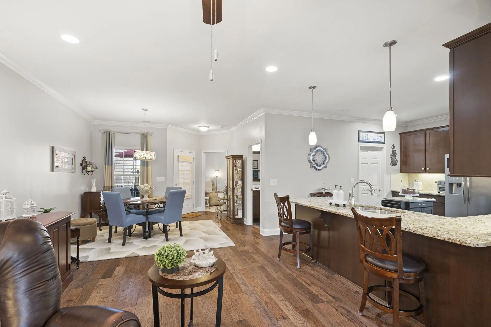 Agent offering 1 year warranty with full price offer. This charming 2-bedroom, 2-bathroom home with a 2-car garage is ideal for downsizing. With 9-foot ceilings in both the living room and primary bedroom, the space feels open and inviting. The home boasts elegant crown molding throughout and granite countertops in both the kitchen and bathrooms, adding a touch of luxury. Additional features include thermal film on most windows for improved energy efficiency and a trey ceiling in the primary bedroom suite. The custom satin paint, applied just two years ago, gives the home a fresh and modern look. The laminate floors and added insulation further enhance comfort and energy efficiency. The kitchen is equipped with a refrigerator, which will remain with the home, and an optional kitchen island if the buyer desires. This property offers both comfort and style, making it the perfect cozy upgraded space for modern living.