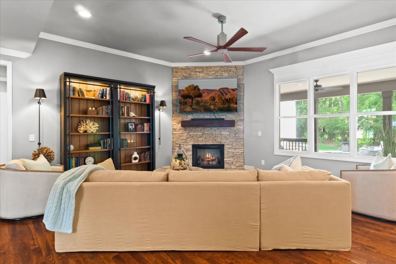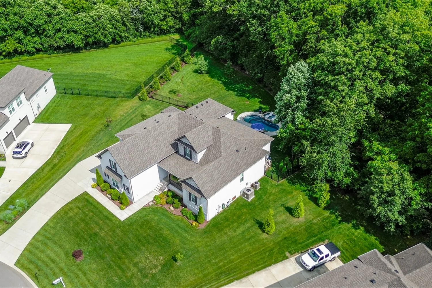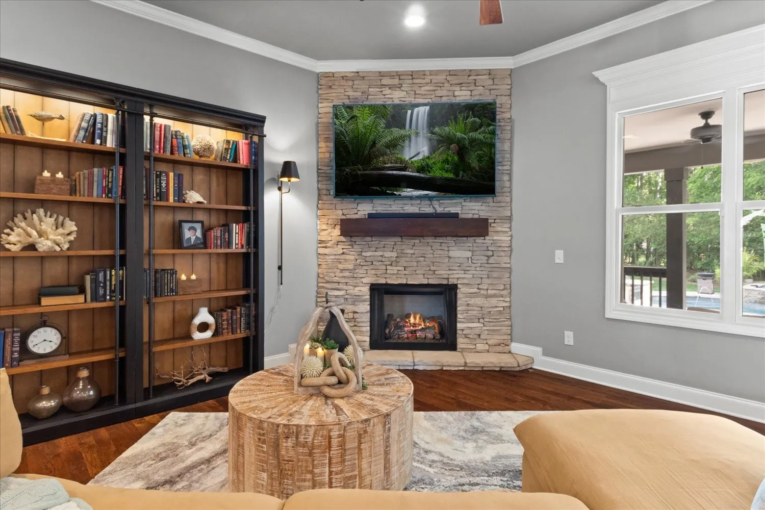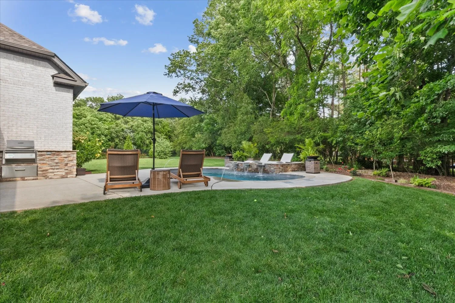 This stunning single-family home boasts an impressive 3,735 square feet of living space, situated on nearly three-quarters of an acre. With five spacious bedrooms and three and a half bathrooms, it offers ample room for comfortable living. There is plenty of parking available with an over-sized concrete driveway and a three-car garage. The private, fenced backyard is a true oasis, featuring accent lighting in beautifully landscaped areas, a free-form heated pool complete with built-in loungers and a waterfall, and gas accent lighting beside the loungers. The generous covered porch is perfect for entertaining, complete with a gas fireplace and an outdoor kitchen. Inside, the kitchen has a large center island, a gas cooktop, a double oven, a walk-in pantry, and plenty of space for entertaining guests. The living room is designed for relaxation, with a cozy fireplace. This room flows seamlessly into the kitchen and dining spaces and provides easy access to the outdoor. The Primary suite is conveniently located on the main level and includes its own fireplace, while the luxurious bathroom features a walk-?through shower, a soaking tub, and numerous upscale amenities. A unique aspect of the home is the downstairs en suite, which connects to an additional bedroom through a Jack and Jill bathroom. This additional bedroom, also equipped with a fireplace, can serve as a?n office or hobby space. Upstairs, you’ll find a bonus room and two more bedrooms, providing even more flexibility. Custom cabinets and exquisite woodwork throughout the home add a touch of elegance and craftsmanship. This property is a perfect blend of luxury and functionality, ideal for both relaxation and entertainment.