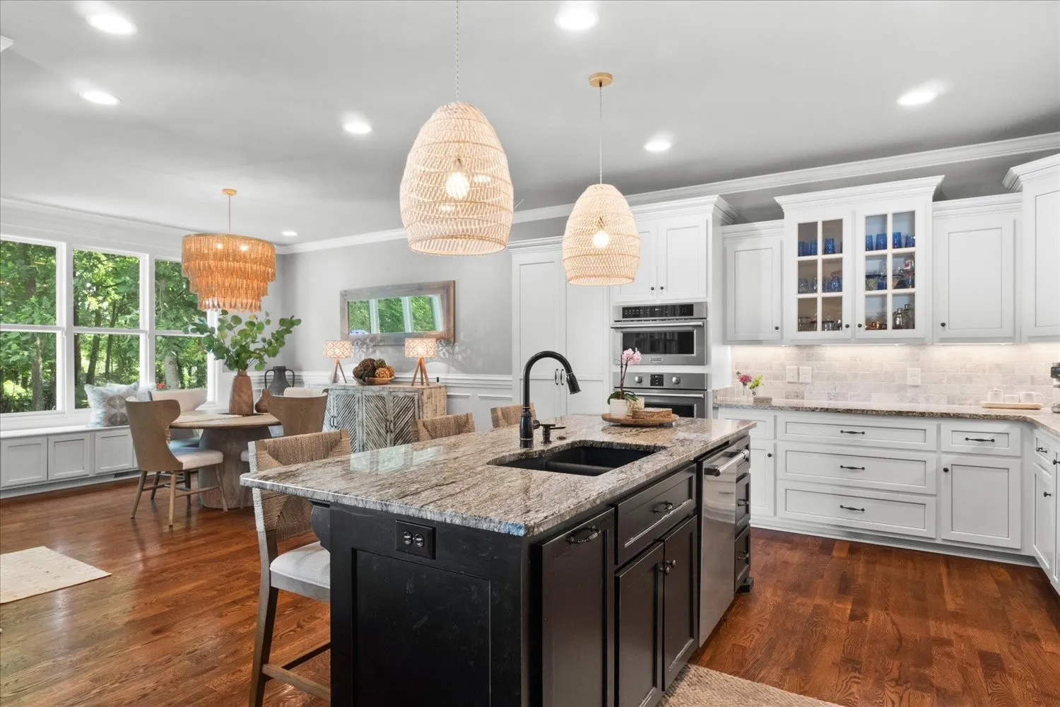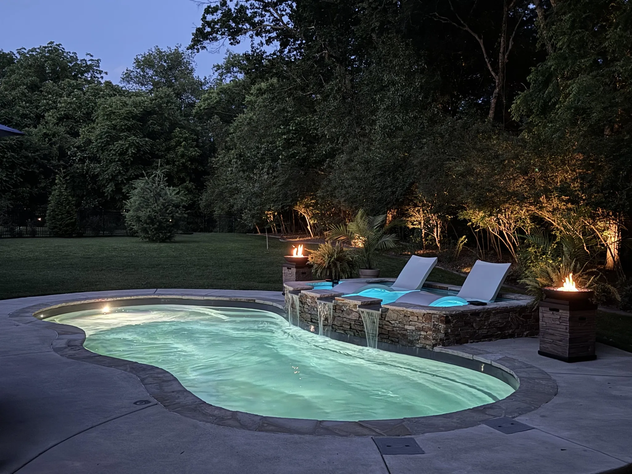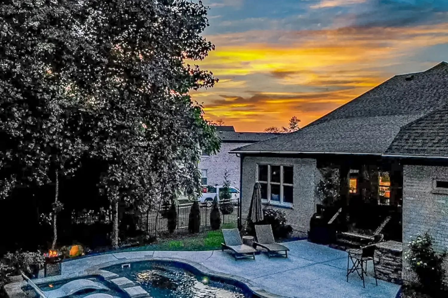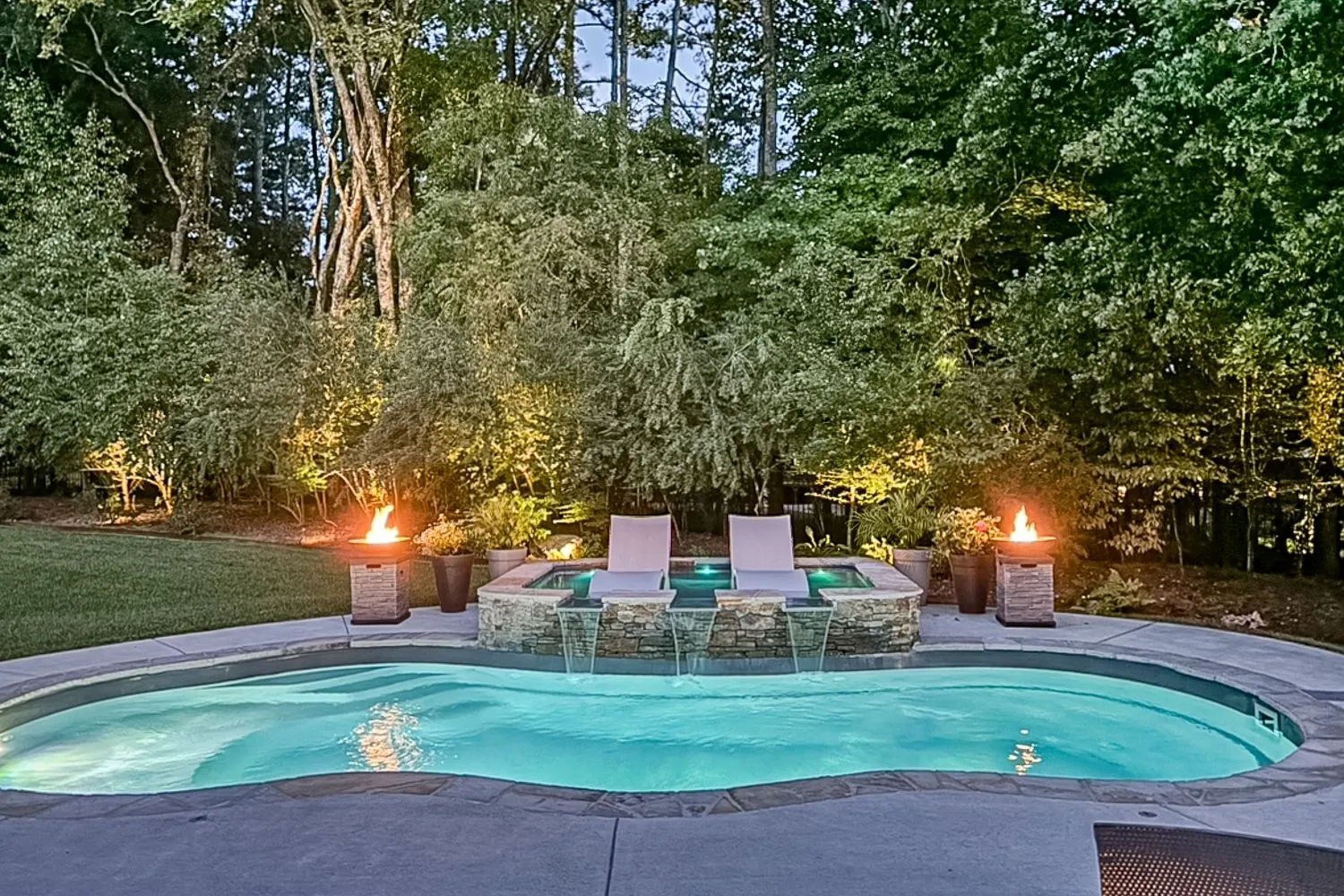 This stunning single-family home boasts an impressive 3,735 square feet of living space, situated on nearly three-quarters of an acre. With five spacious bedrooms and three and a half bathrooms, it offers ample room for comfortable living. There is plenty of parking available with an over-sized concrete driveway and a three-car garage. The private, fenced backyard is a true oasis, featuring accent lighting in beautifully landscaped areas, a free-form heated pool complete with built-in loungers and a waterfall, and gas accent lighting beside the loungers. The generous covered porch is perfect for entertaining, complete with a gas fireplace and an outdoor kitchen. Inside, the kitchen has a large center island, a gas cooktop, a double oven, a walk-in pantry, and plenty of space for entertaining guests. The living room is designed for relaxation, with a cozy fireplace. This room flows seamlessly into the kitchen and dining spaces and provides easy access to the outdoor. The Primary suite is conveniently located on the main level and includes its own fireplace, while the luxurious bathroom features a walk-?through shower, a soaking tub, and numerous upscale amenities. A unique aspect of the home is the downstairs en suite, which connects to an additional bedroom through a Jack and Jill bathroom. This additional bedroom, also equipped with a fireplace, can serve as a?n office or hobby space. Upstairs, you’ll find a bonus room and two more bedrooms, providing even more flexibility. Custom cabinets and exquisite woodwork throughout the home add a touch of elegance and craftsmanship. This property is a perfect blend of luxury and functionality, ideal for both relaxation and entertainment.