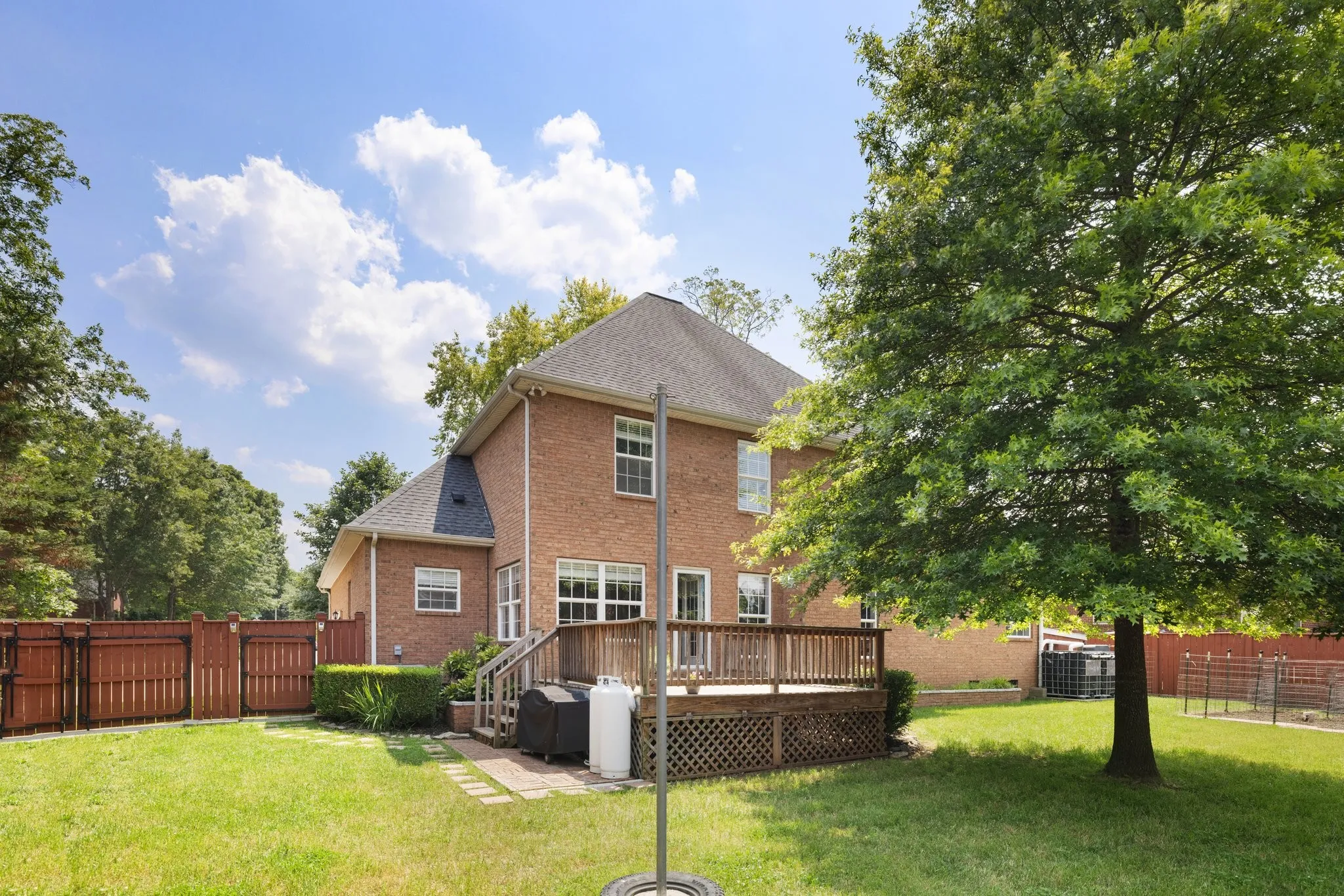 Tucked in a quiet, established neighborhood, this all-brick home features fresh paint, new hardwood floors in living and dining rooms, new carpet throughout and a water filtration system. The eat-in kitchen has been beautifully updated with quartz countertops, SS appliances, black cabinets, a stove that vents outside of the home, and a center island. The main-level primary suite offers convenience and a gorgeous tiled shower, while upstairs you’ll find spacious bedrooms, oversized closets, and a very large bonus room. Enjoy a fully fenced backyard with a deck for grilling and a garden space ready to grow. There are two rain water harvesting containers to provide irrigation to your garden! With ample storage and a smart layout, this home blends comfort, space, and location.