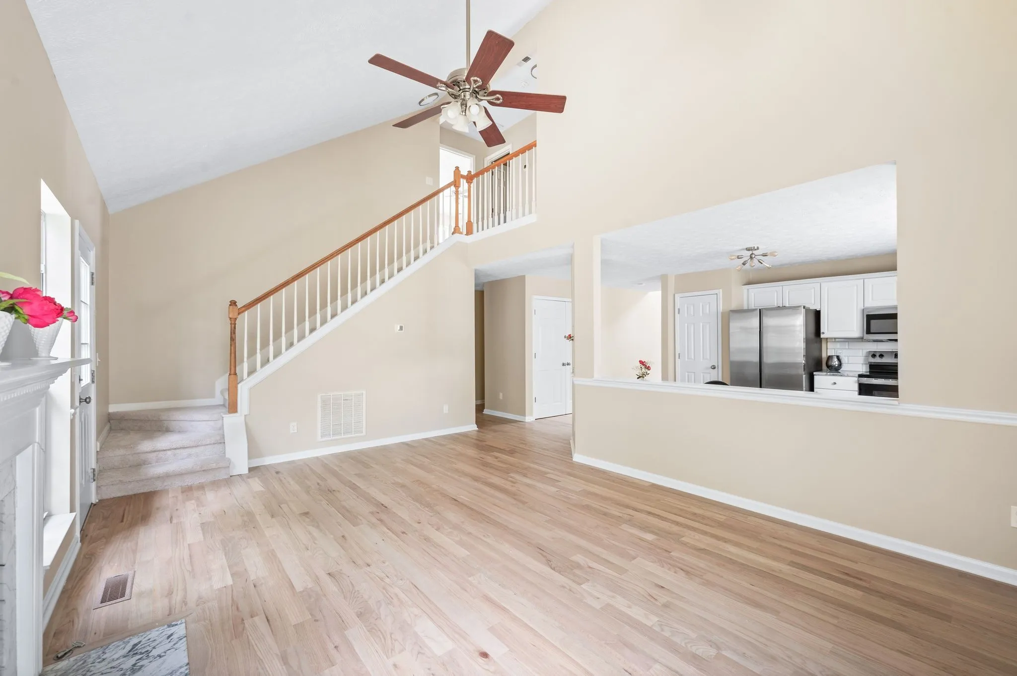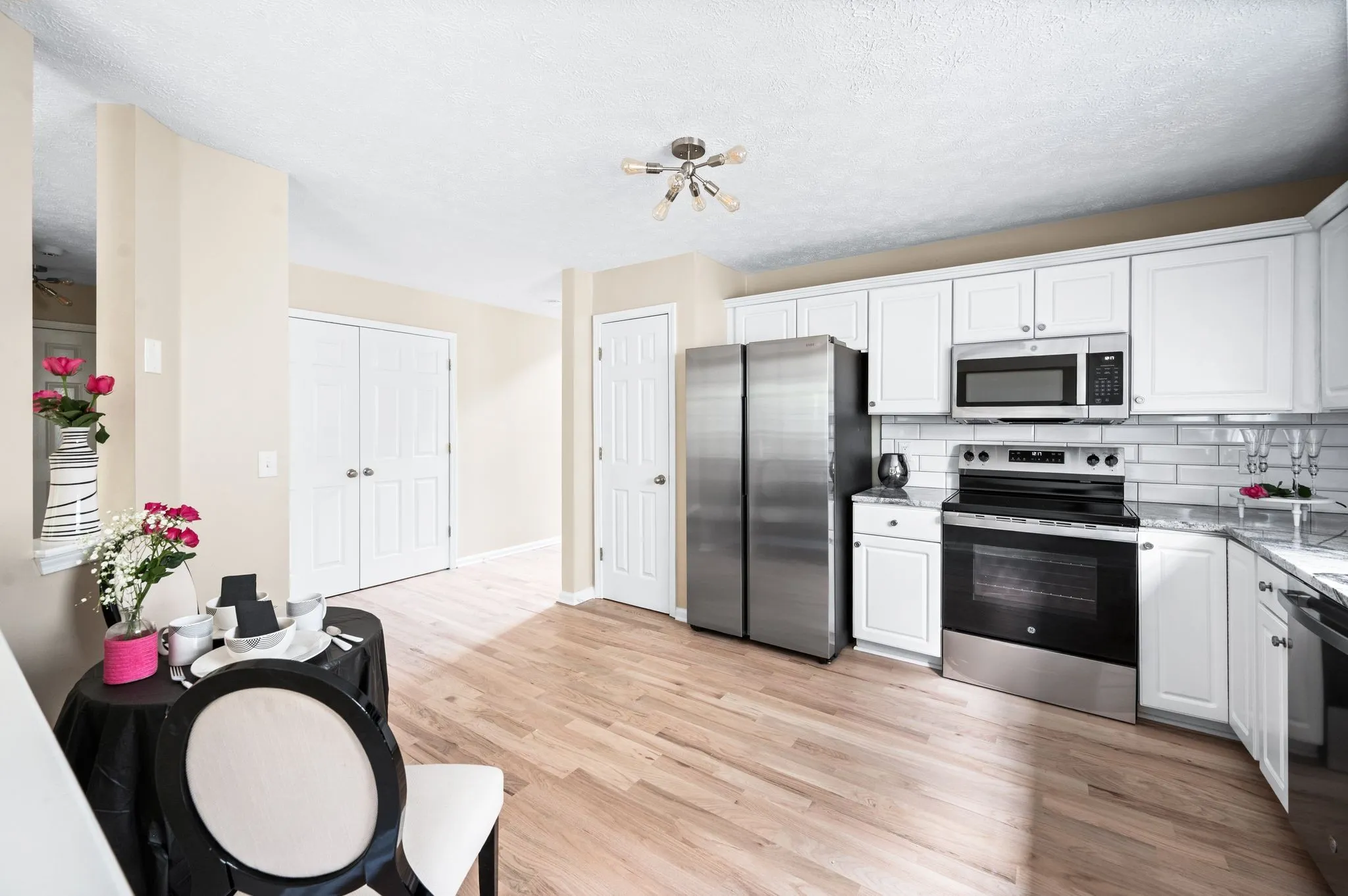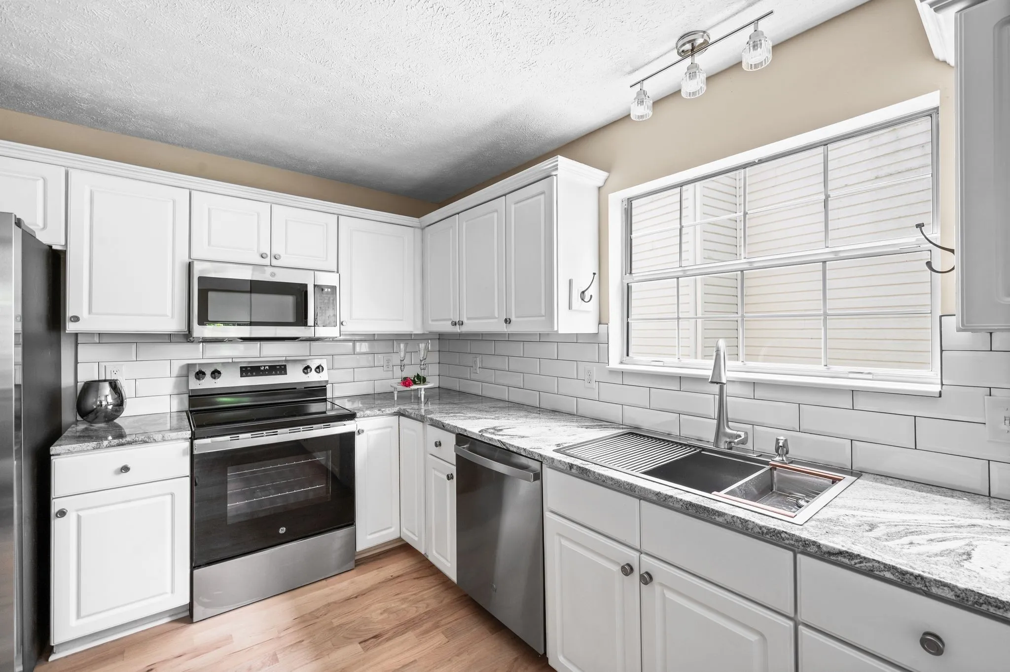 This spacious home has new: hardwood floors, new GE appliances, new carpet, new lights, new vanities, new faucets, new ceiling fans. new lights, new custom kitchen tiled backsplash, new mailbox, new back door and new paint inside including garage. \n