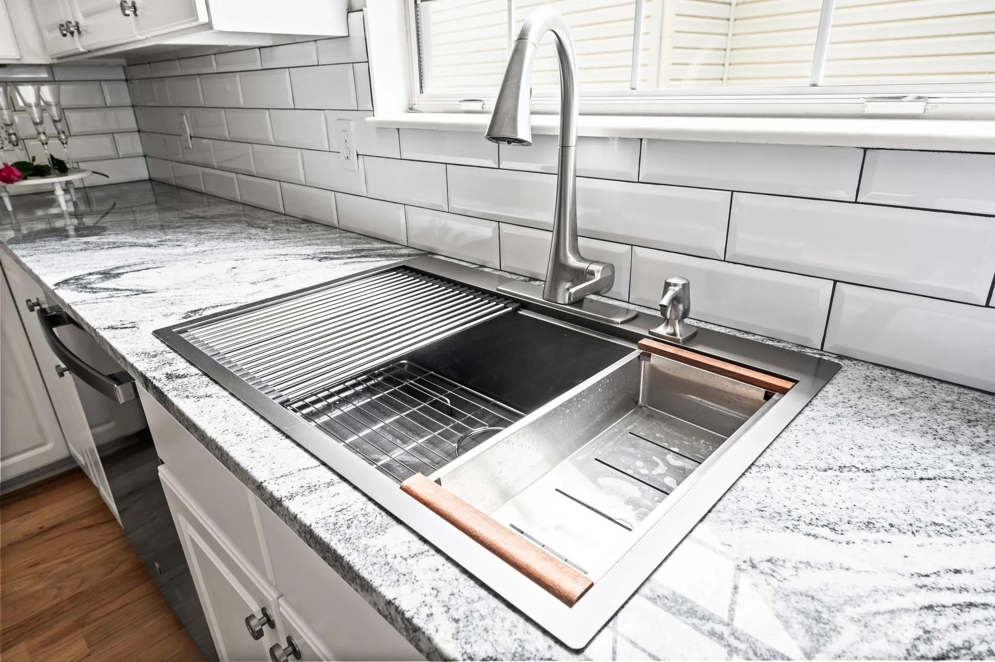 "LongDescription" => "With its crisp white shaker cabinetry, sleek brushed nickel hardware, and elegant granite countertop, this piece brings modern luxury to life. The generous counter space, dual storage towers, and center doors offer both form and function,"