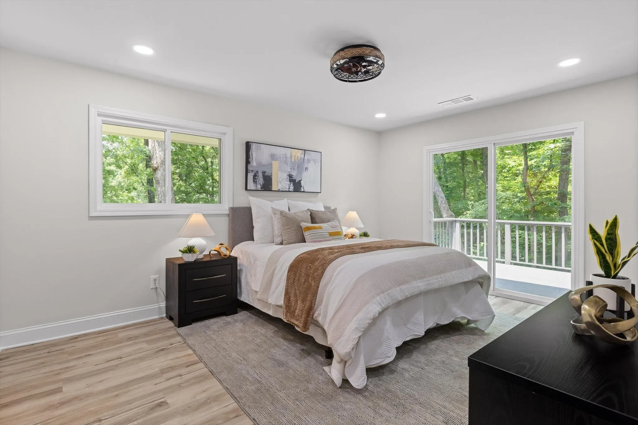 On the main level, find two generous bedrooms—including a serene primary suite with a large private deck—and a light-filled great room with fireplace that flows into an extensively updated kitchen. New cabinetry, quartz countertops, and stainless-steel appliances make cooking and gathering effortless.
