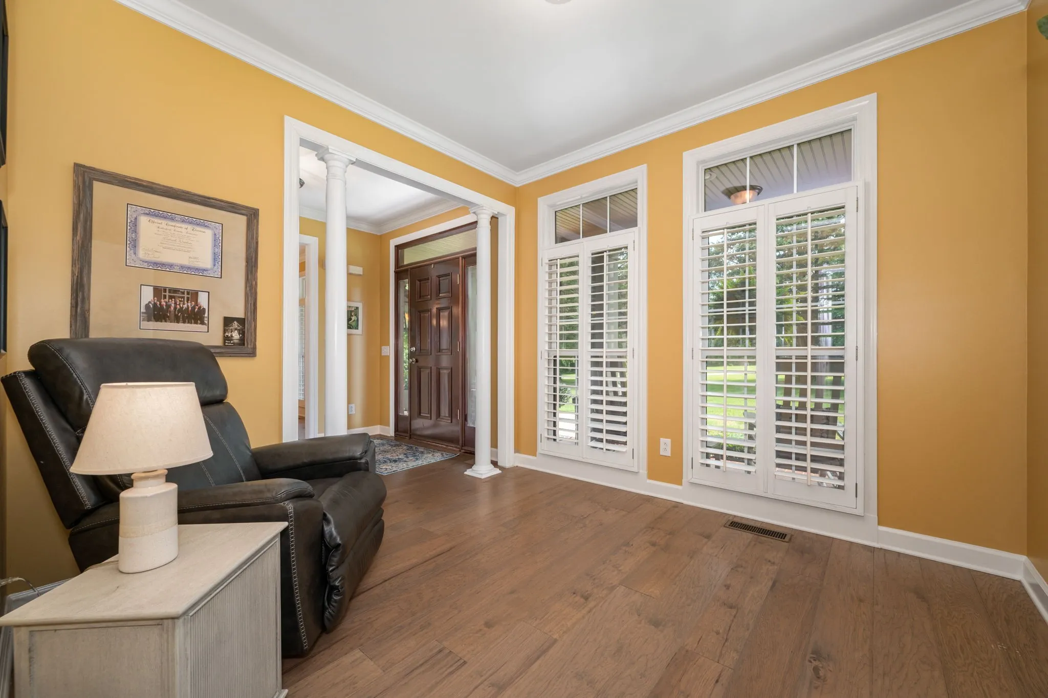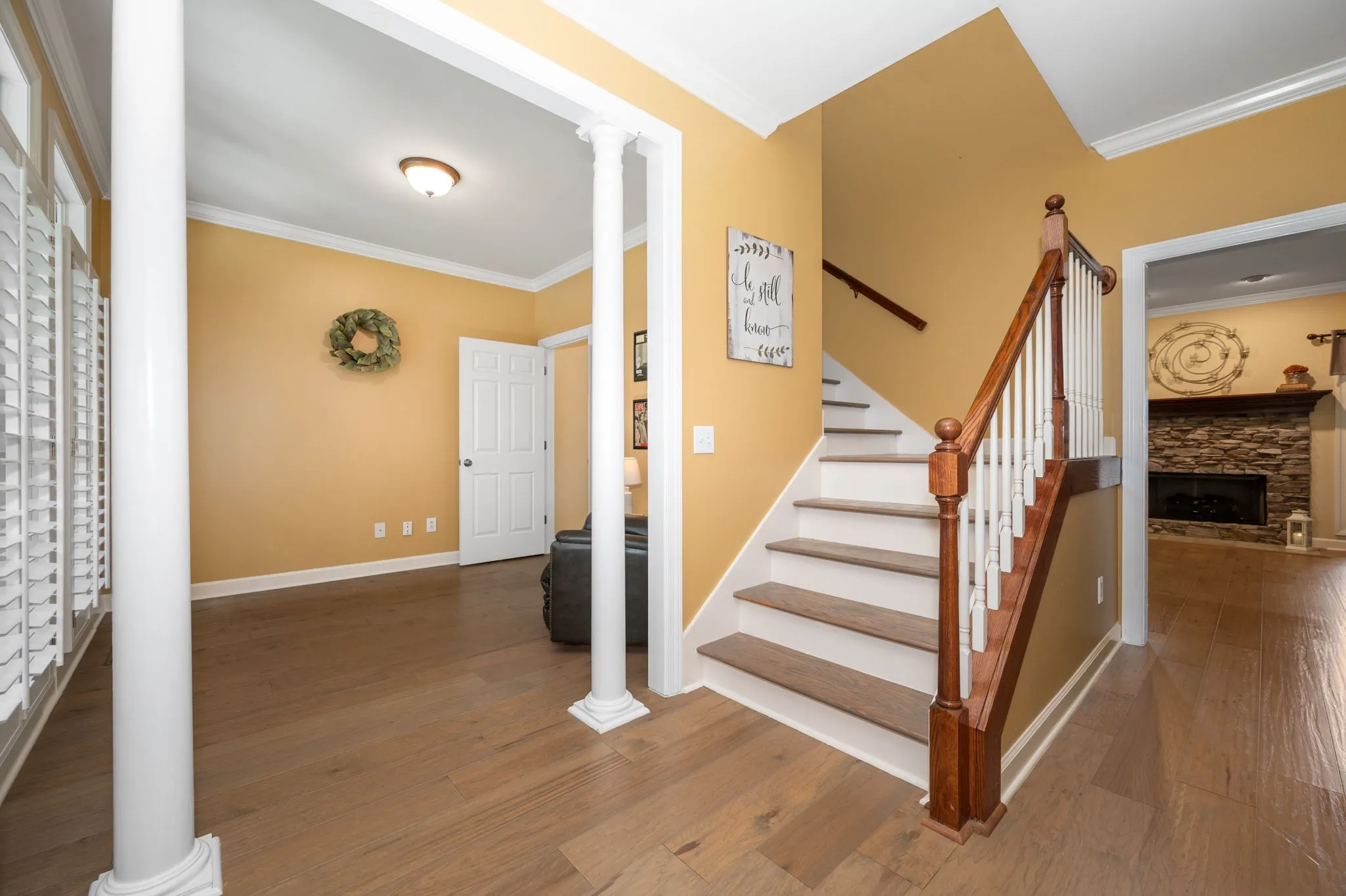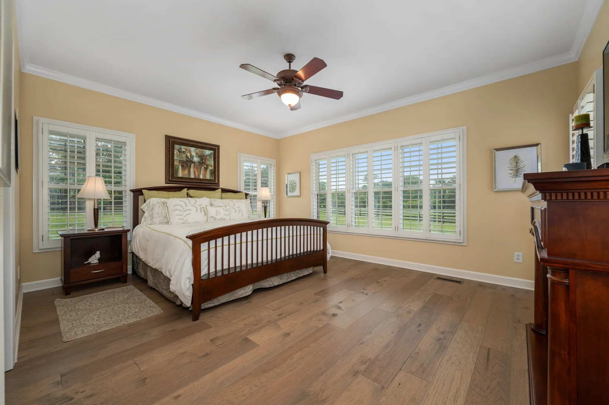 Step into a home that blends comfort, charm, and practical upgrades in all the right places—set on 5 usable acres with fenced pastures ready for your animals. Septic permit is for 3 bedrooms. Home has 4 rooms that may be used as bedrooms, but only 3 are permitted for septic use. Floorplan in pictures. Tucked away at the end of the road with no backyard neighbors, this property offers privacy galore and peaceful surroundings. A versatile 3-bay outbuilding provides plenty of room for the boat, ATVs, and your recreational gear, adding to the everyday convenience of this beautifully maintained home. /// Inside, enjoy hickory hardwoods, plantation shutters throughout, and a kitchen with double ovens and soft-close cabinets. The kitchen is designed for everyday ease and entertaining alike, featuring double ovens, soft-close cabinetry, a farmhouse sink, walk-in pantry, and durable commercial-grade flooring. New paint on all trim, doors, and ceilings just prior to listing so you’ll find no smudges or fingerprints here! /// Enjoy meals in the spacious formal dining room, then unwind on the newly added screened porch—accessible from both the kitchen and the primary bedroom. An adjacent patio offers the perfect spot for grilling and outdoor gatherings. /// The main-level primary suite offers comfort and privacy, while two upstairs bedrooms are joined by a Jack-and-Jill bath and feature built-in study nooks. New carpet upstairs was installed days before listing. The mudroom entry off the garage includes a convenient half bath, and the laundry room is well-appointed with a sink, cabinets, and hanging space. The walk-in attic provides incredible storage potential. /// Freshly painted walls and ceilings, new gutters on the back of the home, and thoughtful design throughout make this home move-in ready!