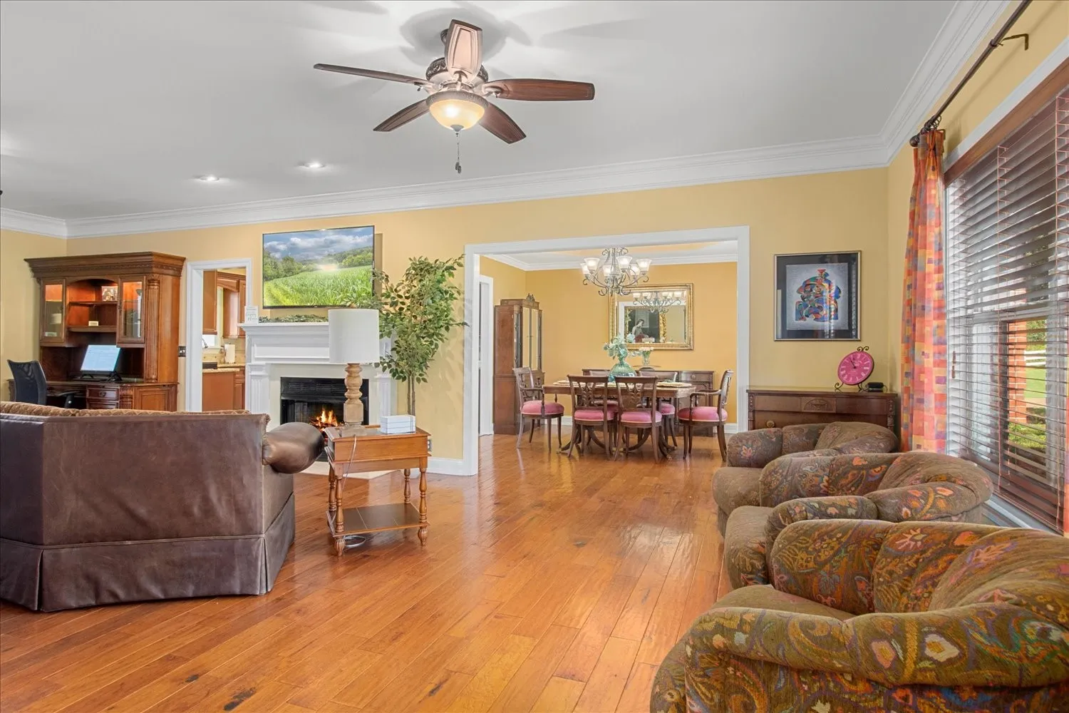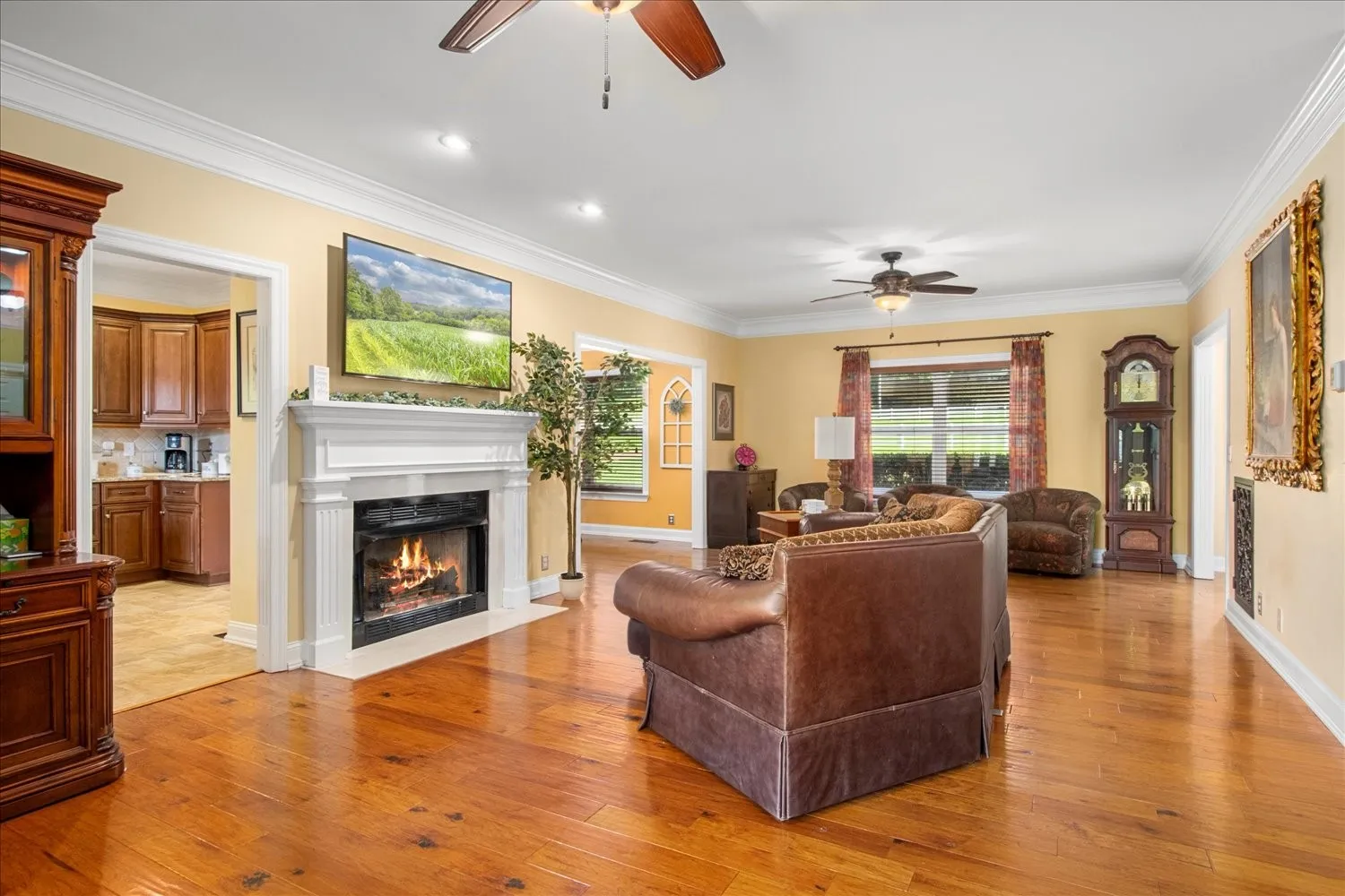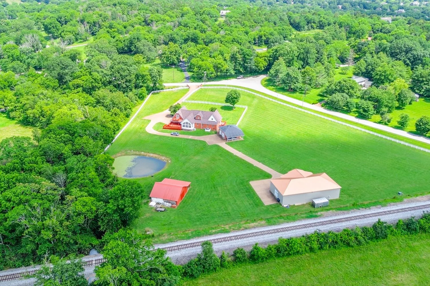 Stunning 5.75-acre estate just minutes from Historic Downtown Franklin. This 5,313 sq. ft. all-brick home offers 4 bedrooms, 3.5 baths, and two primary suites for multi-generational living. The remodeled first-floor primary bath features dual vanities and a custom tile shower. Gourmet kitchen with cherry cabinetry, granite, stainless appliances, and walk-in pantry opens to a sunroom with countryside views. Outdoor living includes tiered decks, a pond, and fenced pastures. Car enthusiasts will love the 3,400 sq. ft. climate-controlled garage/man cave with car lift, full bath, plus a 3-car detached garage and 2-car attached garage. Two-stall barn with tack room and hay loft. Recent updates: roof (2022), tankless water heater, hardwoods, built-ins, and EV supercharger.