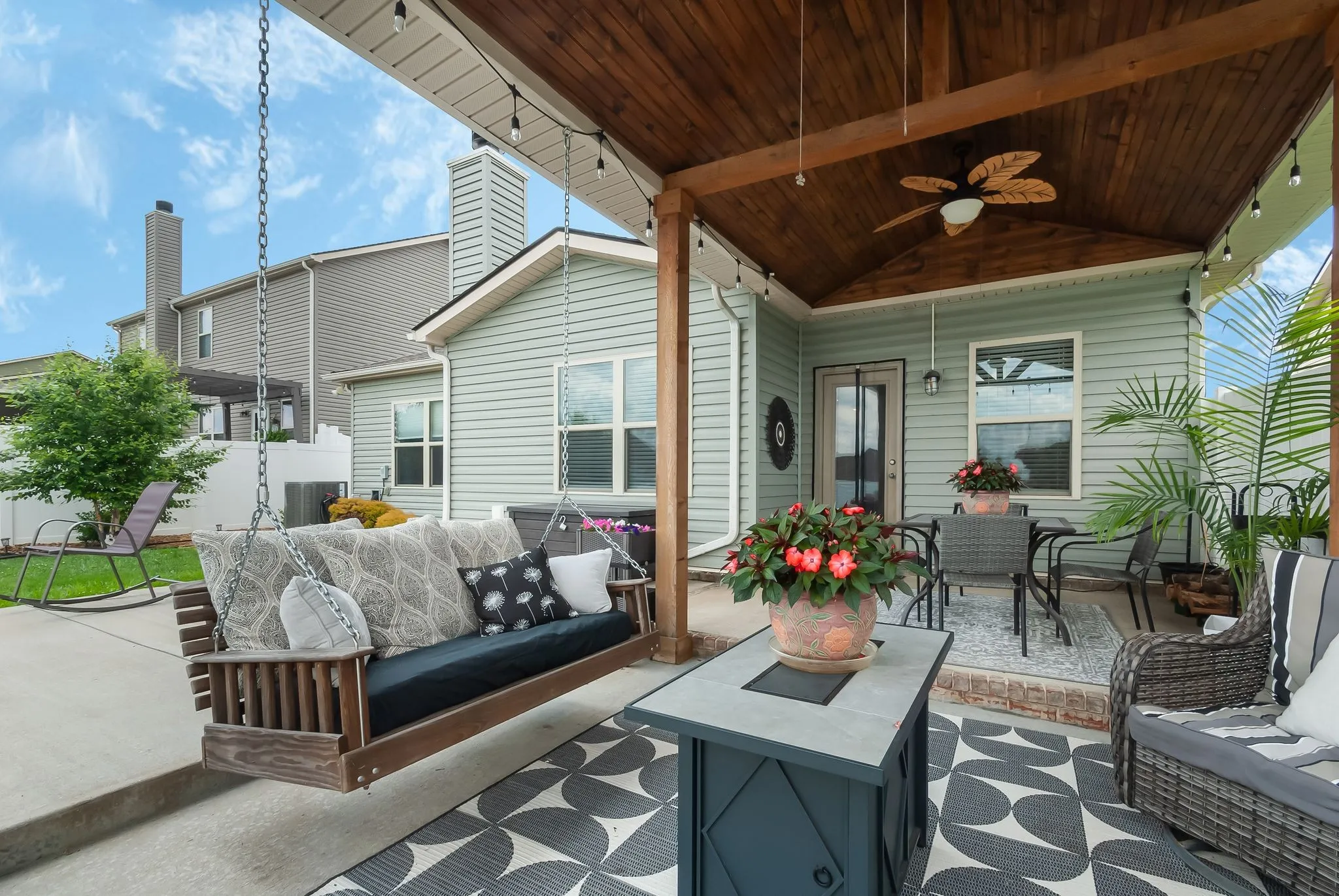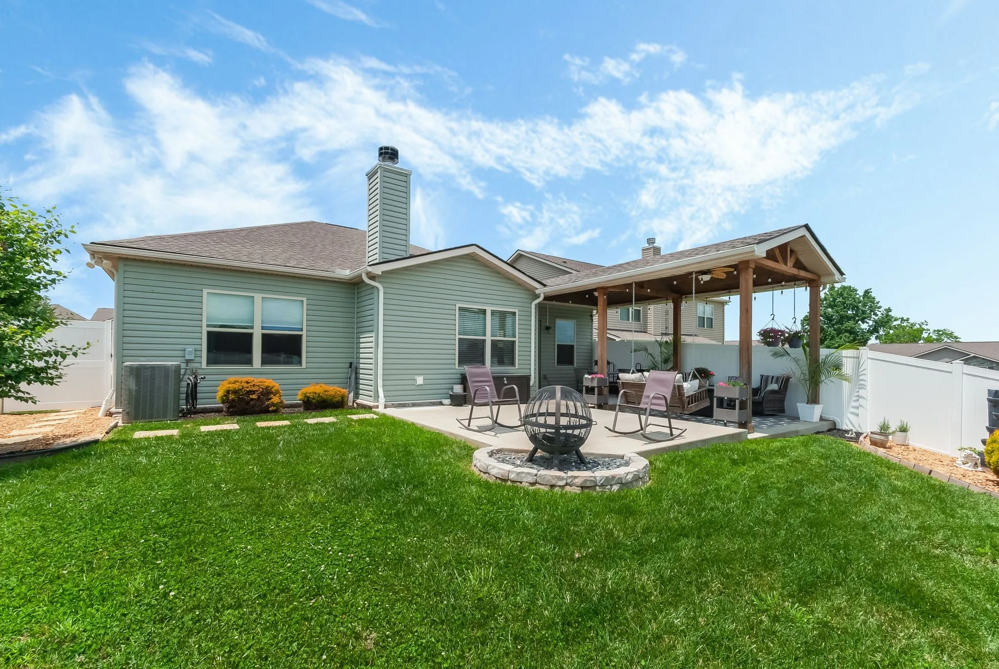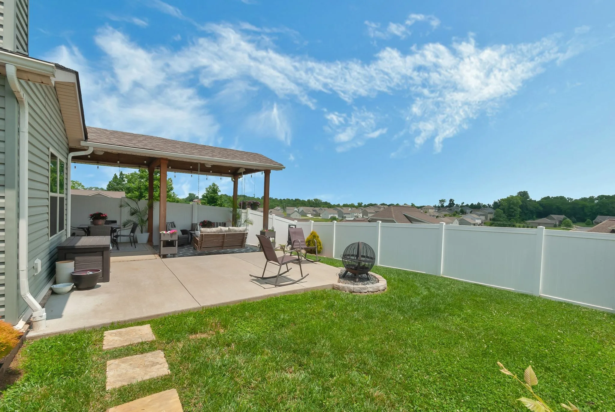 "LongDescription" => "This backyard truly has it all — a covered patio with room to lounge or dine, a cozy firepit area, and a fully fenced green space with open skies and scenic views. A perfect setup for relaxing or entertaining, day or night."