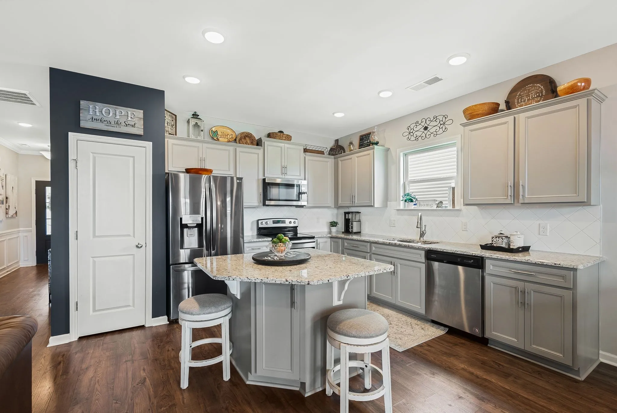 +"PublicRemarks": "One-level living with an open layout, Kitchen has granite countertops and stainless steel appliances. Island in Kitchen and a very spacious Breakfast Area overlooking your covered patio. Luxury laminate floors in the main living spaces. The cozy corner fireplace and spacious gathering room create a warm, welcoming feel, while the covered front porch adds charm. Thoughtful updates since 2021 include a covered back patio with wood ceiling and ceiling fan. New extended concrete patio for grilling and firepits, fenced back yard, new sod, new trees and rock landscaping, Primary Bedroom is separate from the other two bedrooms. Primary Bathroom has double vanities, tile floor, oversized shower and walk-in closet. Decorative wood wall in one of the bedrooms that is being used as a studio. This home is move-in ready."