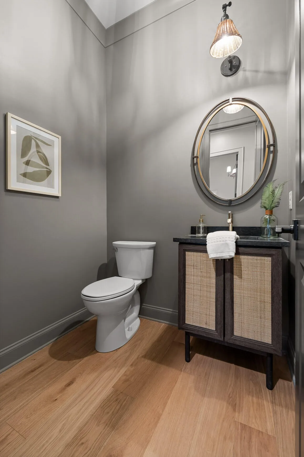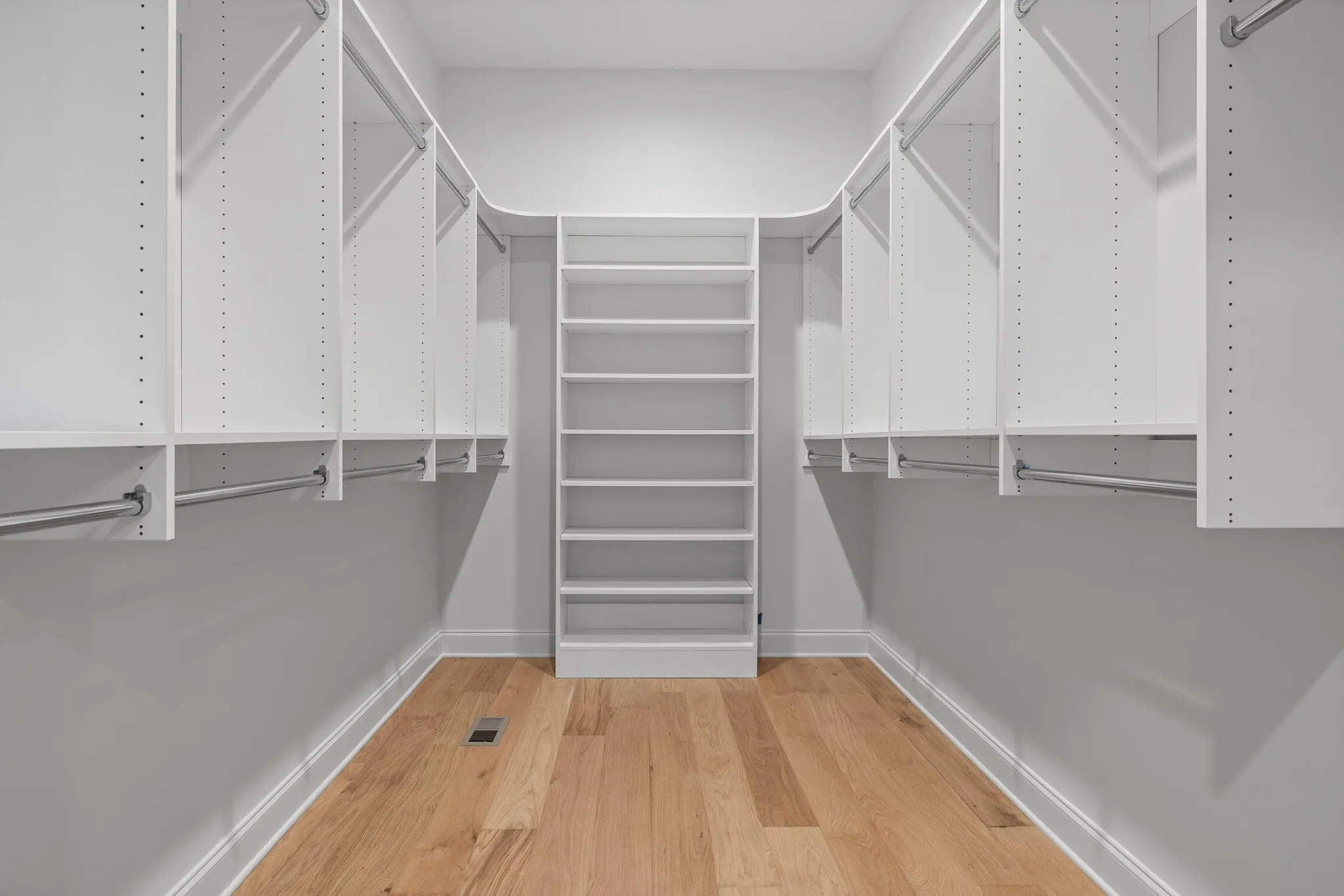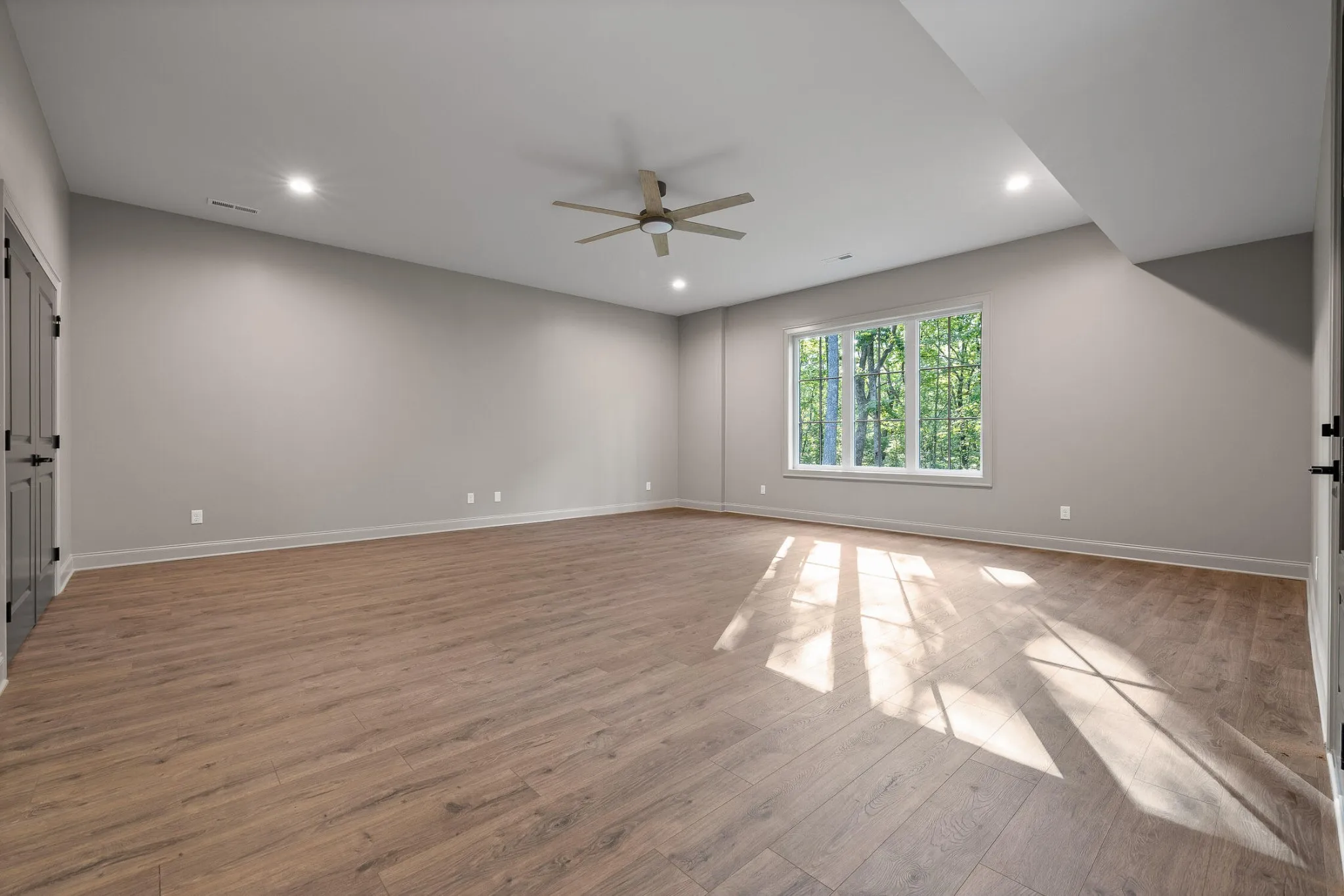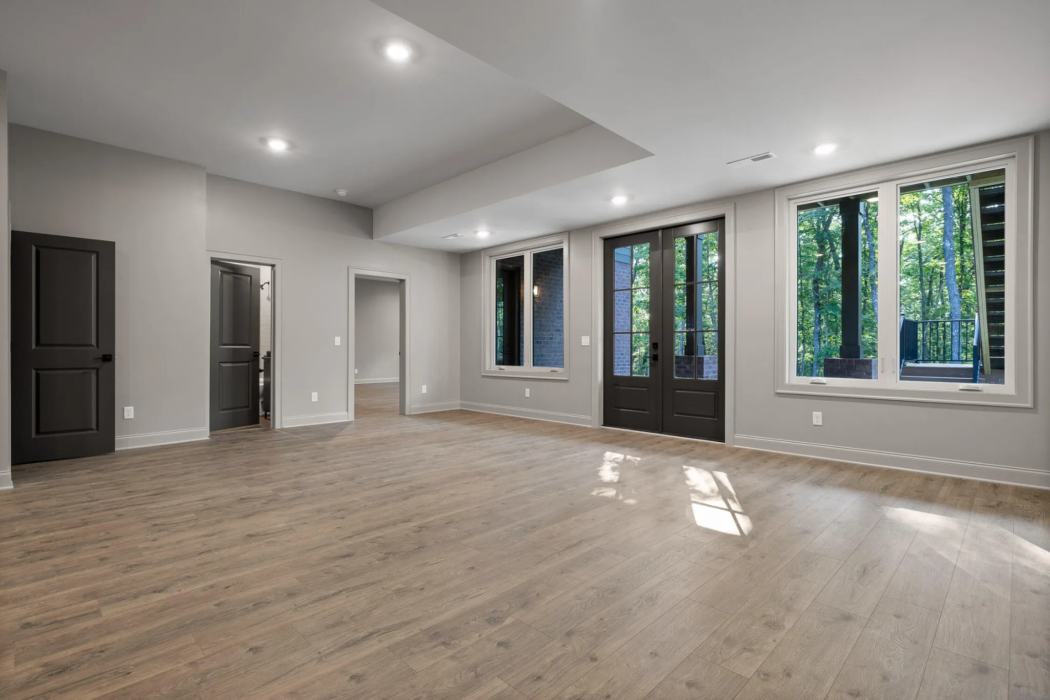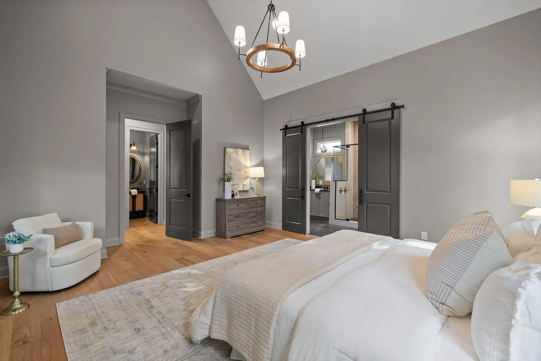 Also on the main floor is a vaulted primary suite with wood beam accents and a spa-like ensuite featuring dual floating vanities, a dual-head walk-in shower, and two walk-in closets. A designer powder room and a custom laundry space complete the level.