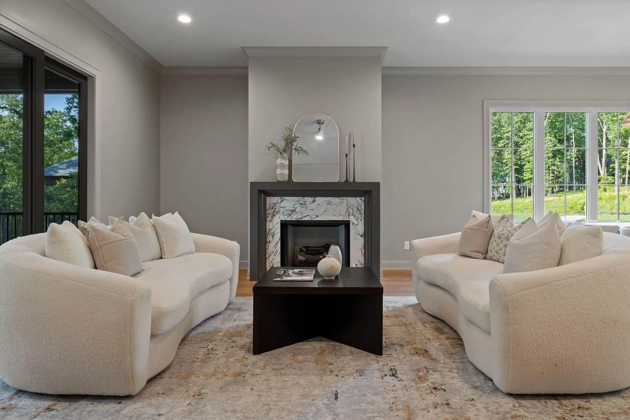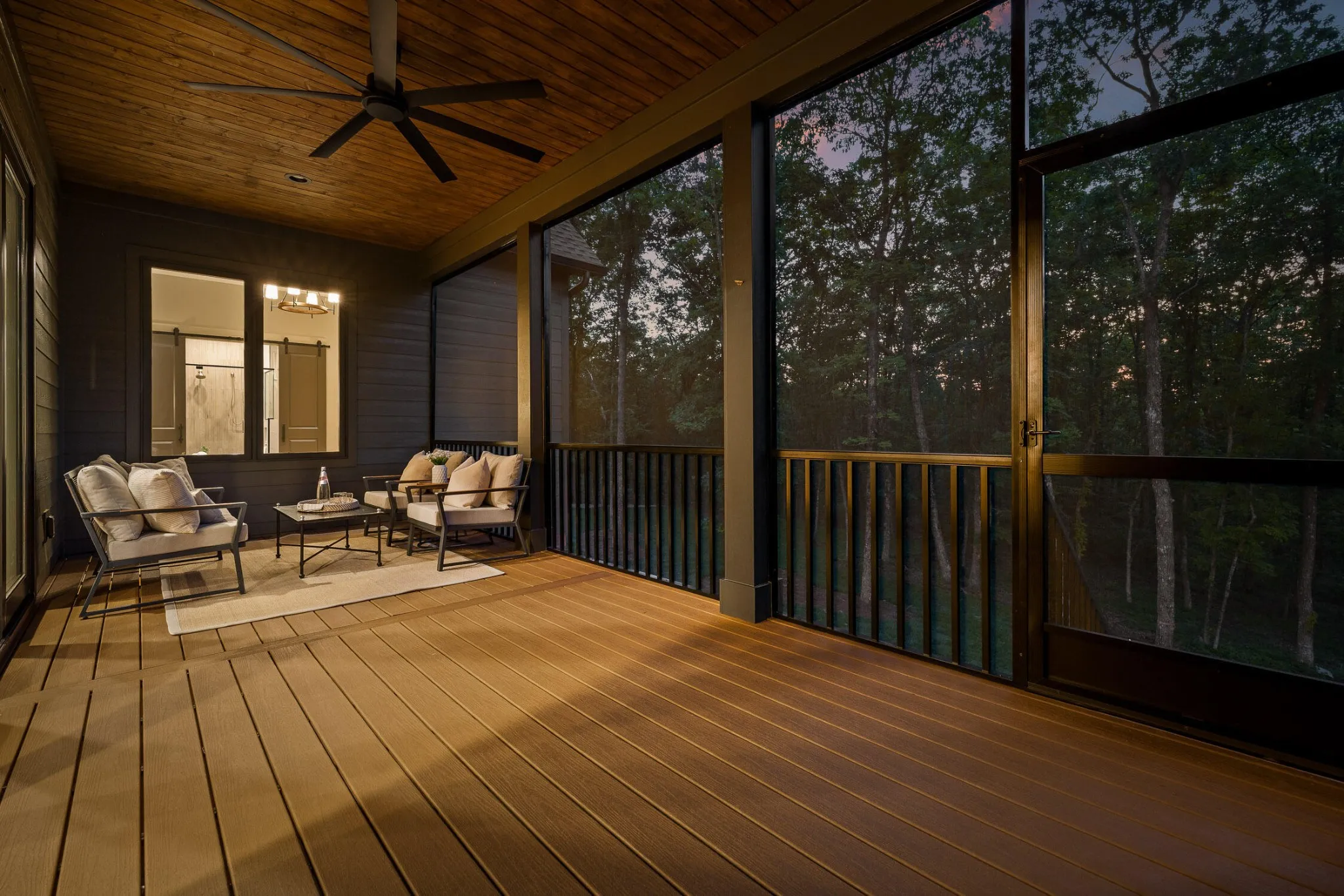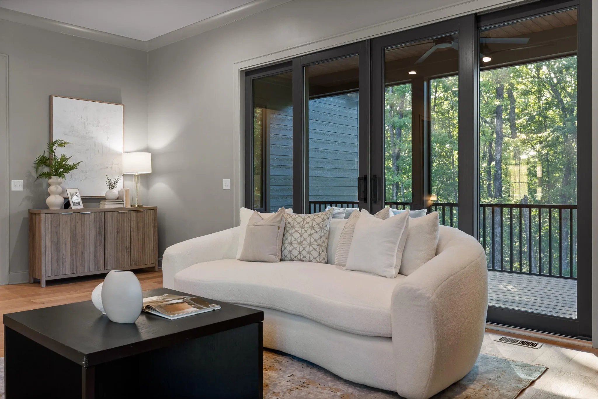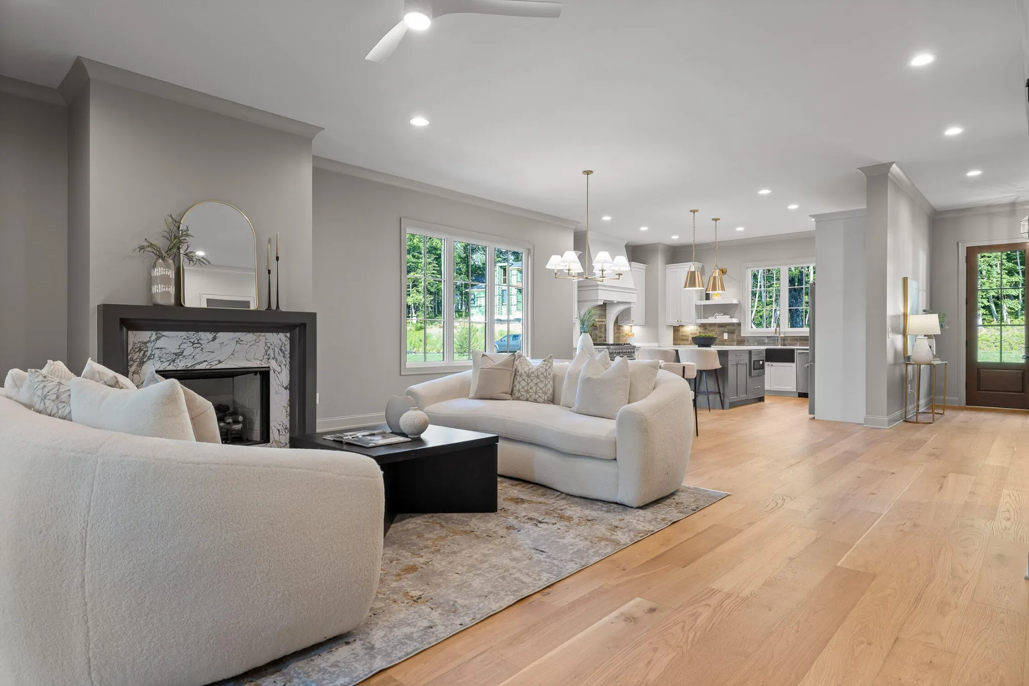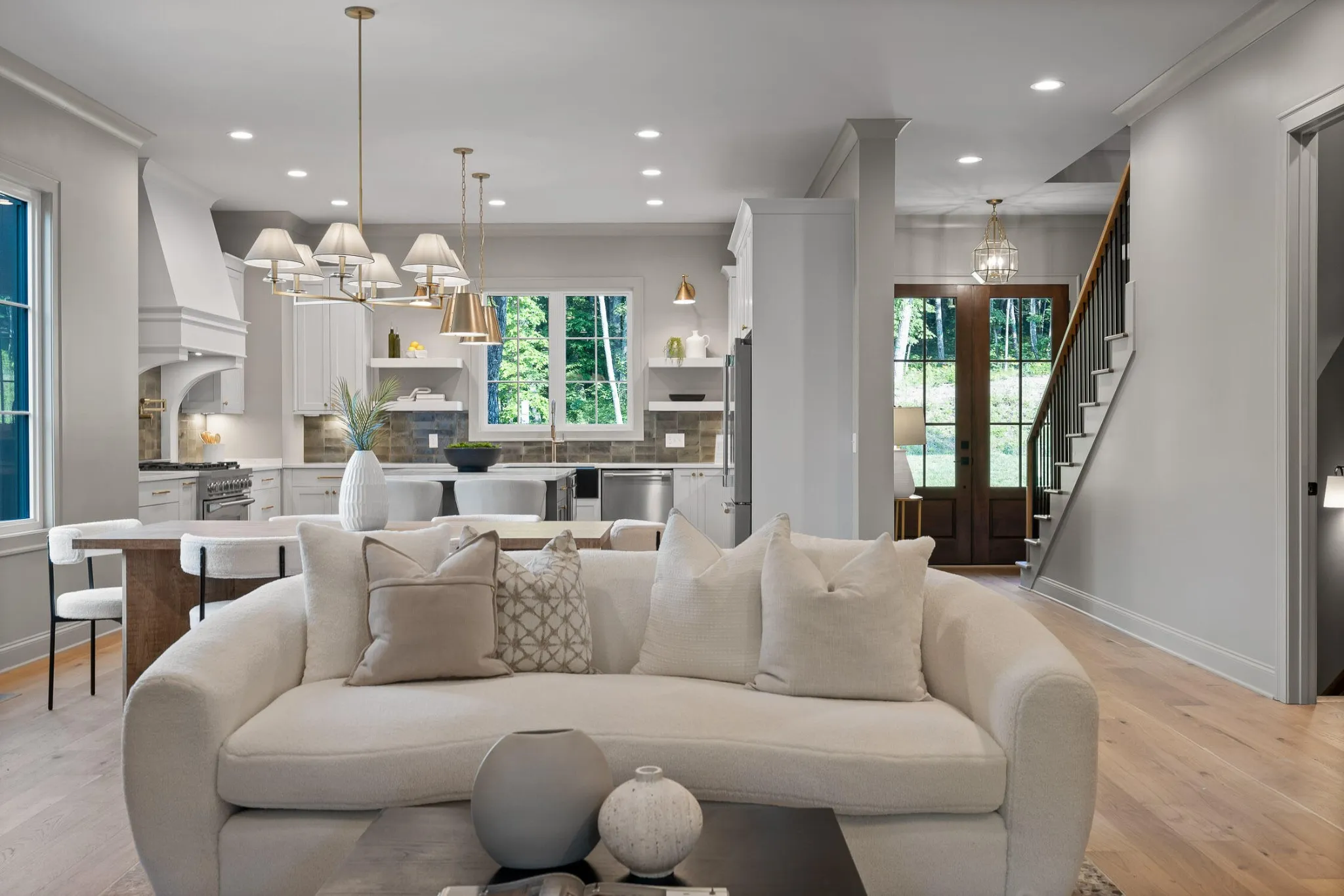 The main level sets the tone for refined yet relaxed living, anchored by a chef’s kitchen featuring a 36” gas range, pot filler, statement custom hood, apron-front porcelain sink, built-in microwave, and custom cabinetry with floating shelves and a professional s stainless refrigerator. The open floorplan flows seamlessly into a spacious dining area that easily seats ten, and a bright, airy living room centered around a gas fireplace with a wall of sliding glass doors that open to a screened-in porch with composite decking—perfect for indoor-outdoor entertaining.