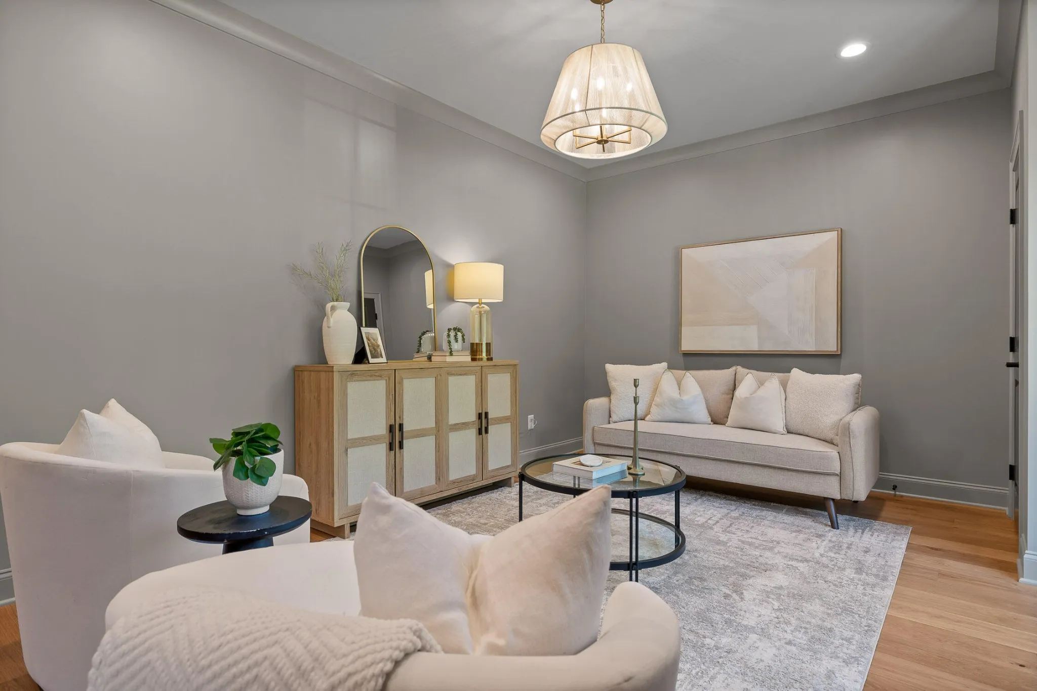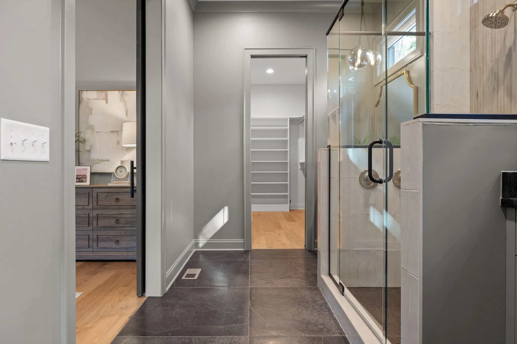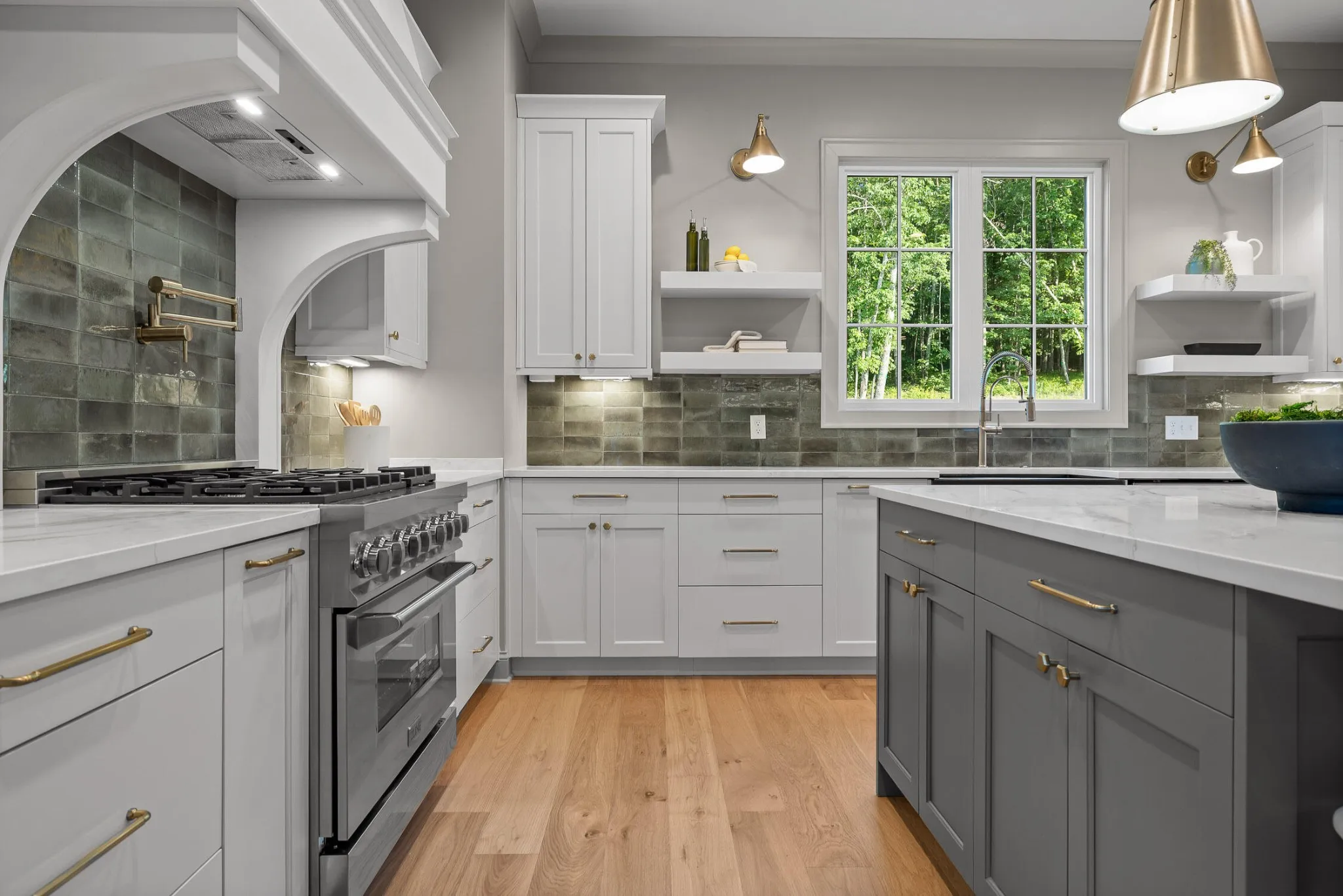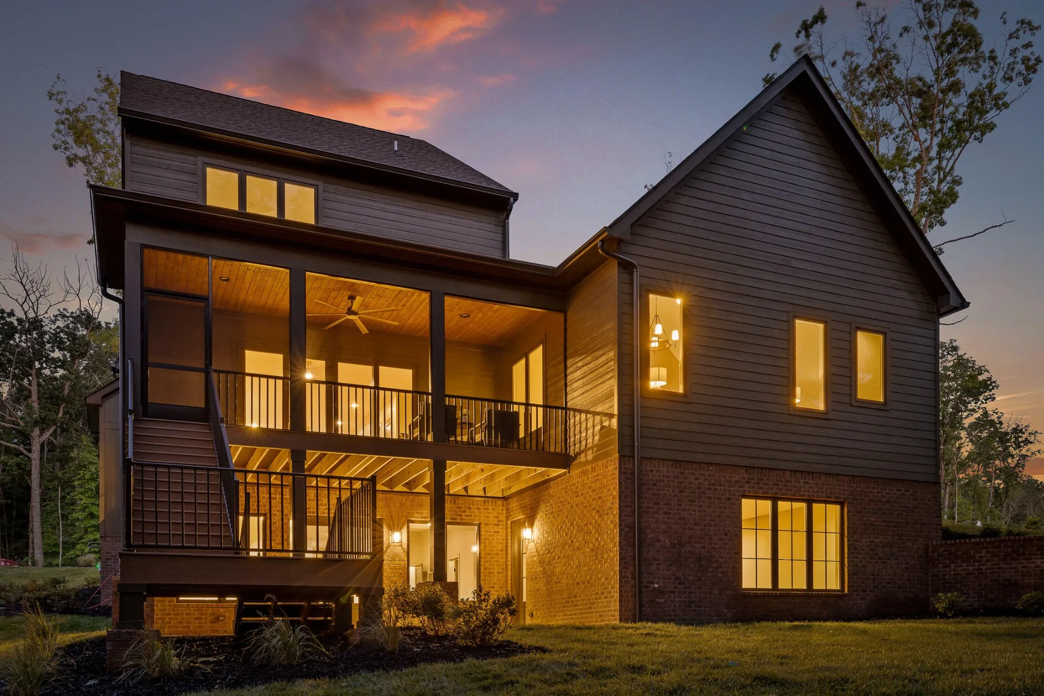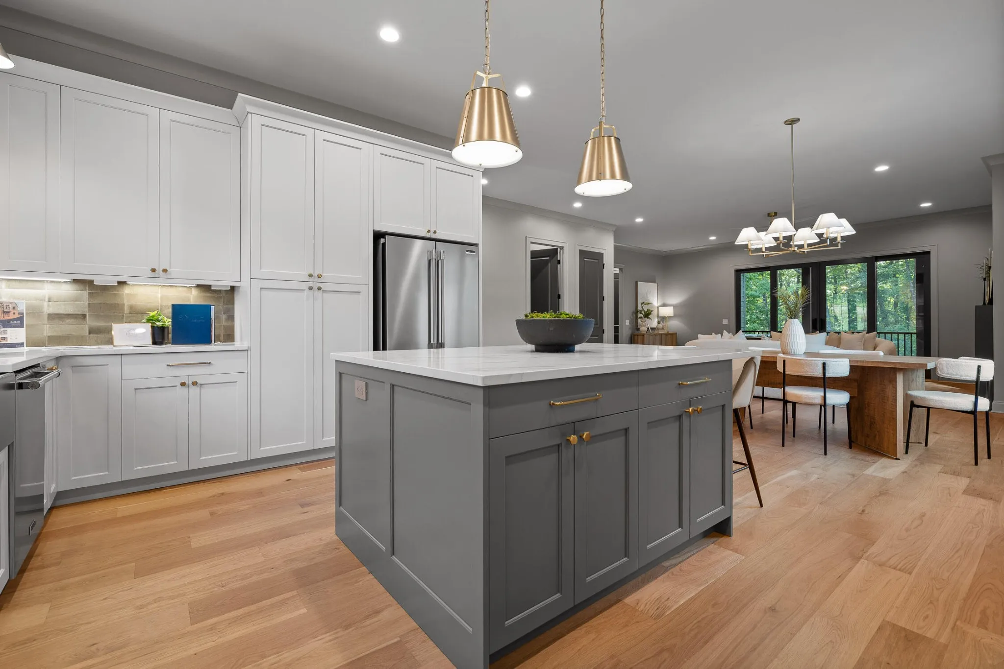 The main level sets the tone for refined yet relaxed living, anchored by a chef’s kitchen featuring a 36” gas range, pot filler, statement custom hood, apron-front porcelain sink, built-in microwave, and custom cabinetry with floating shelves and a professional s stainless refrigerator. The open floorplan flows seamlessly into a spacious dining area that easily seats ten, and a bright, airy living room centered around a gas fireplace with a wall of sliding glass doors that open to a screened-in porch with composite decking—perfect for indoor-outdoor entertaining.