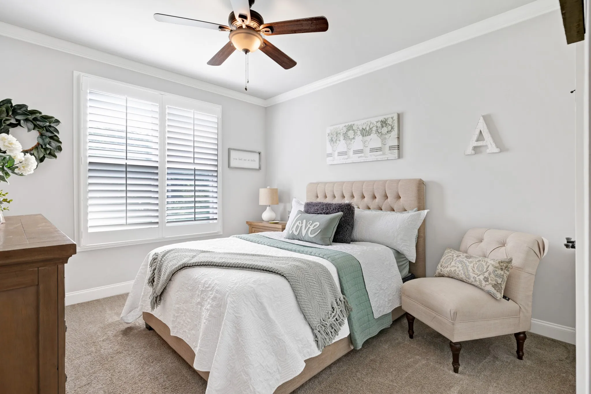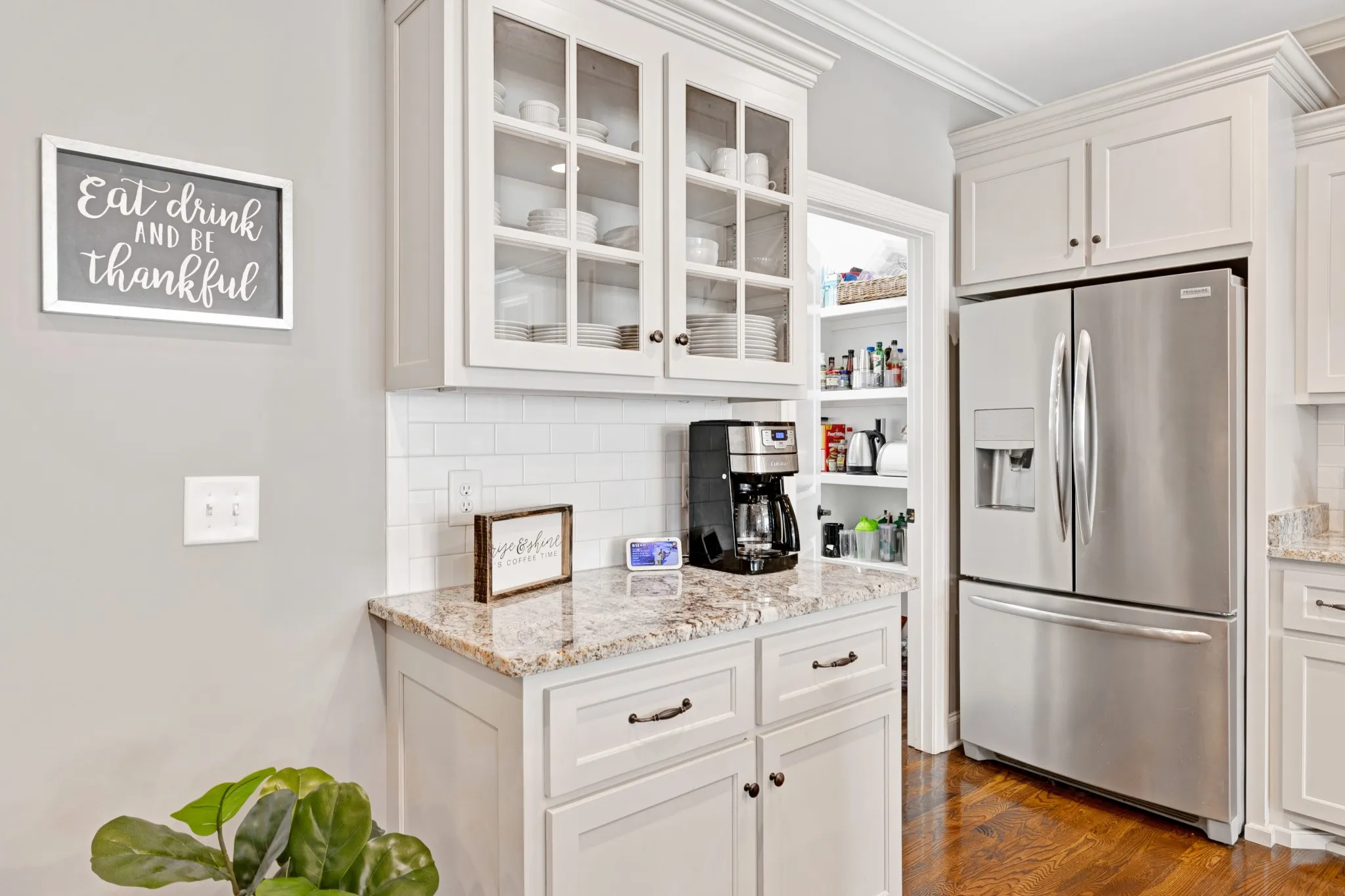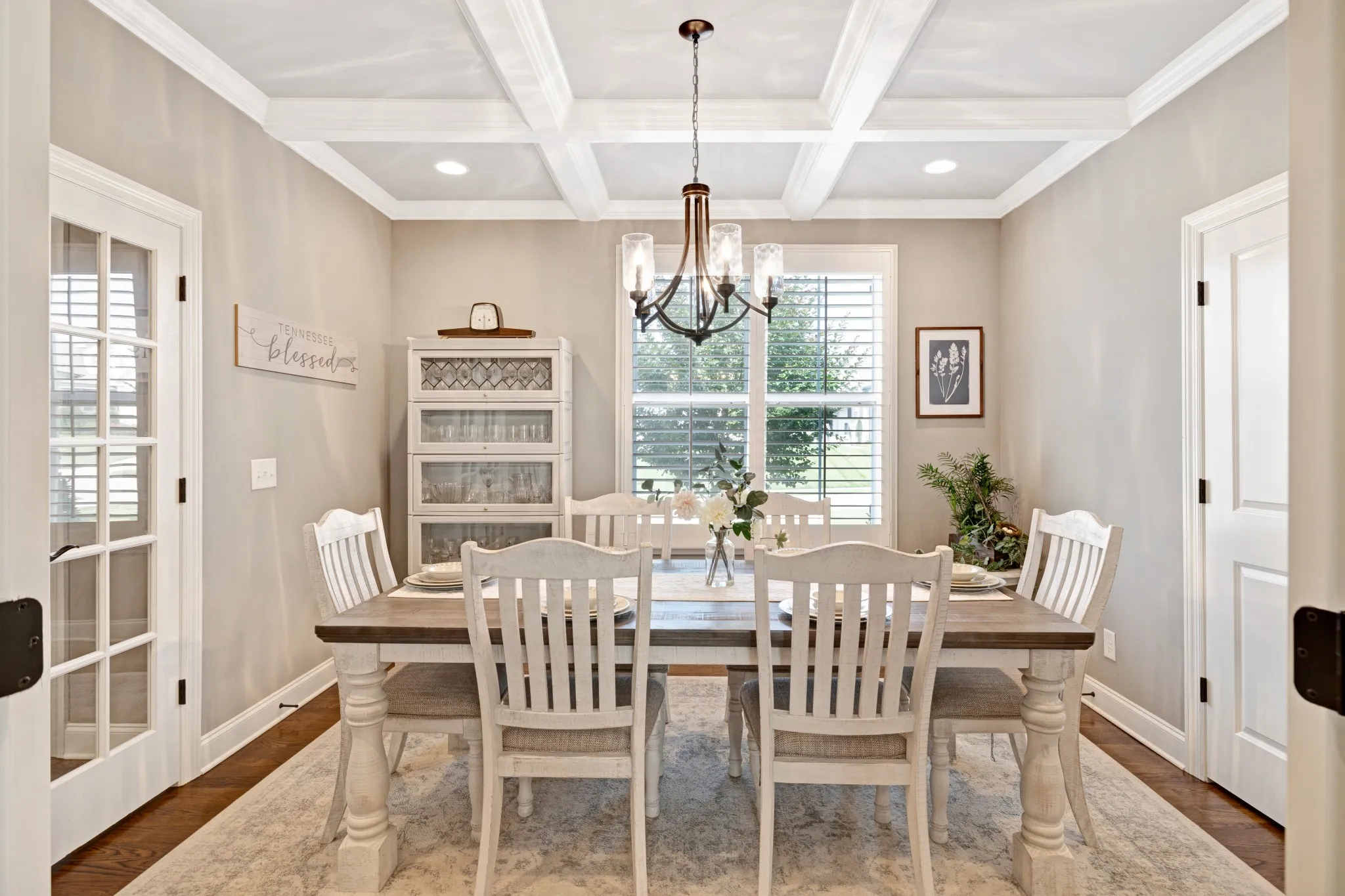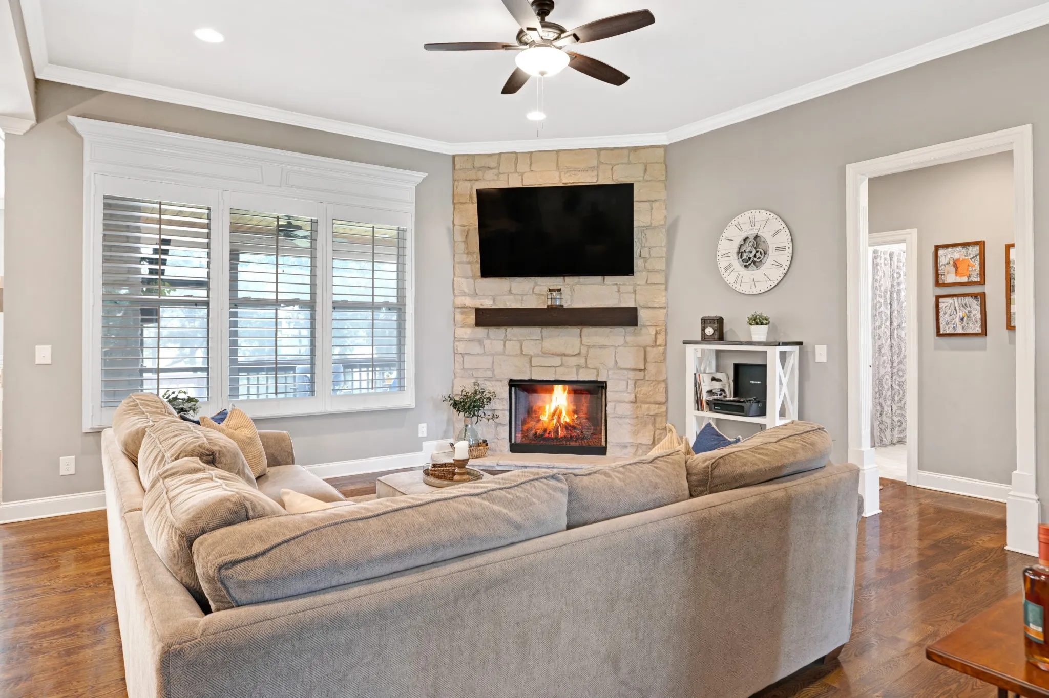 As you step inside, you’re greeted by a bright and open living room with warm hardwood floors, large windows with shutter blinds that fill the space with natural light, and a cozy gas fireplace—perfect for relaxing or hosting friends and family. The open-concept kitchen is equipped with stainless steel appliances, hand crafted cabinetry, a large pantry, and a breakfast nook with views of the backyard, including a formal dining room for those large family holiday meals.