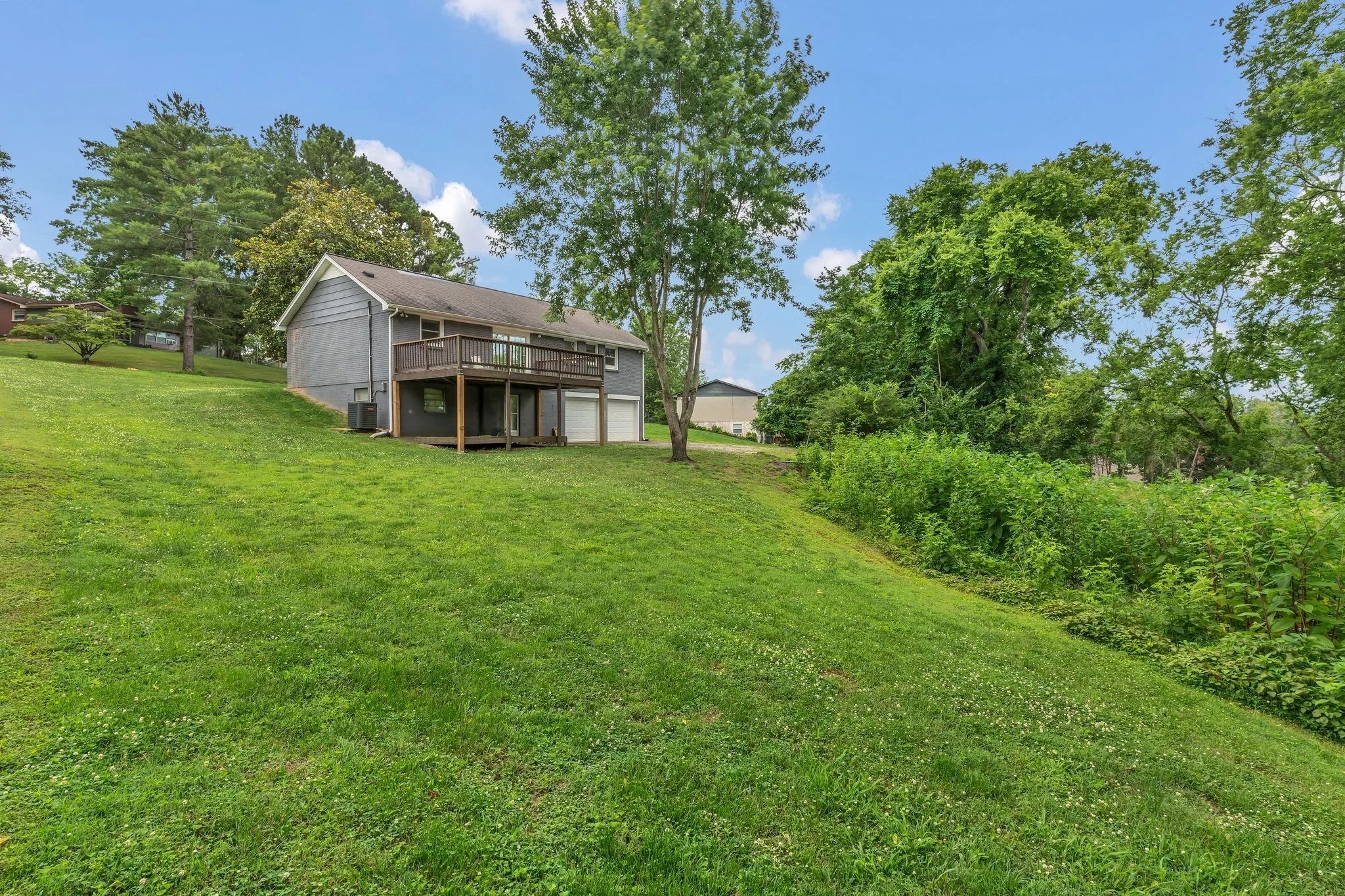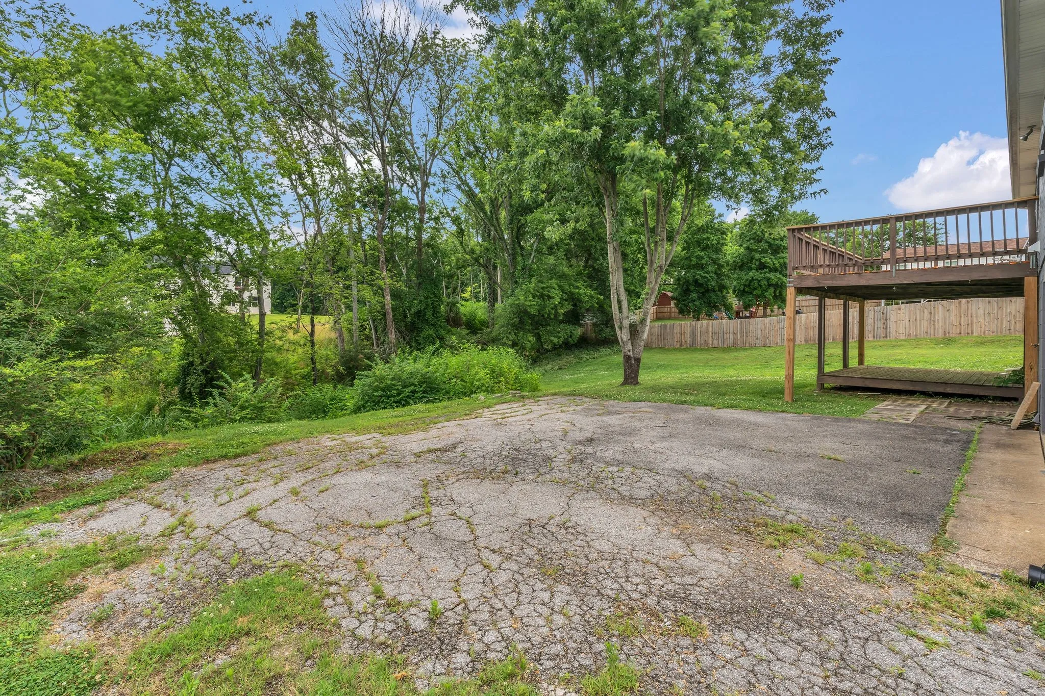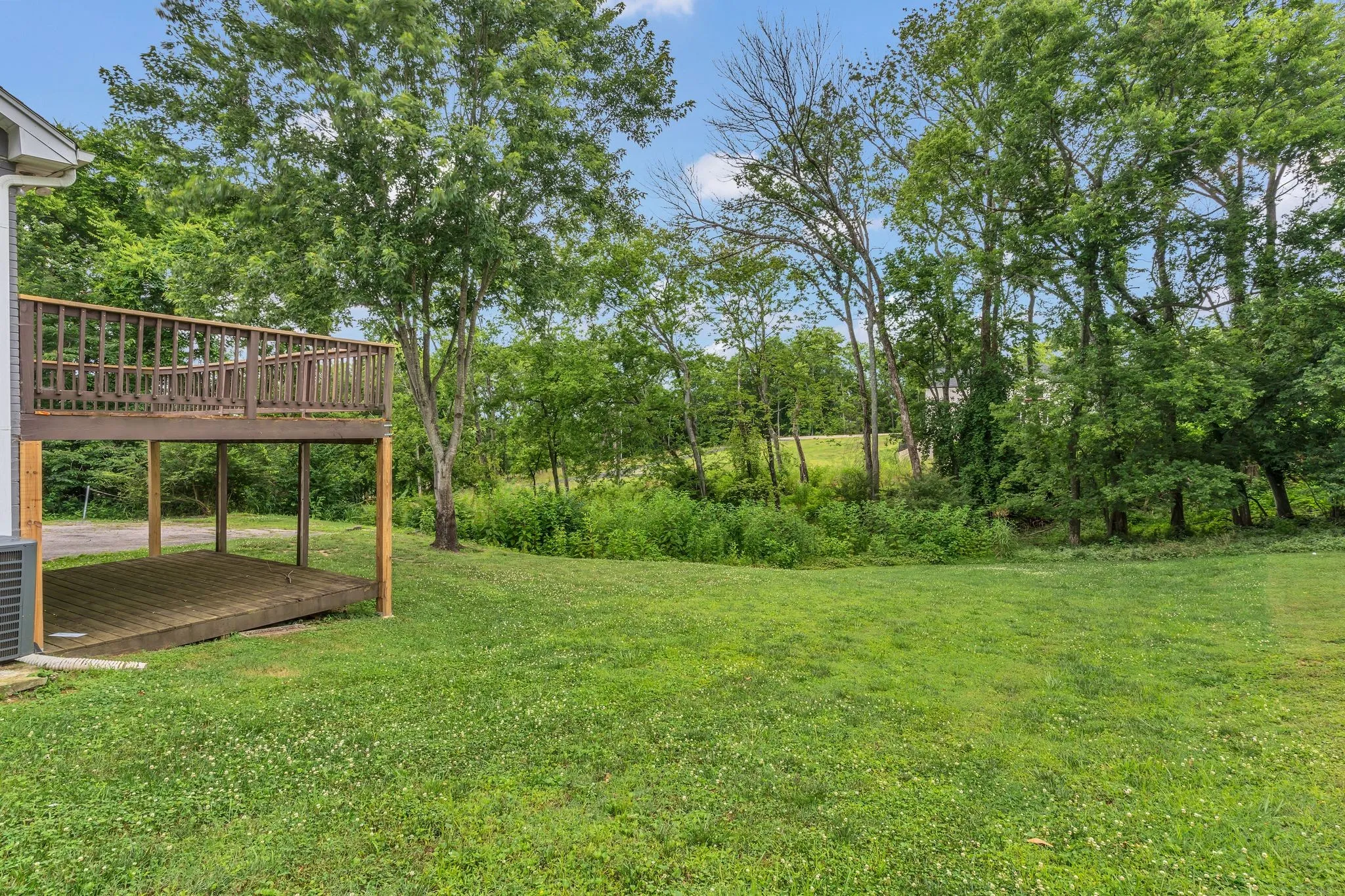 "LongDescription" => "Side view looking to the tree line and upper and lower Decking."