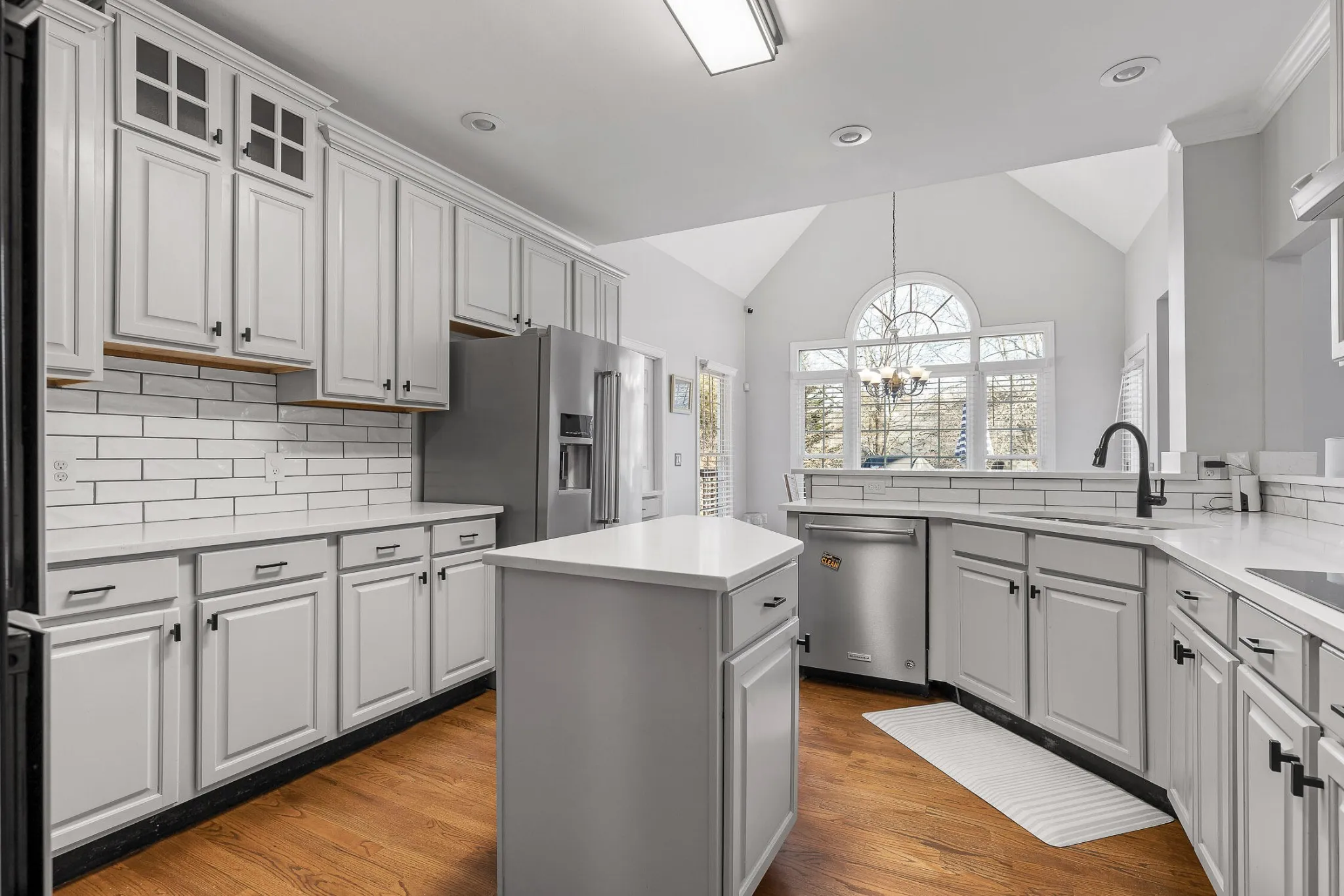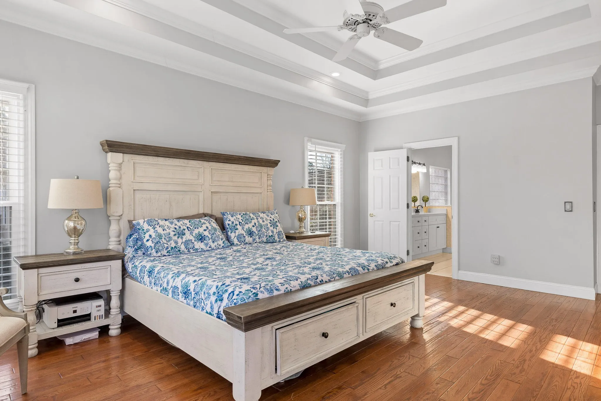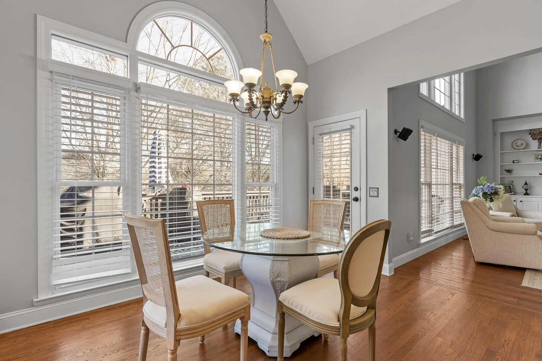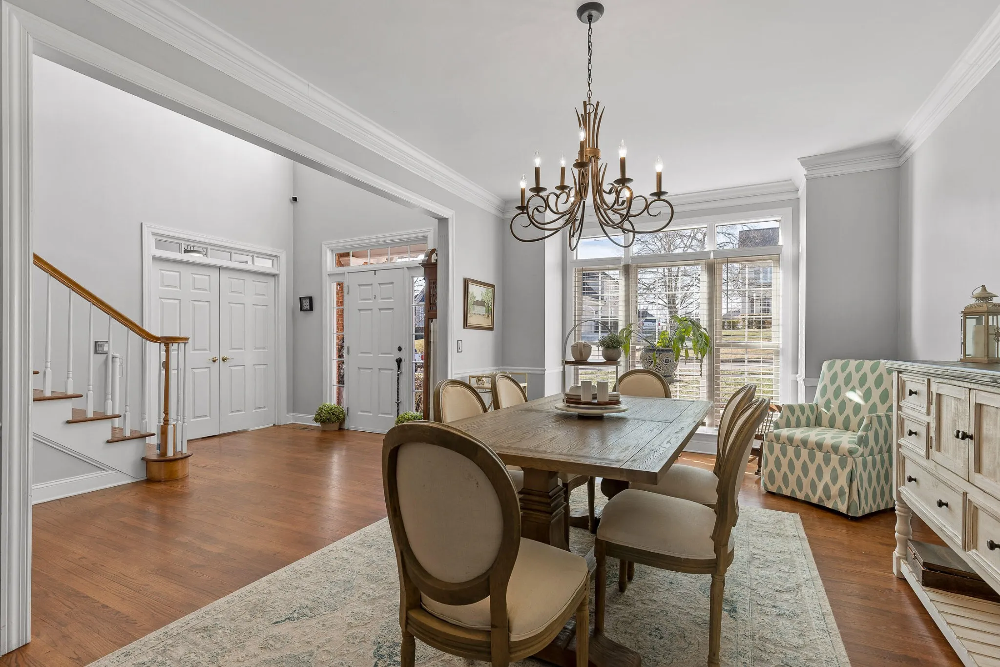Step inside to discover a functional layout featuring sun-filled living spaces, high ceilings, and functionality throughout. The kitchen boasts ample cabinetry, built-in pantry, double oven, and island prep space. It opens to the breakfast nook and leads to the formal dining room with butler pantry/coffee bar in between – the perfect stop for refreshing platters and drinks.
