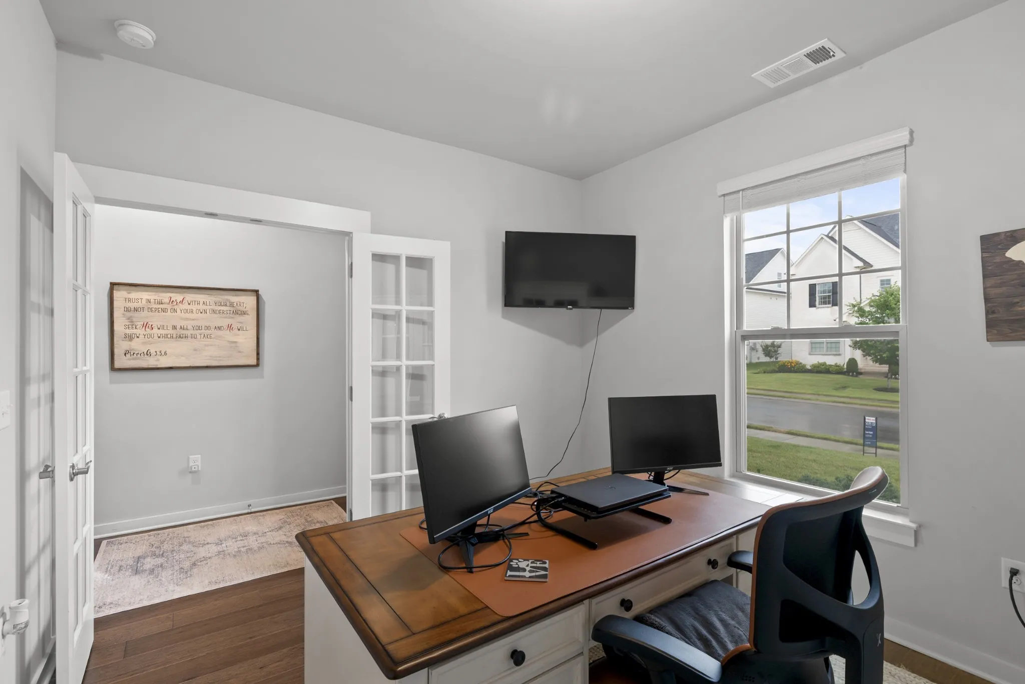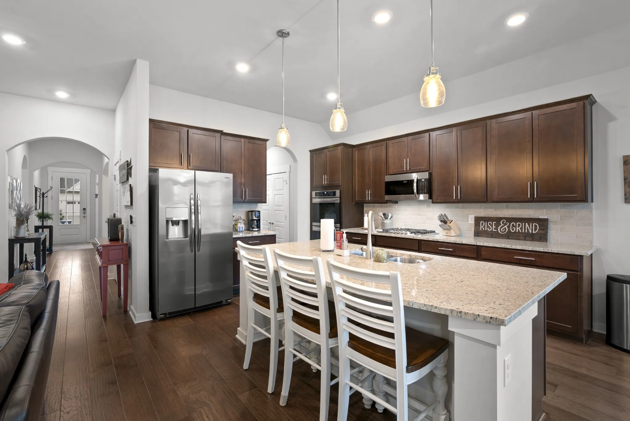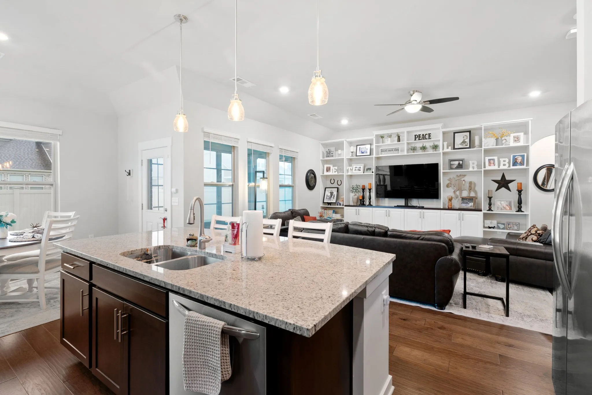 Thoughtfully Designed for Comfort and Connection. Experience the ease of mostly one-level living with just a single step into this beautifully crafted home. The main floor features three generously sized bedrooms and 2.5 baths, including a serene primary suite with a spa-inspired walk-in shower, dual vanity, and custom built-in closet organization. Upstairs, a versatile bonus room, full bath, and ample storage space offer endless possibilities—perfect for a movie and game nights, a guest retreat, hobby space, or home office. Need more bedrooms? Both the Bonus Room, and Study with closets can easily serve as Bedroom #4 with close access to a full bath. At the heart of the home, the open-concept kitchen flows seamlessly into the inviting family room. With granite countertops, a classic subway tile backsplash, stainless steel Frigidaire appliances, and deep pot drawers, the kitchen is both functional and stylish. The family room features a custom built-in entertainment center and a wall of windows that flood the space with natural light. Enjoy the outdoors in your private, fenced yard, relax in the bright and cheerful sunroom or grab some sun on the covered patio with durable epoxy flooring. Take advantage of thoughtful upgrades like the 3-car garage with pedestrian door, full-yard irrigation, Ring doorbell, and security system. This home offers not just space, but a sense of comfort, flexibility, and thoughtful detail—everything you need, and more.