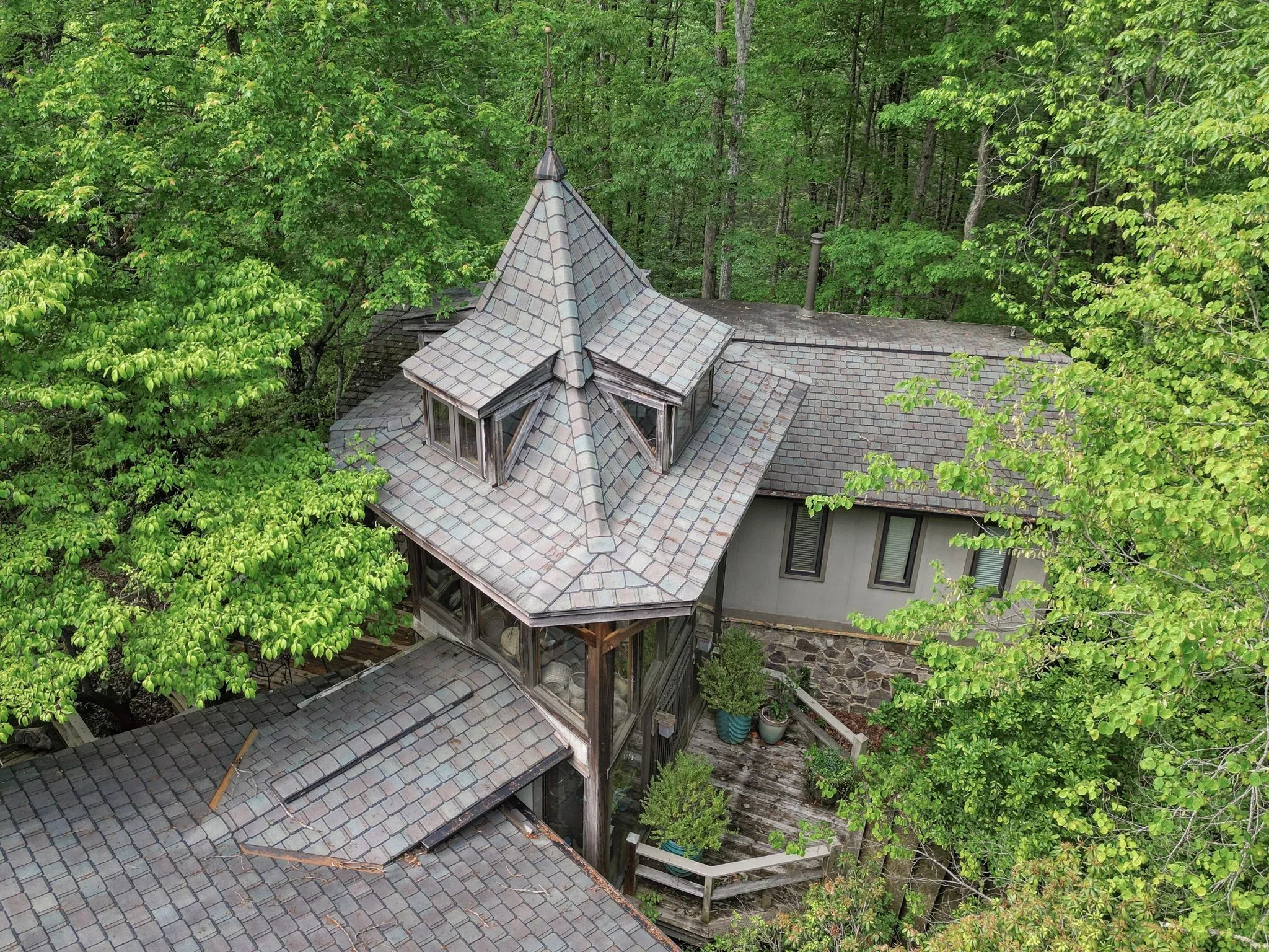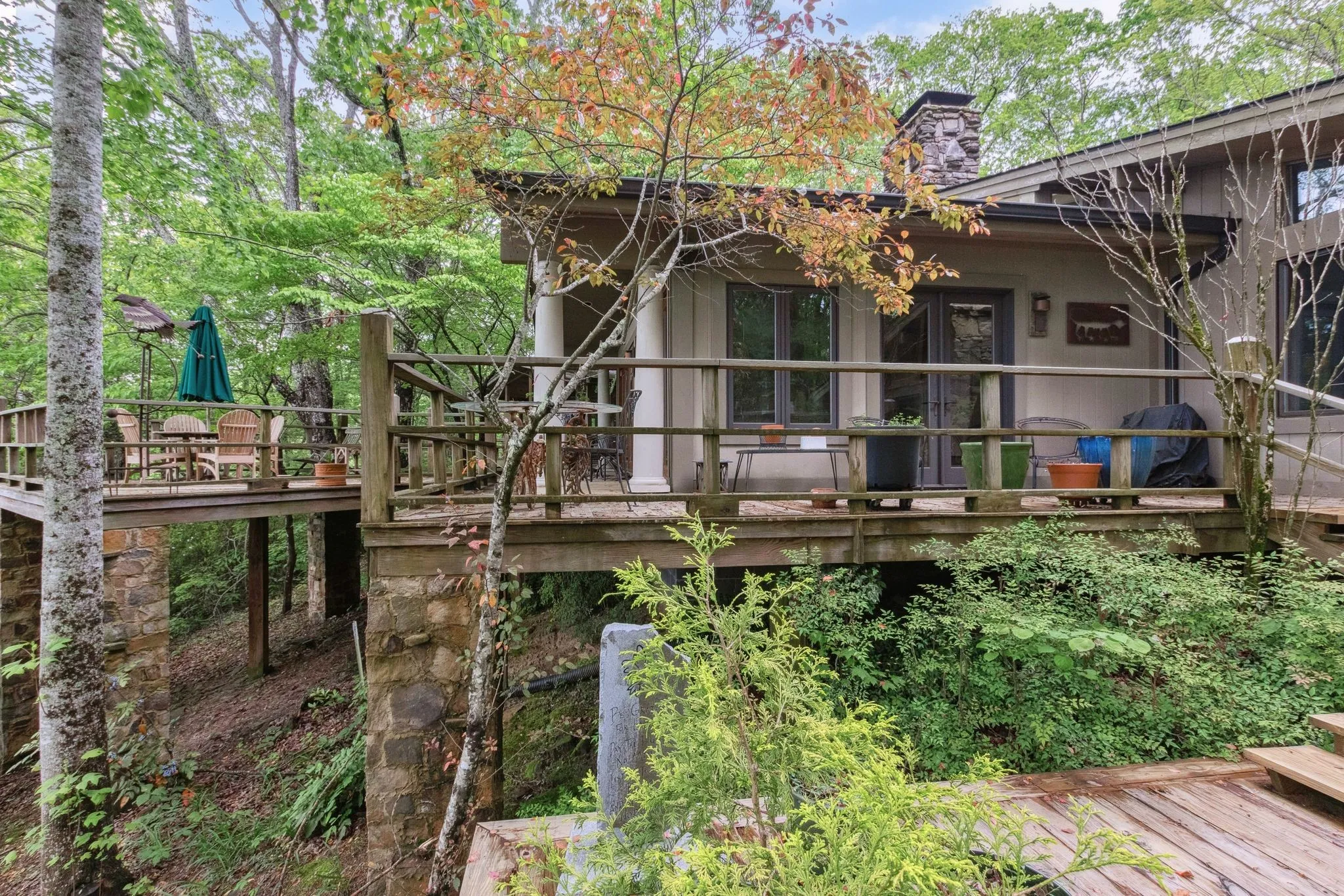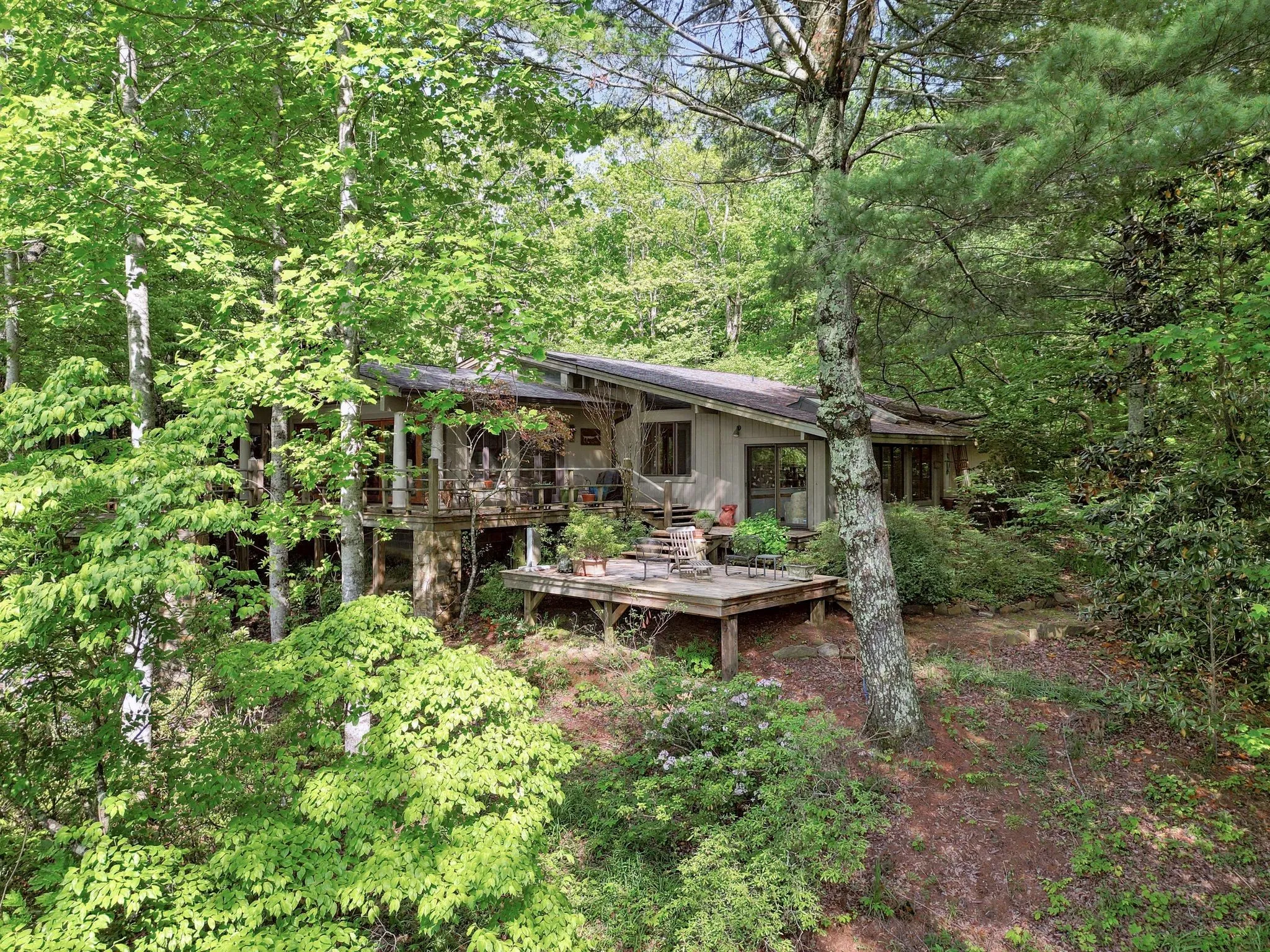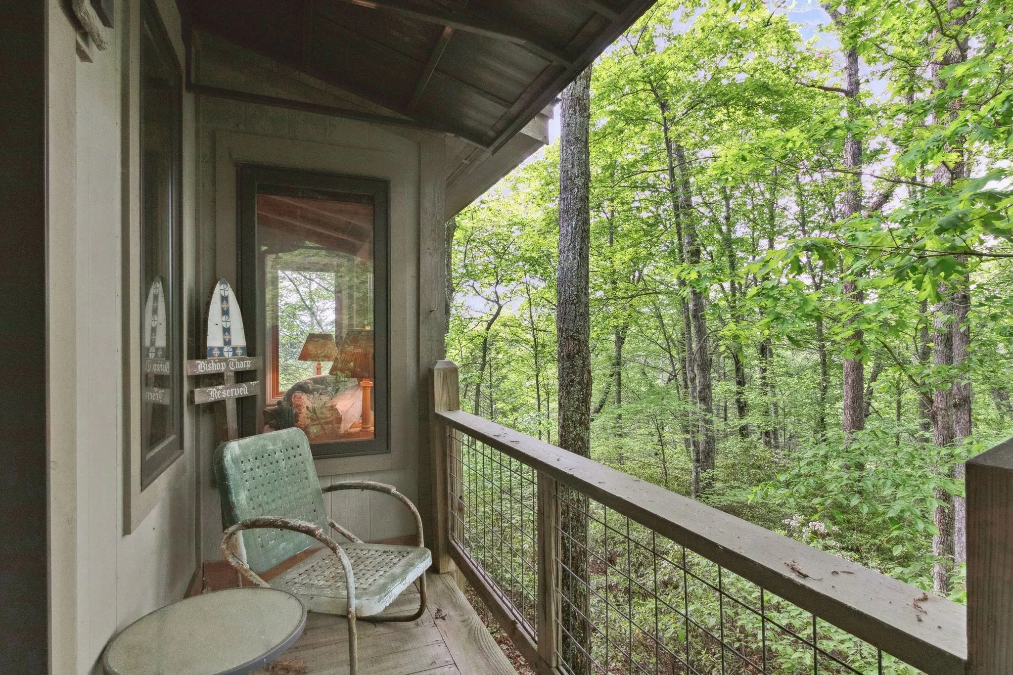 From the seller, “Once in your lifetime property! Beautiful mountain treehouse. Private, over 7 acres of land – 3 minutes from Monteagle on a road that leads to a deep valley and a river – no through traffic – very private, totally wooded. Necessary amenities for lodging in Colorado, Utah or Tennessee – Great elevation – 1,900 feet. Total sunset Western views with a river running on property. Close to Monteagle, but not too close. The views are extraordinary and not a sound other than nature. To see it is, in itself, a treat.”