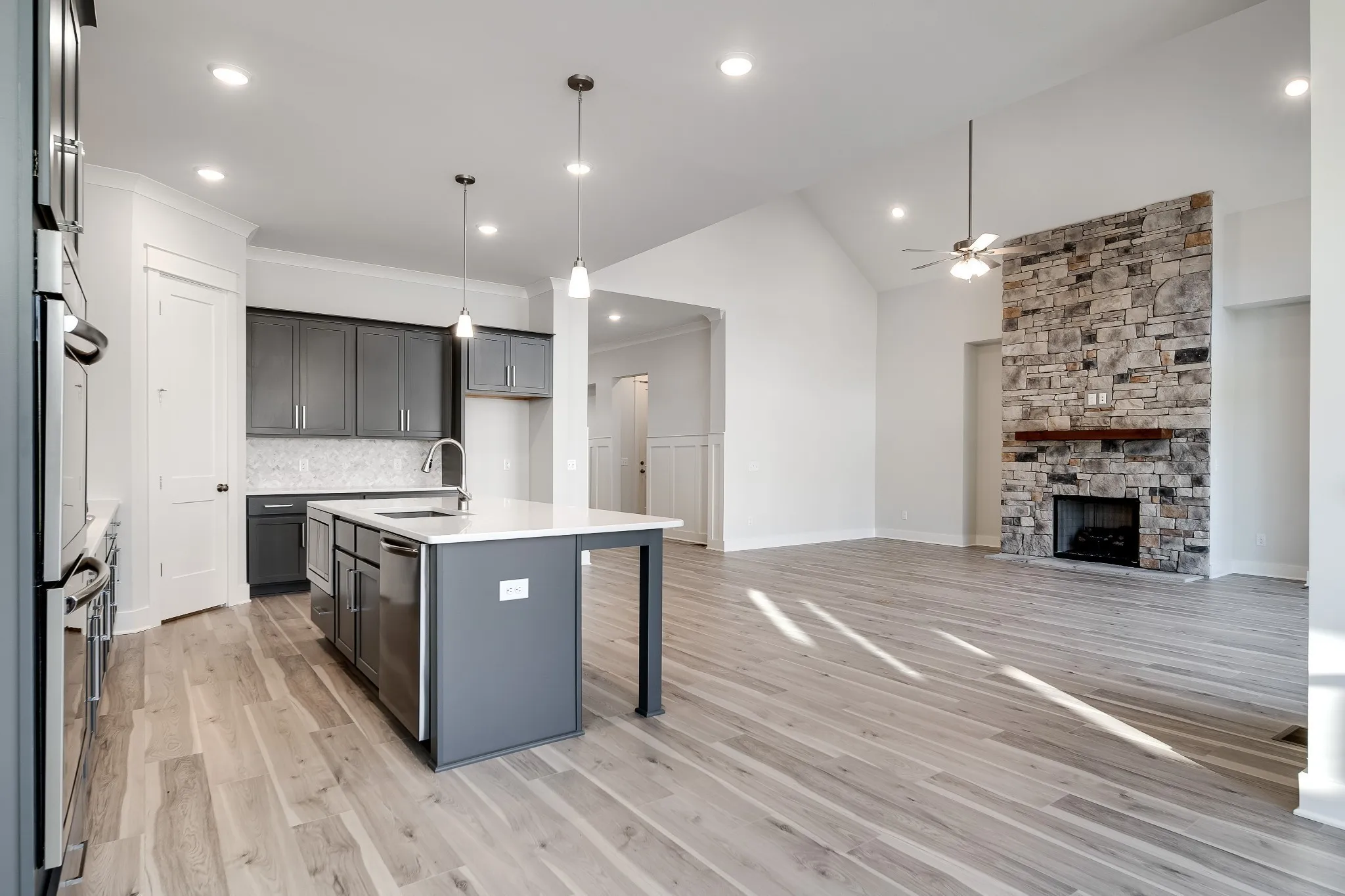 WALKABLE COMMUNITY TO THE NEW TOWN CENTER! The Burgess Plan is a stunning single-level home designed with both style and functionality in mind. Featuring a spacious great room with soaring 10-foot ceilings and a cozy fireplace, it’s perfect for relaxing or entertaining. The chef’s kitchen is a culinary dream, complete with modern finishes and ample storage, while the outdoor fireplace offers an inviting space to enjoy evenings under the stars.