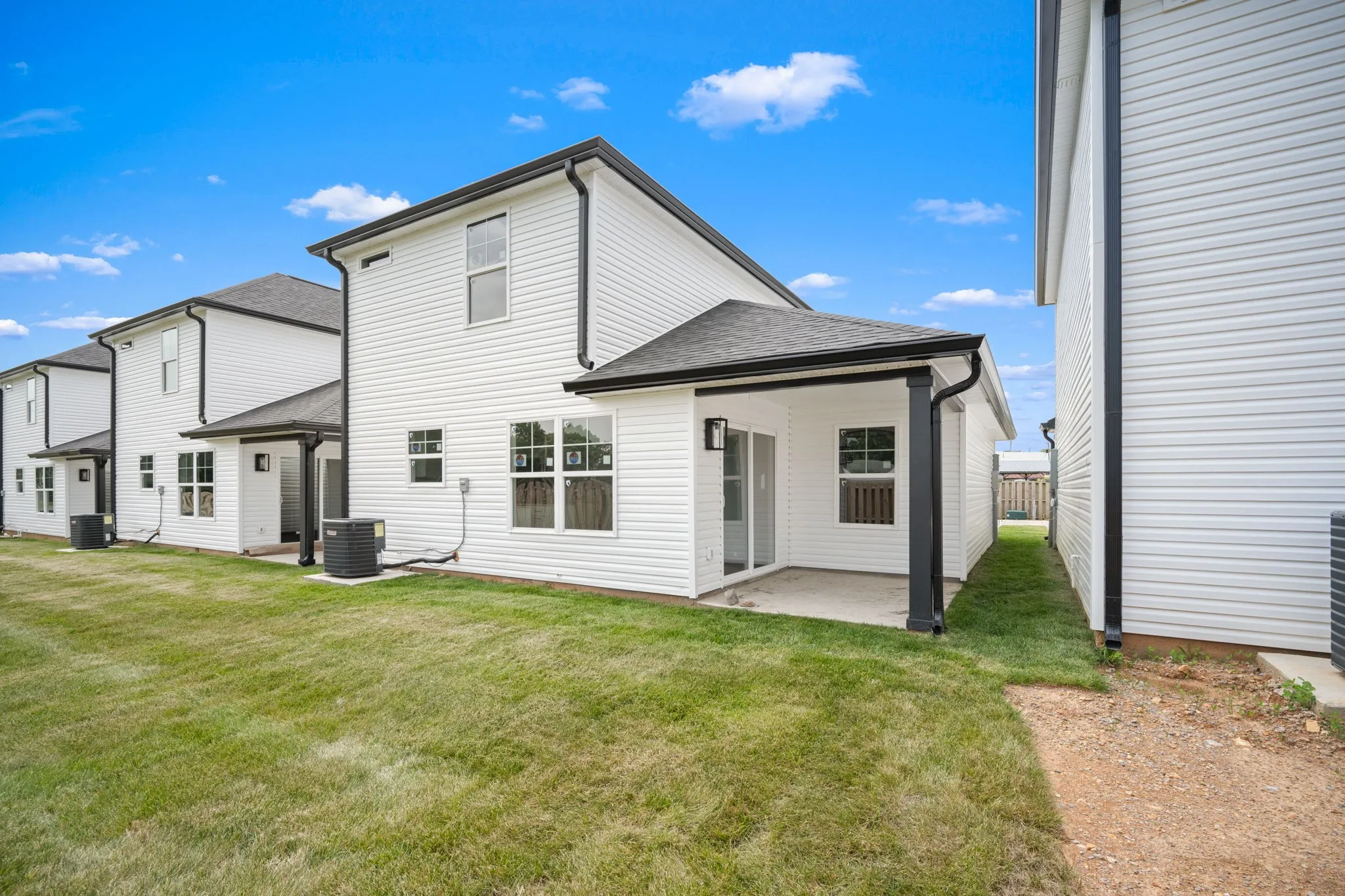 Welcome to a beautifully designed detached townhome that offers the privacy and peace of a single-family home, with the low-maintenance perks of townhome living. No shared walls, no connecting roofs—just your own space, thoughtfully built for comfort, design, and everyday function. Step inside to an open and airy layout where luxury vinyl flooring flows seamlessly throughout, and tile accents every wet area for both beauty and durability. The custom soft-close cabinetry, quartz countertops, and modern finishes in the kitchen create a sleek, elevated atmosphere perfect for both casual living and entertaining. The primary suite is conveniently located on the main level, offering privacy and ease, complete with its own en-suite bath. Upstairs, two additional bedrooms await—including one with dual closets—and a generous landing area perfect for a compact home office or reading nook. Details like shutters on every window, a fenced backyard area, and a unique wooden staircase feature wall add charm and character, while the washer and dryer hookups, ample closet space, and community green space offer everyday convenience. These homes blends thoughtful design with function and style in a way that supports every chapter of life—whether you’re hosting guests, working from home, or just enjoying quiet moments to yourself.