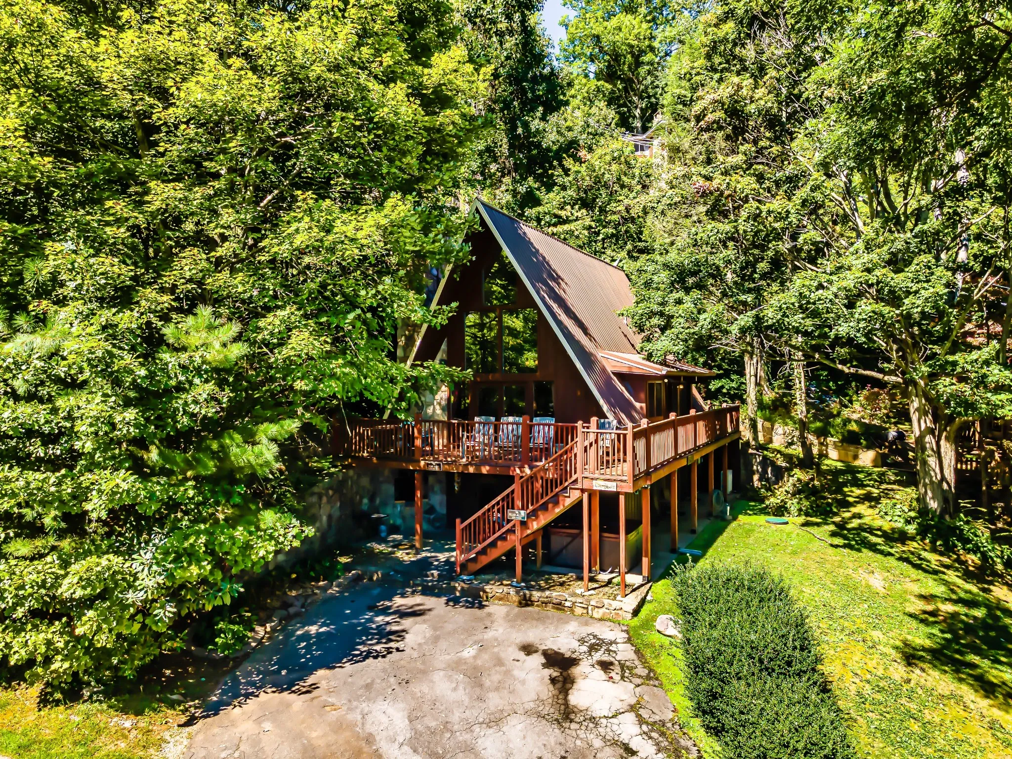 PRICE IMPROVEMENT !!! Stunning A-Frame Mountain Retreat with Mt. LeConte Views and Turnkey Short term rental/NOO Opportunity. Welcome to this exceptional 3-bed, 3-bath A-frame cabin in the heart of Chalet Village. Fully remodeled to preserve its original charm while offering modern comfort, this mountain retreat is 100% turnkey and rental-ready, with projections of $110K–$130K annually. Located on a rare flat lot with private driveway and level parking, this property combines convenience with breathtaking scenery.Enjoy panoramic views of Mt. LeConte from the expansive wraparound deck, or watch the Ober Mountain tram glide through the ridgeline below. The lower level includes a game room, bunk area, kitchenette, fireplace, and private bedroom with porch access—perfect for maximizing guest capacity. Step outside to a built-in brick oven/BBQ grill and hot tub tucked beside a landscaped yard for added privacy.The main floor boasts a great room with vaulted ceilings, floor-to-ceiling glass, wood-burning fireplace, granite kitchen, full bath, and a private bedroom. Upstairs, the loft offers a large bedroom with two queen beds, a full bath, and a cozy reading nook with futon. \n