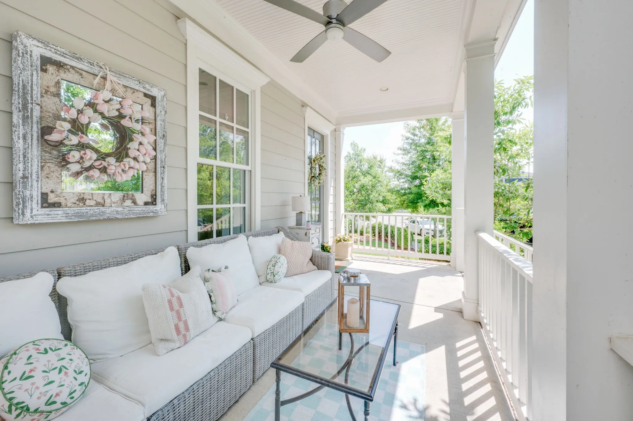 Gorgeous “Emma Grace” floor plan featuring a double porch with a view!! This bright and airy home offers an abundance of natural light that flows throughout! Open concept, main floor living with a spacious first floor primary suite; Gourmet kitchen with quartz countertops, cabinets to the ceiling, gas cooktop and sizable island with seating; Expansive living room with gas fireplace and custom built-ins/shelving; Sand/finish hardwoods throughout the main floor: Upstairs bonus with murphy bed; Two large secondary upstairs bedrooms; Custom wainscoting and built-in storage in the drop zone area; Custom wainscoting and vanity in the half bath; Fully turfed and irrigated side yard with Trekdek flooring and wood privacy fence; New roof coming soon! Enjoy the Westhaven community amenities which include tennis, pickleball, hiking trails, three pools, fishing, workout facilities and more!