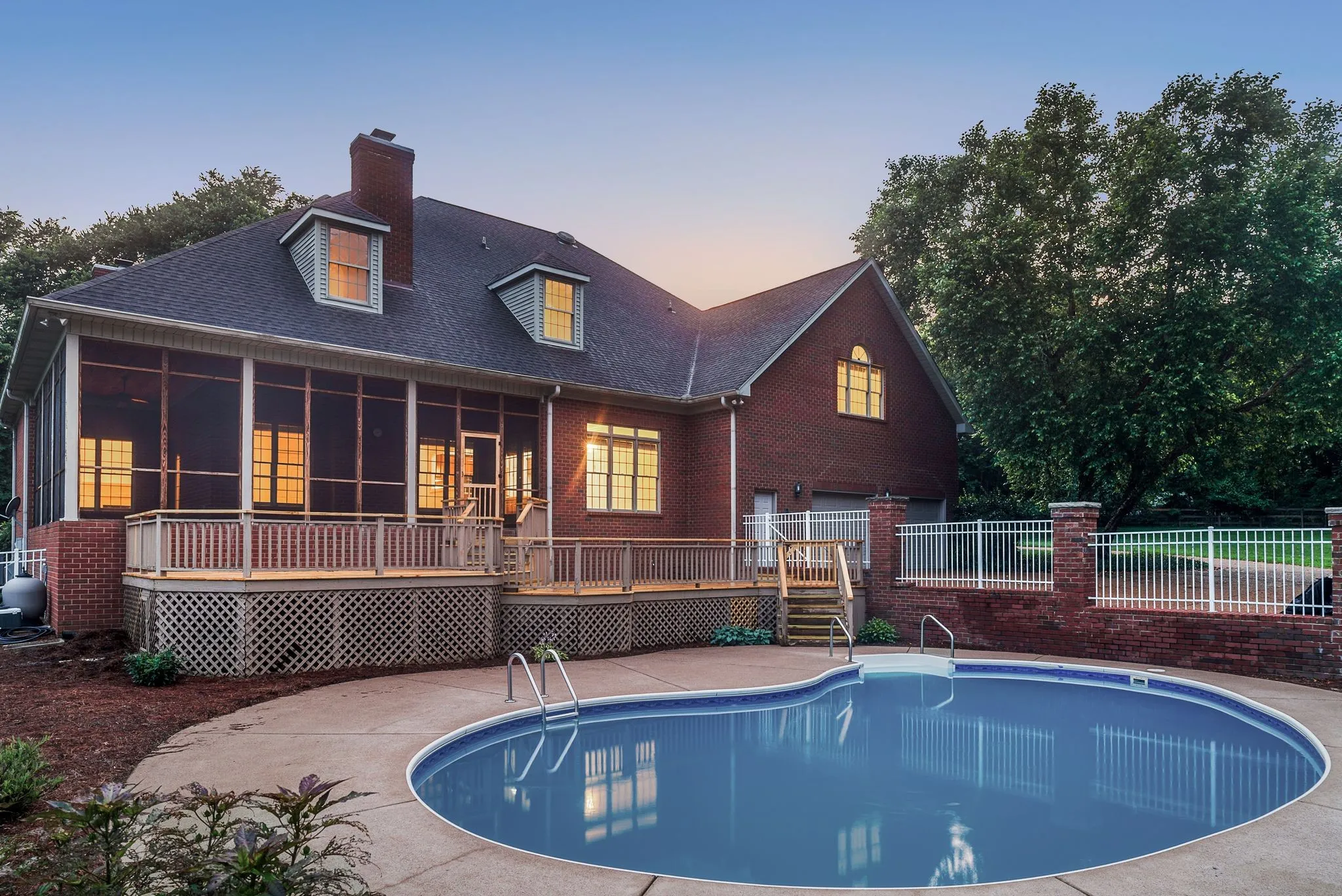 The primary suite is a true retreat, complete with dual vanities, a separate soaking tub and shower, and ample space to unwind. Outside, enjoy a large front and back yard, a refurbished deck, and a screened-in porch overlooking the pool—perfect for summer days and peaceful evenings.