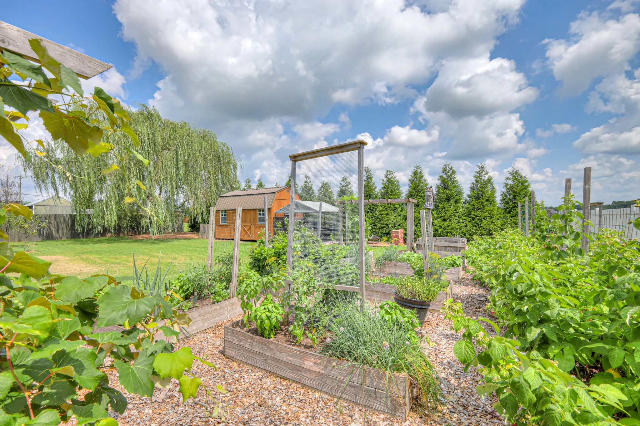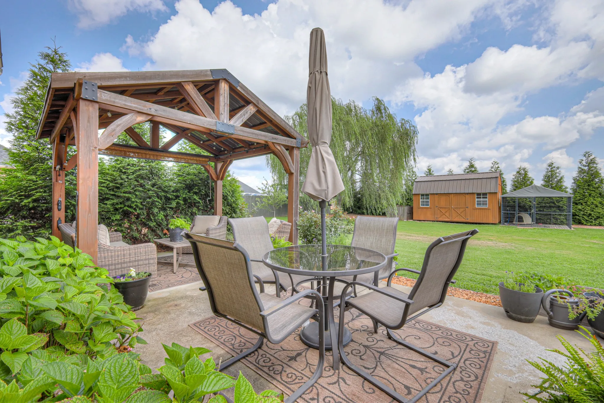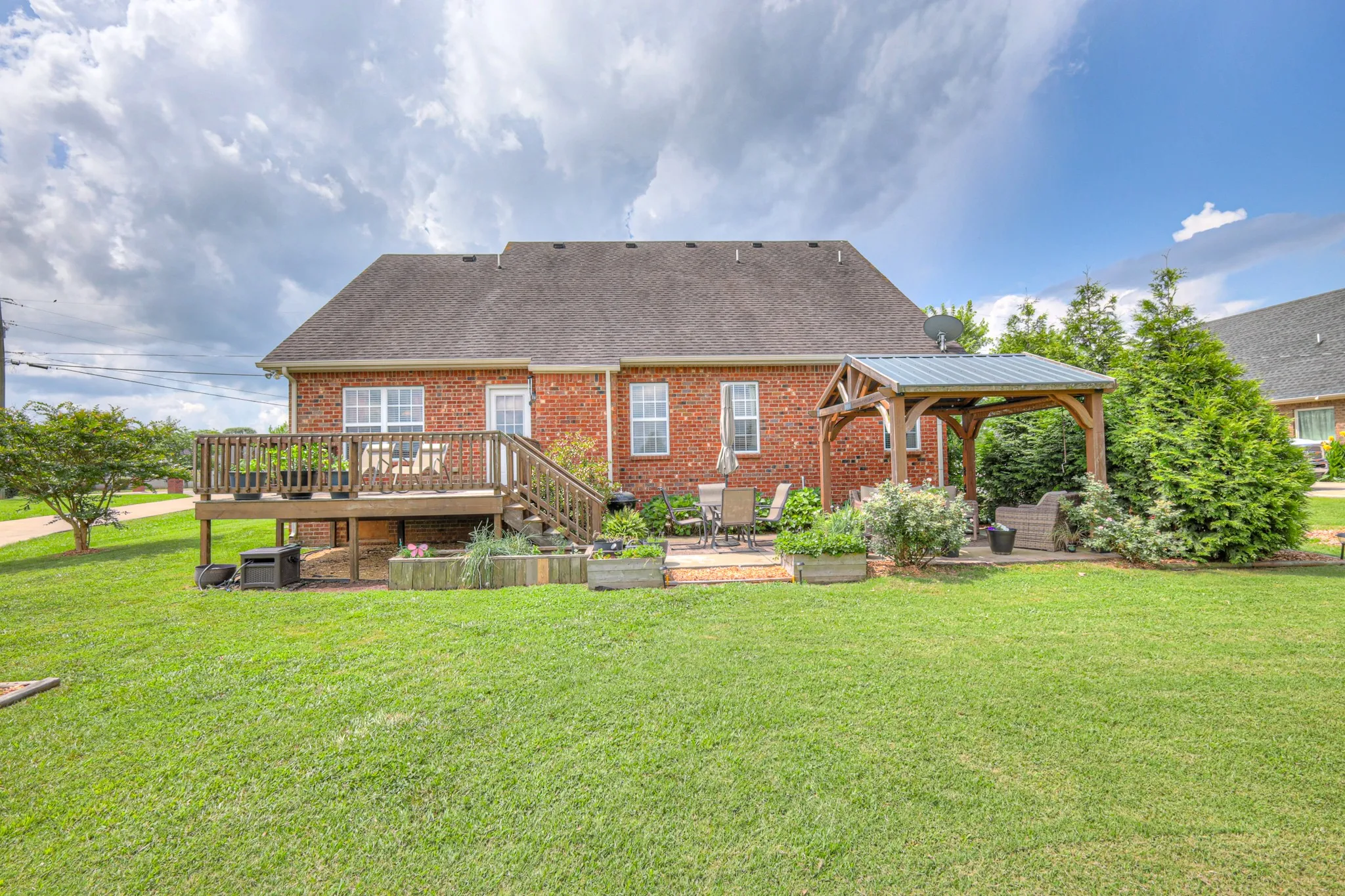 Spacious brick home in Thompson Grove Subdivision on 1/3 an acre with no HOA or city taxes. Main level living offers real hardwood floors, a good size primary suite with soaking tub, separate shower-double vanities- walk in closet. Home has formal dining room, nice eat-in kitchen with breakfast nook and a cozy family room with fireplace. Upstairs enjoy a catwalk overlooking the family room, 2 big bedrooms, a full bath and a large bonus room, perfect as a 4th bedroom, a rec room, an office or a playroom. Step outside to a deck, a patio and a cedar gazebo that’s wired with electricity, a 10 x 16 wooden shed with double lofts, workbench and shelving, and a cedar raised bed garden with herbs, veggies, and berries also with 2 cedar arbors for grapes. Lots of trees for total privacy. It’s been called an “oasis” more than once.