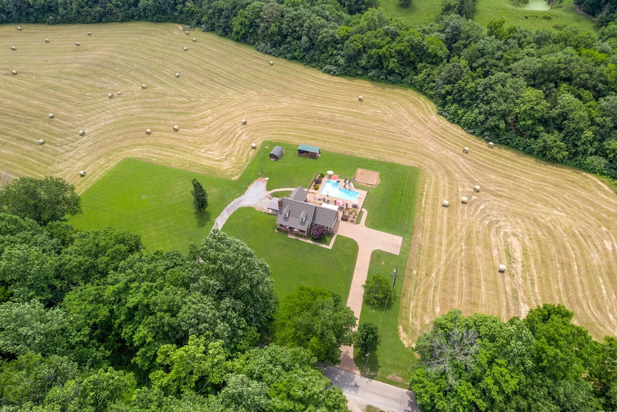 Primary suite on main floor with walk-in closet & makeup/vanity nook. Eat-in kitchen w/ Silestone counters, stainless appliances, & separate dining room with real hardwood floors. Resort-worthy outdoor living area complete with a saltwater pump L-shaped in-ground pool w/ slide, diving board, new liner, new pump, new cover, & new crawler vacuum system in 2024. 2 Sunsetter awnings on the deck, ffully fenced pool area, and your pool furniture is included in the sale! There is even a fenced-in raised-bed garden area for your vegetables and/or flowers! 2 storage buildings include 12×16 shed, and metal building—all convey. An additional lot on the far end of the property has electric hookup and city water meter already in place—perfect for rental cottage/AirBNB or mother-in-law setup! You will even have your own private access to a creek that runs along the back tree line! Natural gas fireplace. Too many goodies to list; you just have to see it yourself!
