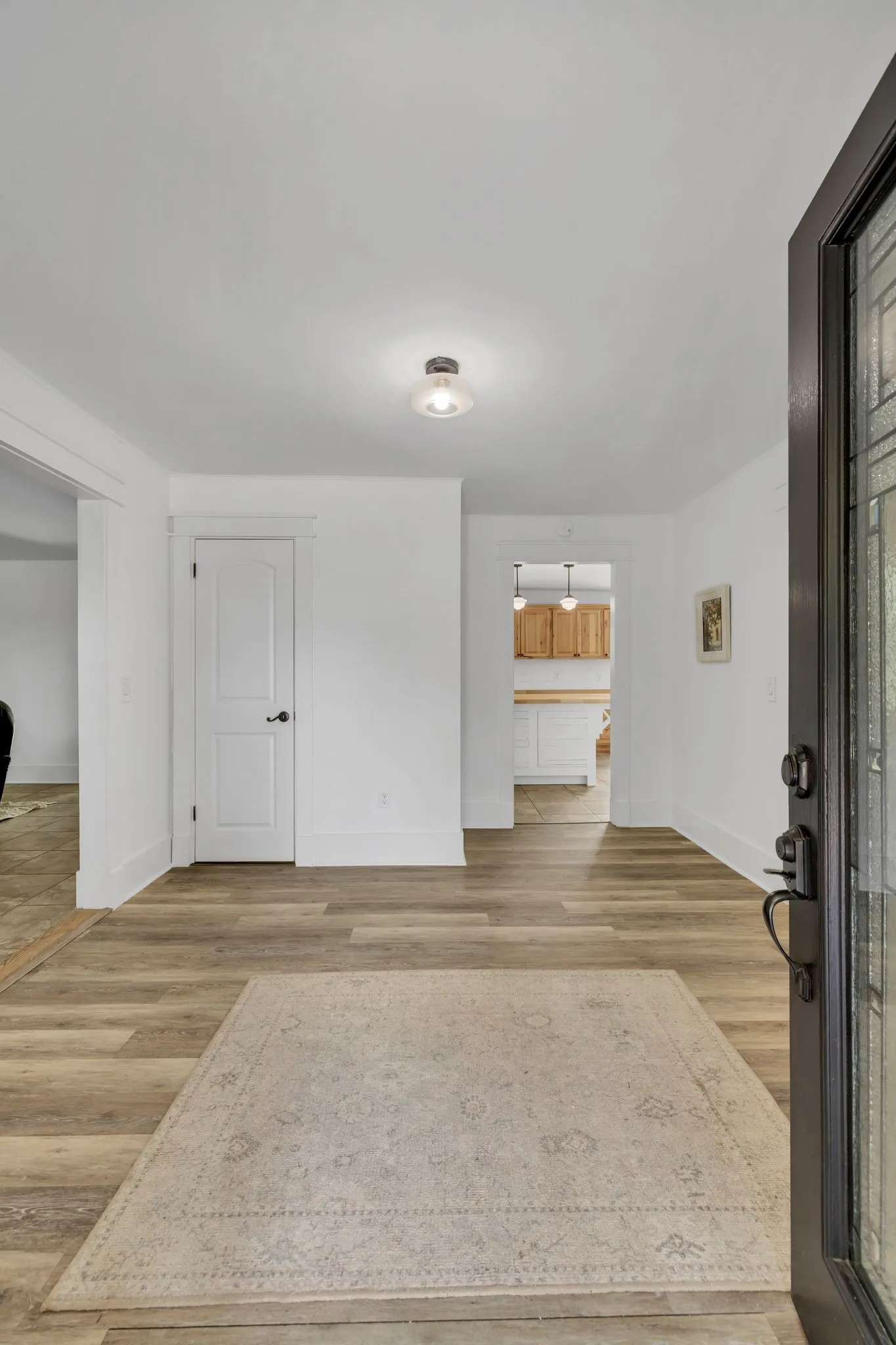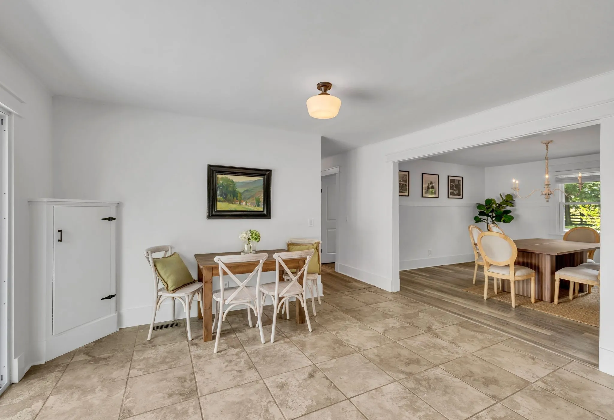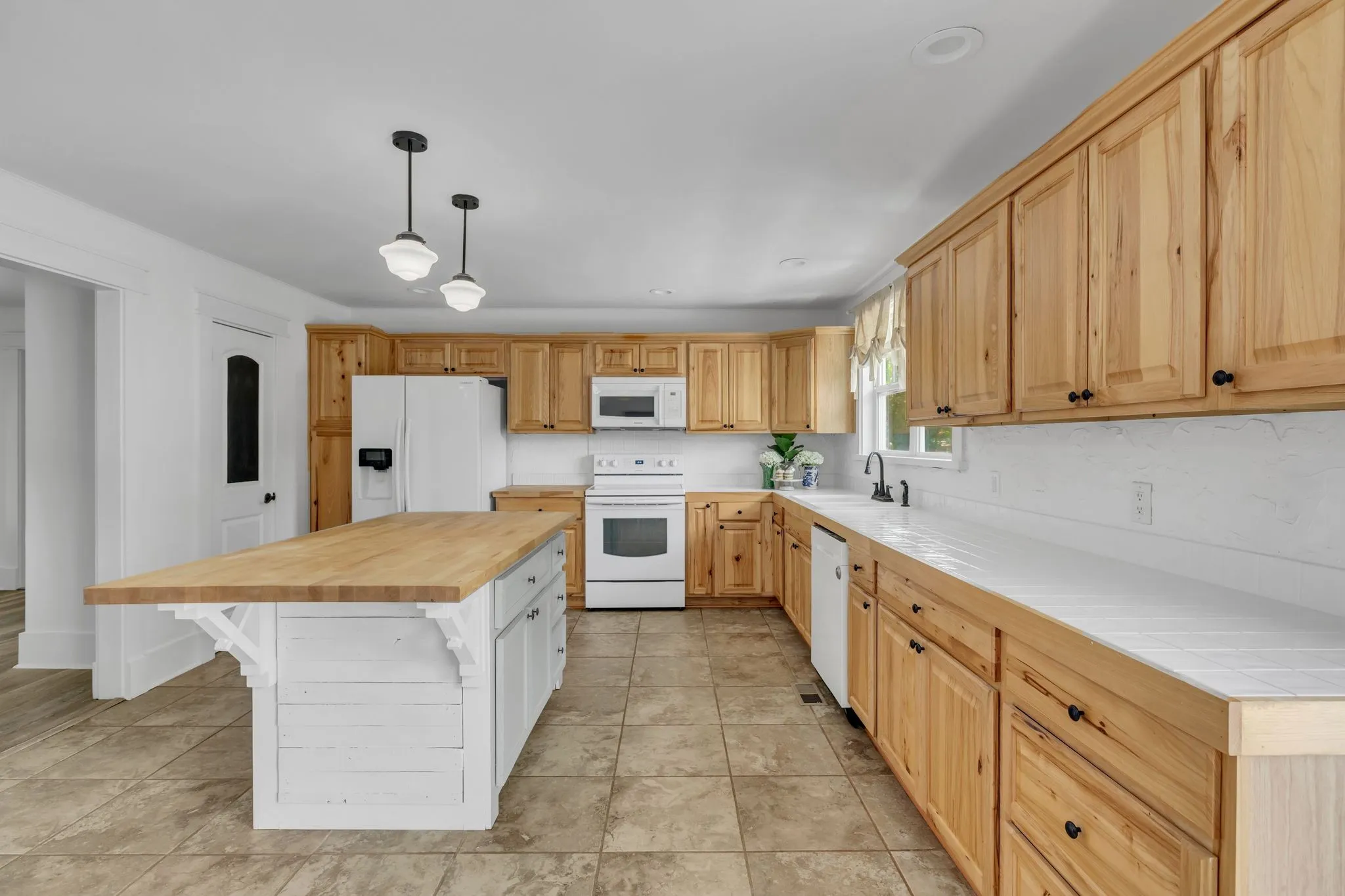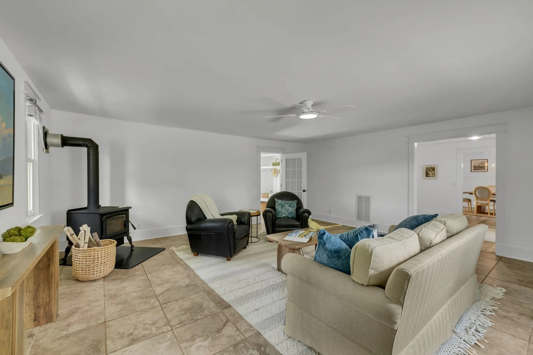 The updated 4-bedroom, 2.5-bath farmhouse blends country charm with modern comfort. Step into the open eat-in kitchen featuring a large island, walk-in pantry, and separate dining room—perfect for relaxed meals after a day on the farm. The inviting living room includes a black coal stove and plenty of space to unwind. A mudroom with an attached laundry area provides a place to kick off your boots when you come in from the barn.