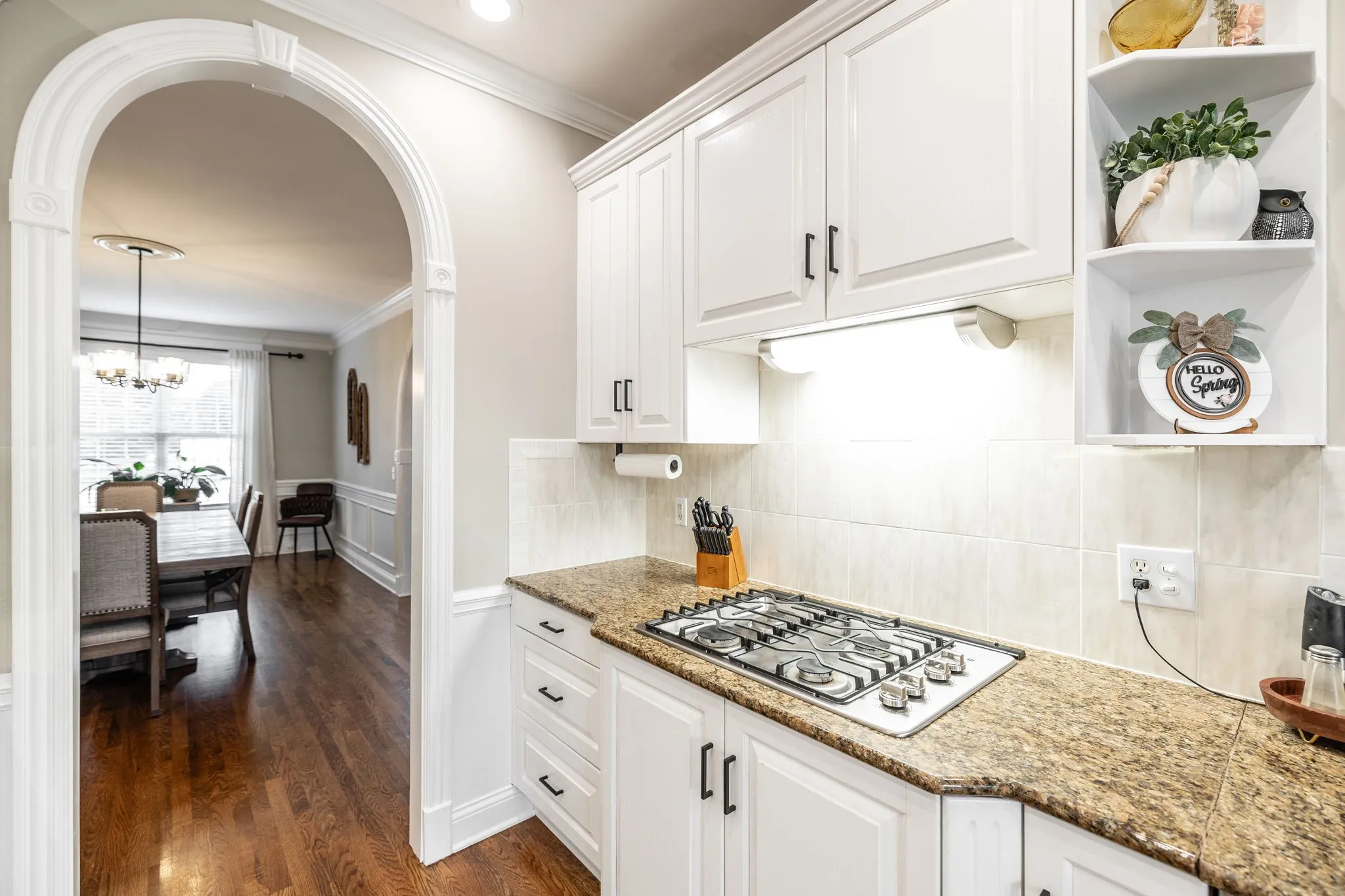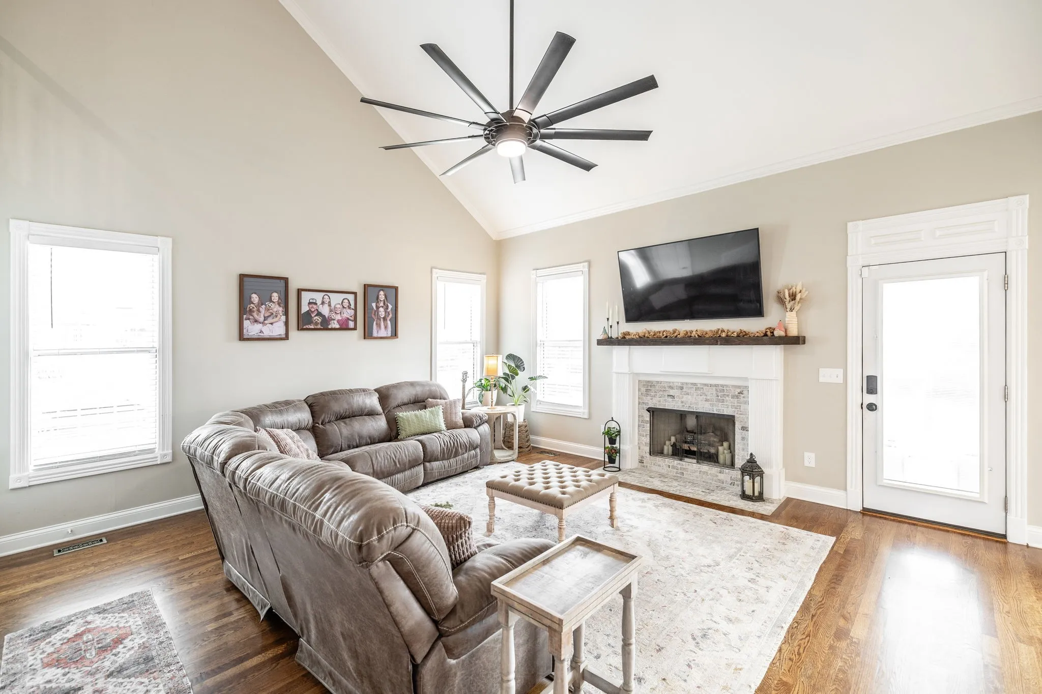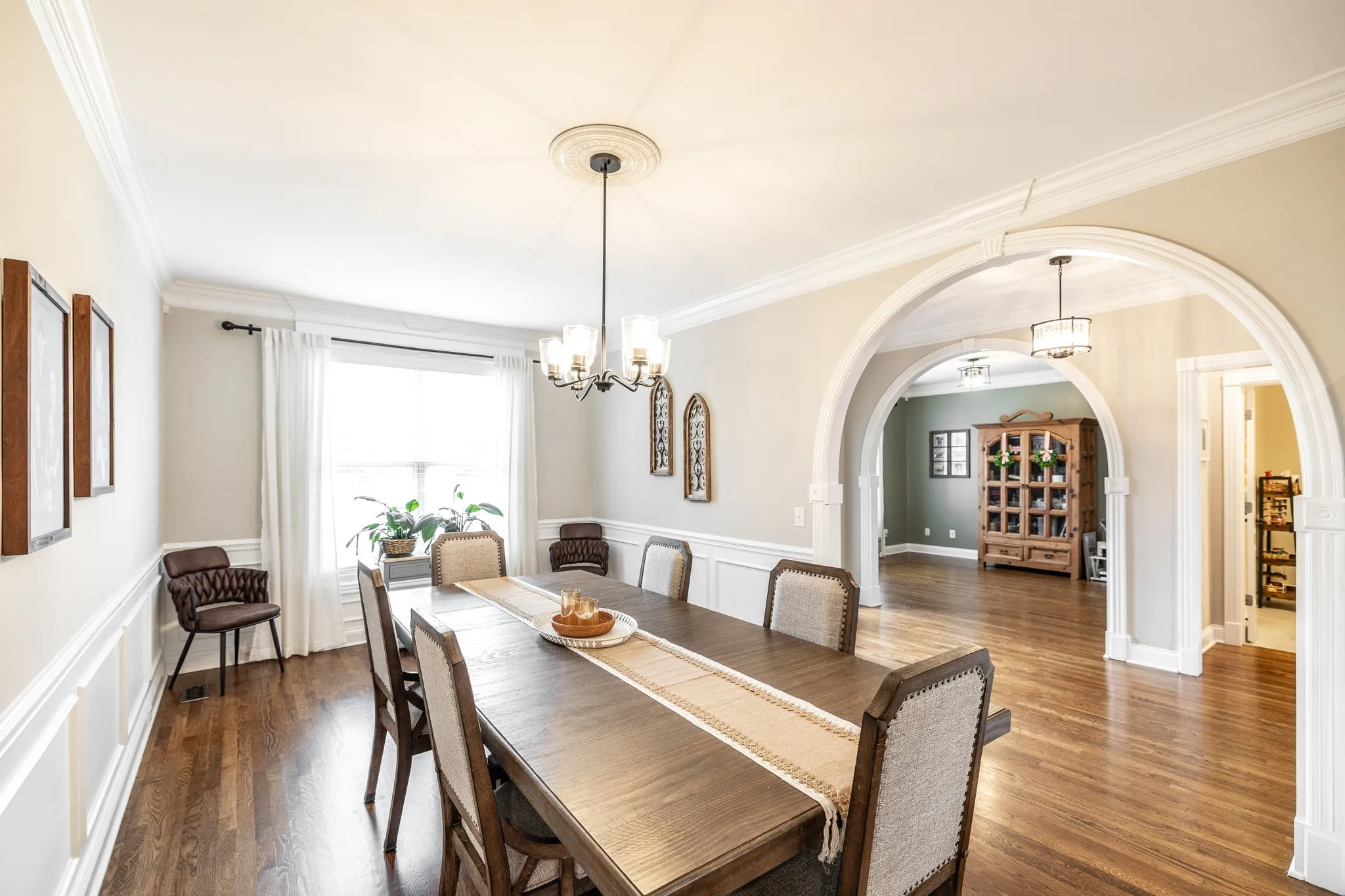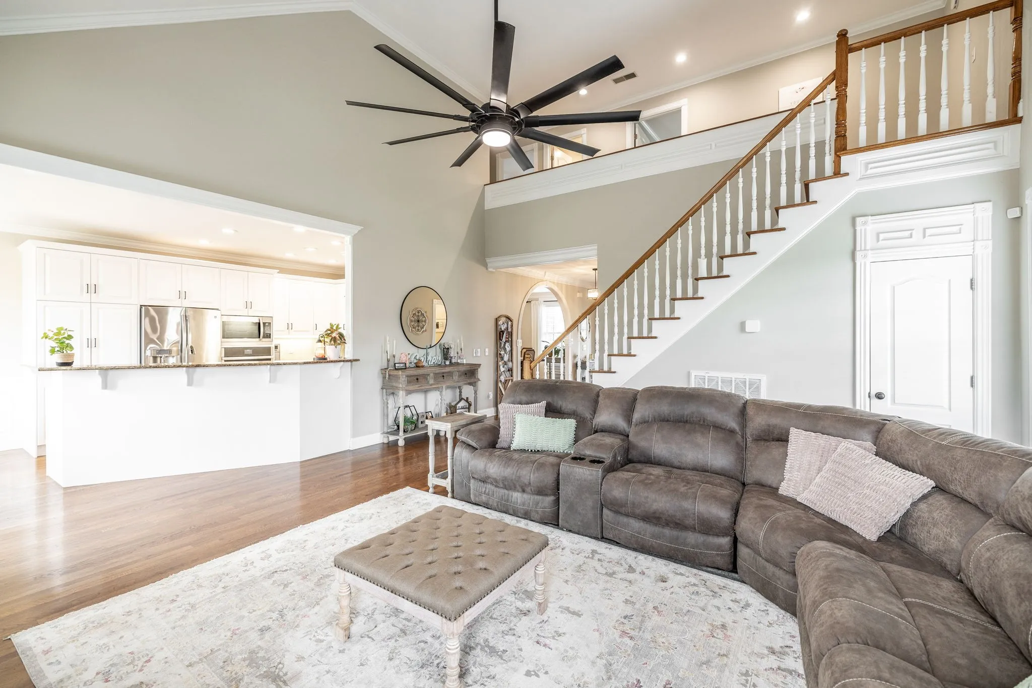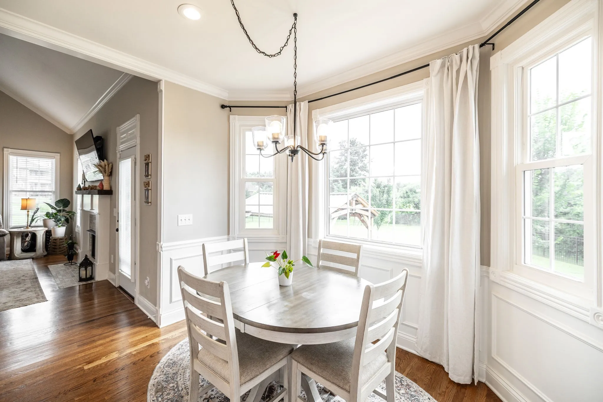 Step inside to soaring ceilings, rich hardwood floors, and custom trim work that highlights elegant arched doorways and bright bay windows. The open living area features a cozy gas fireplace and is filled with natural light. A formal dining room and separate office or flex space offer the versatility to fit your lifestyle.