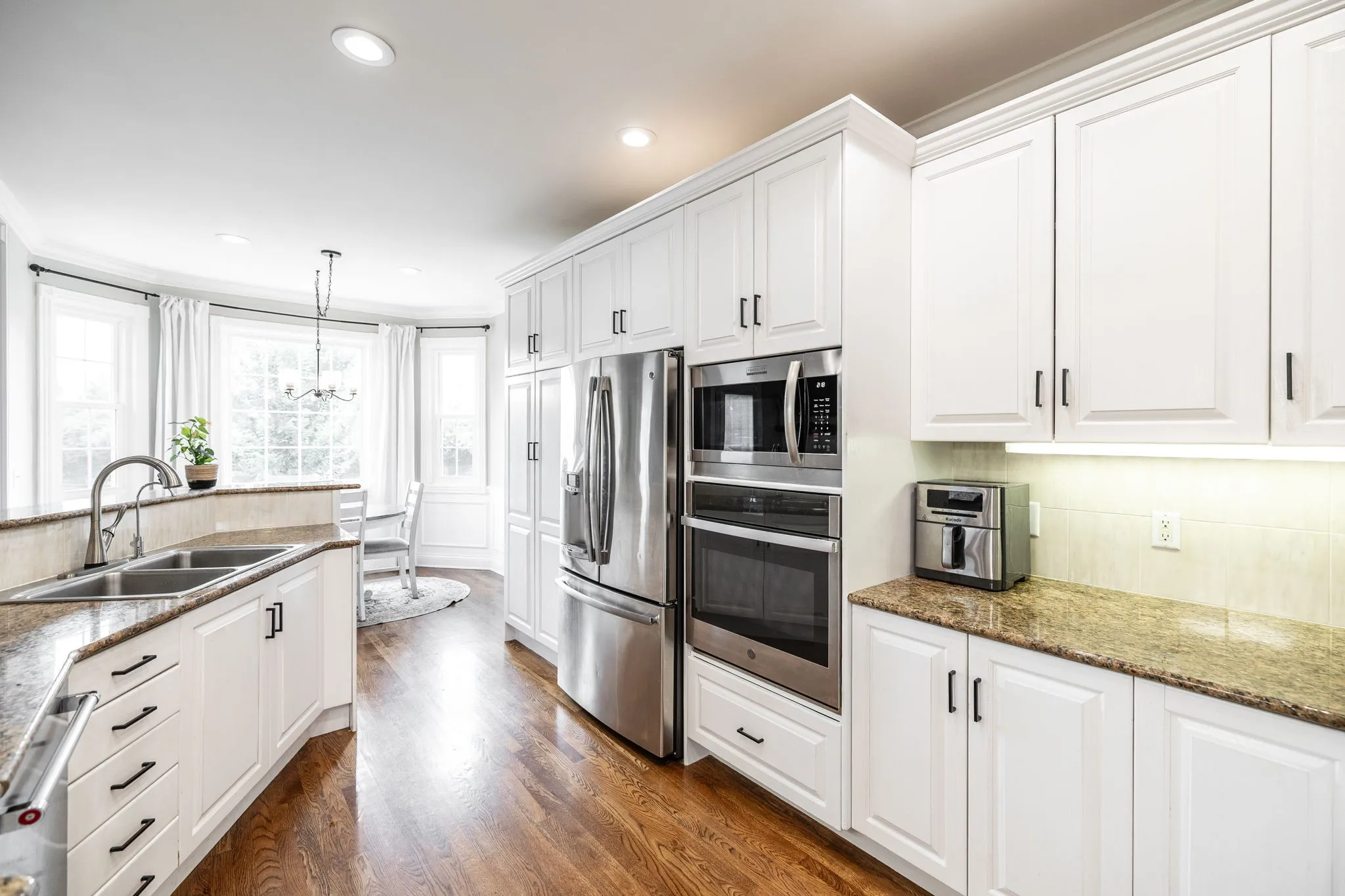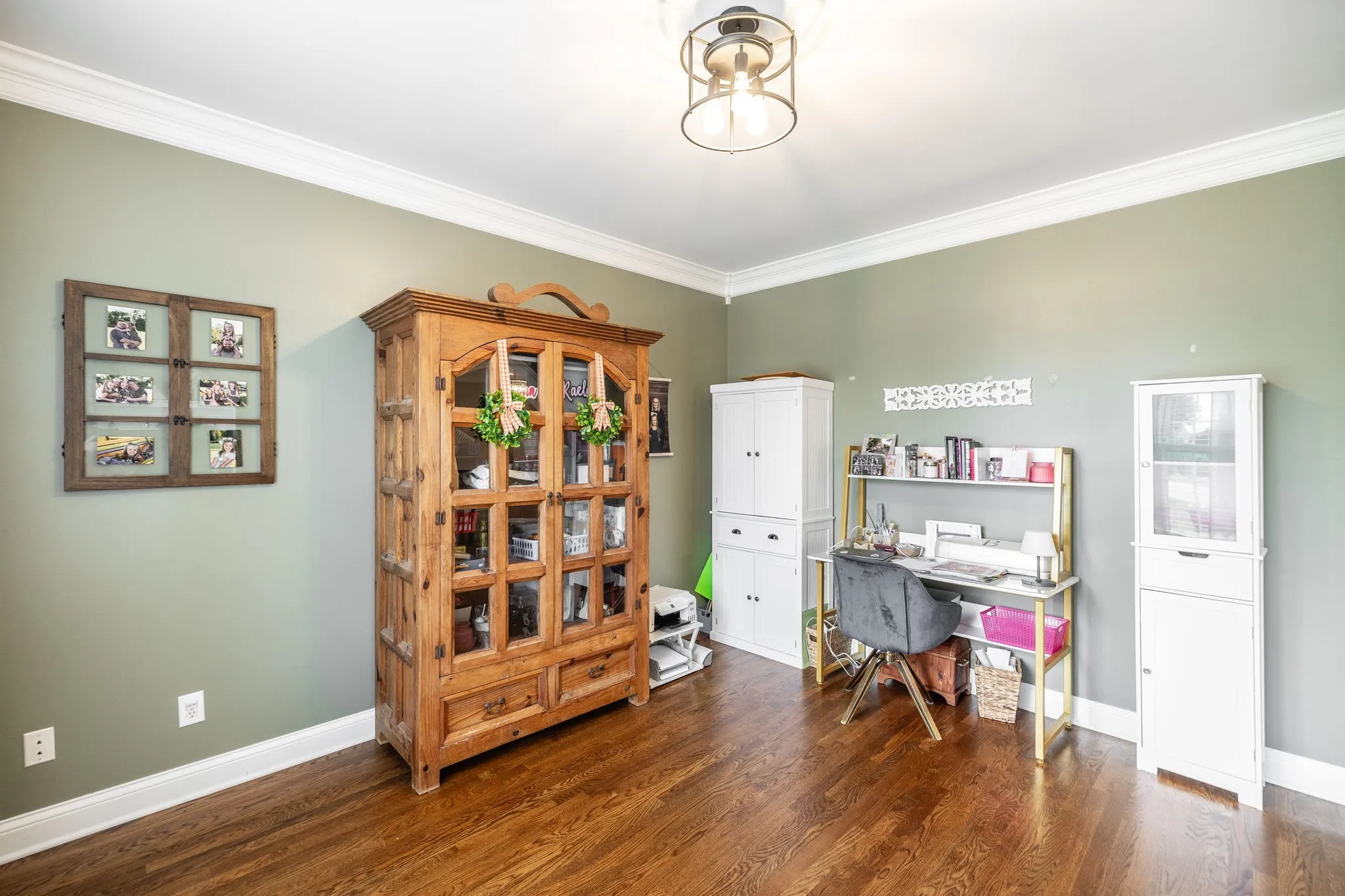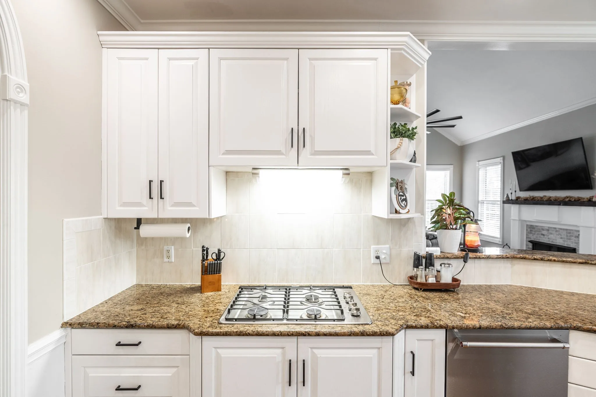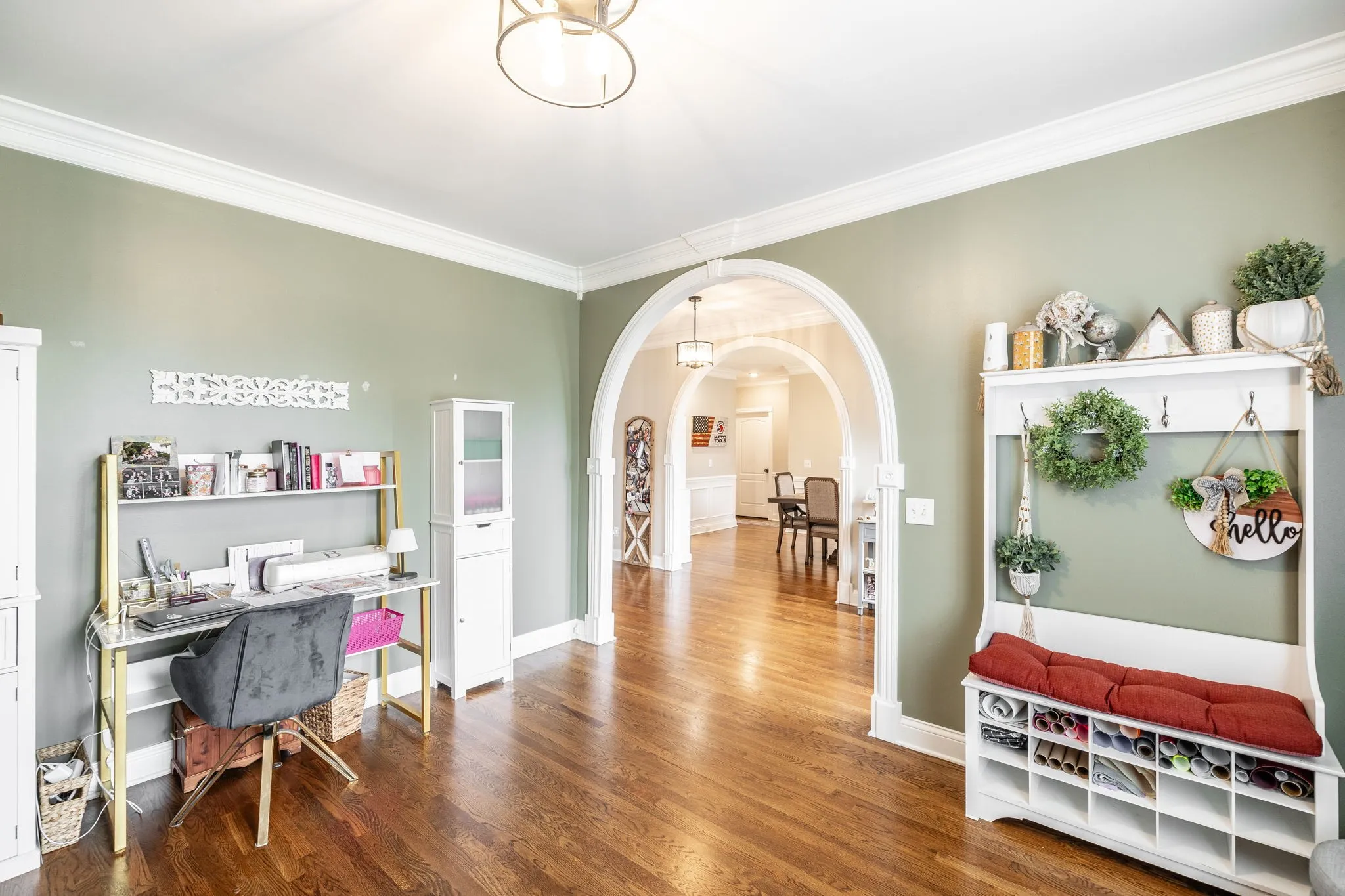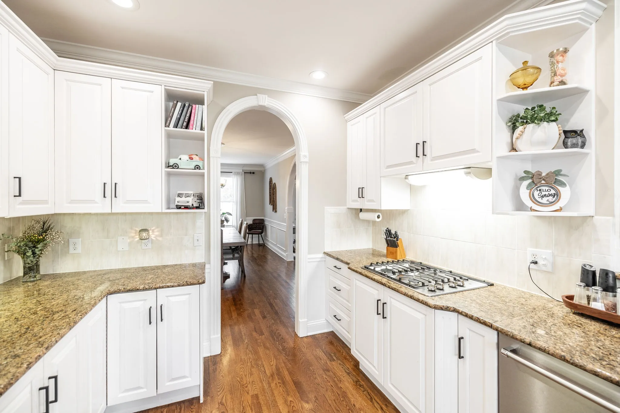 Step inside to soaring ceilings, rich hardwood floors, and custom trim work that highlights elegant arched doorways and bright bay windows. The open living area features a cozy gas fireplace and is filled with natural light. A formal dining room and separate office or flex space offer the versatility to fit your lifestyle.