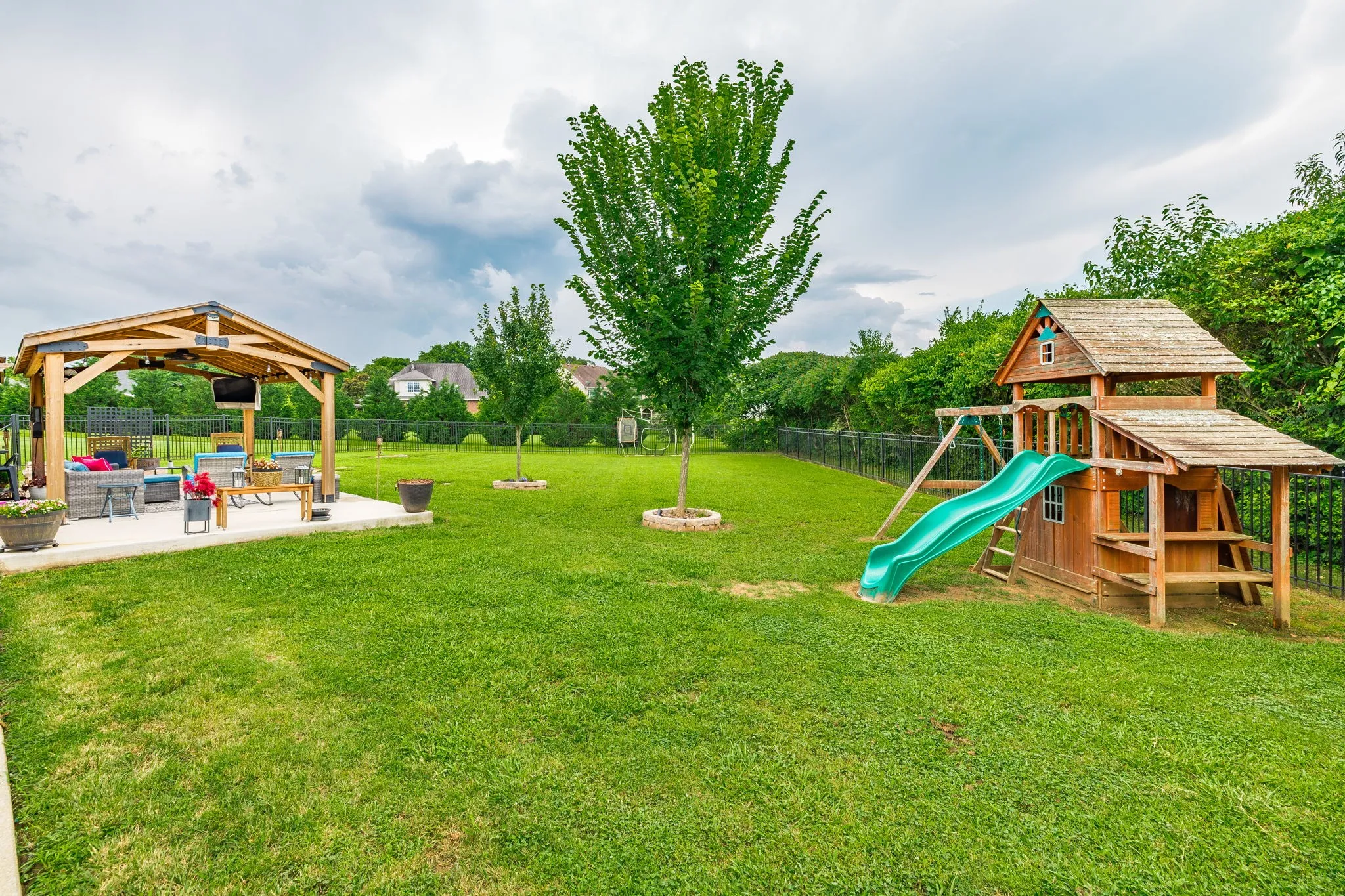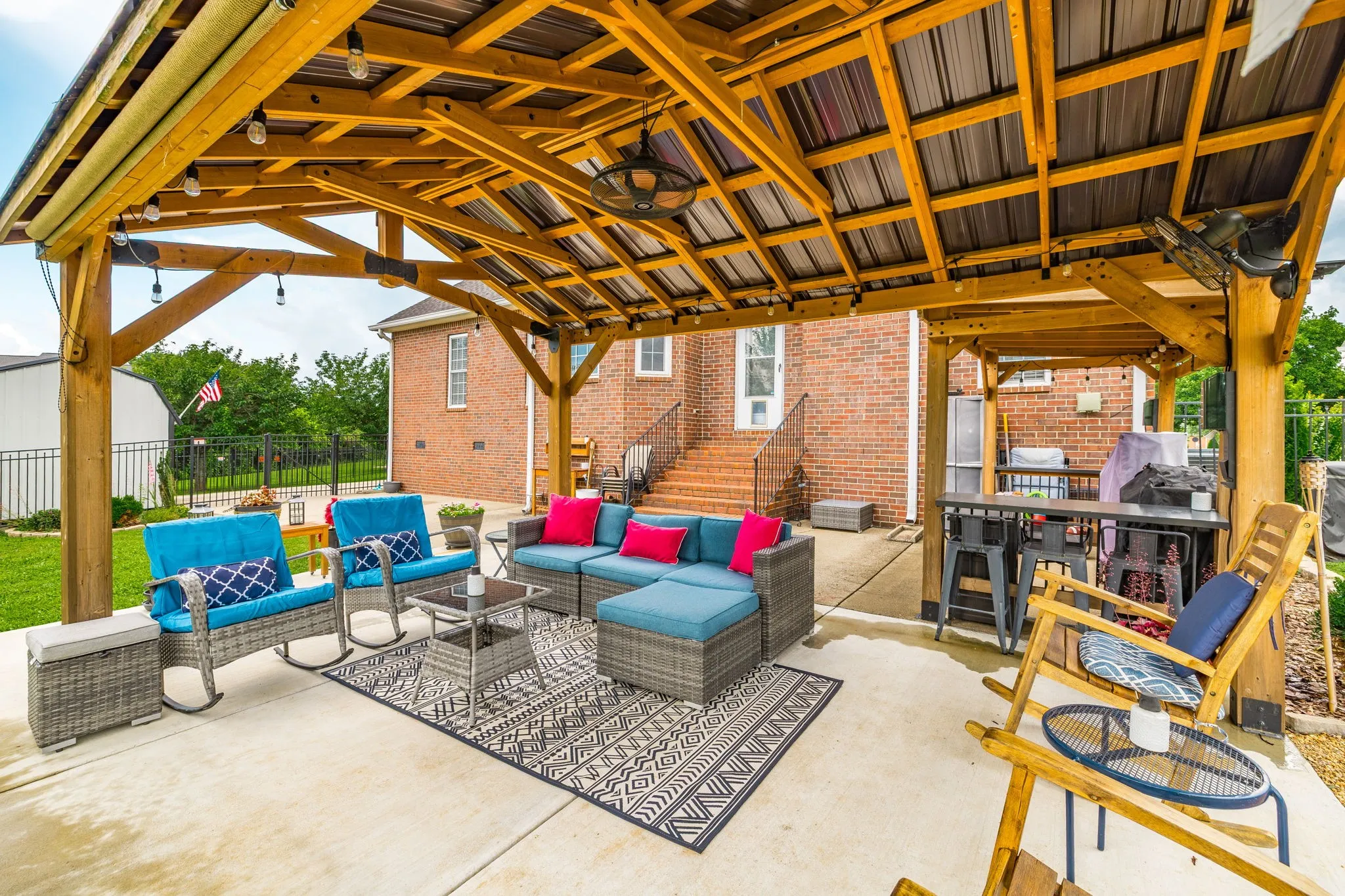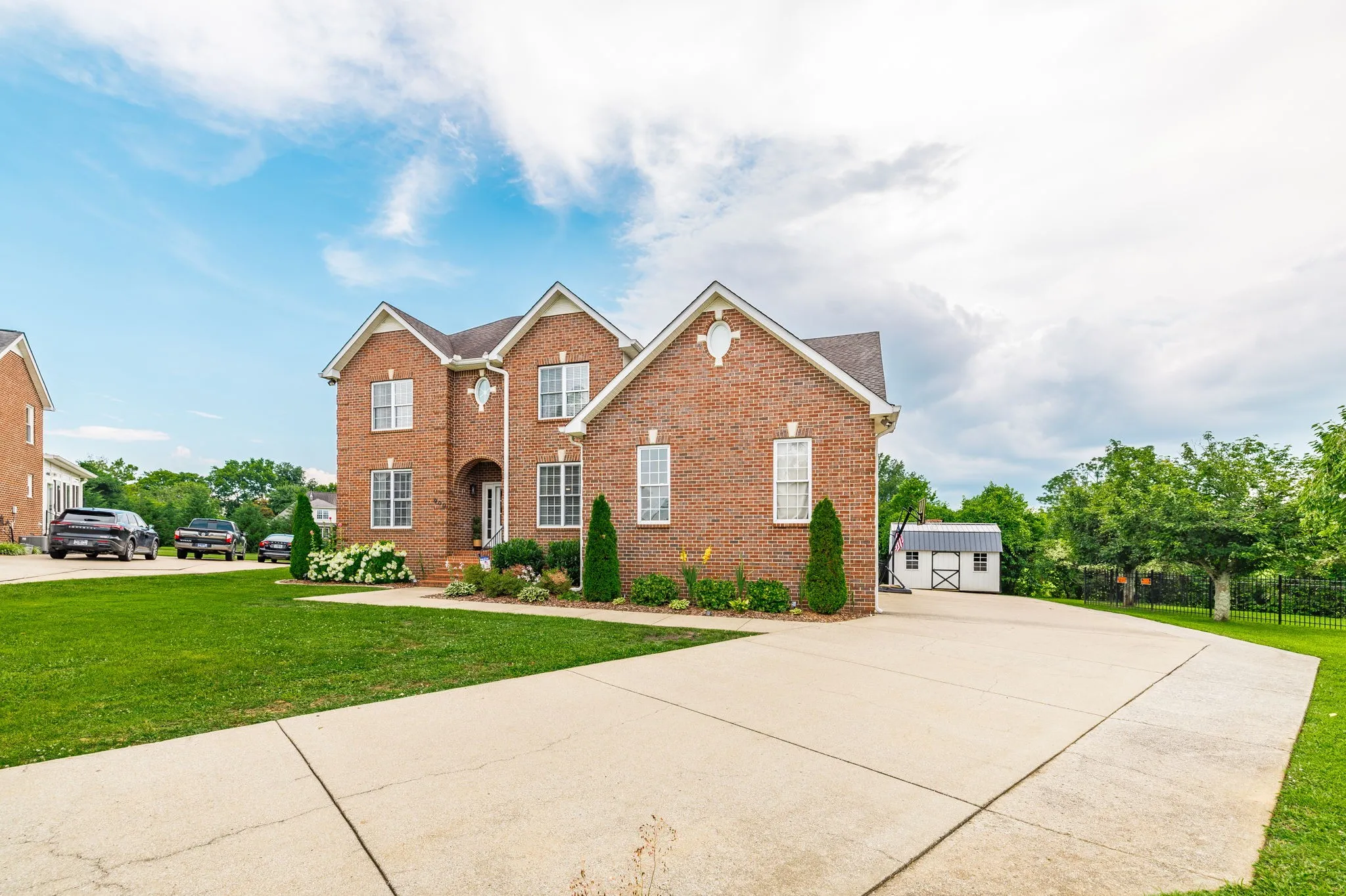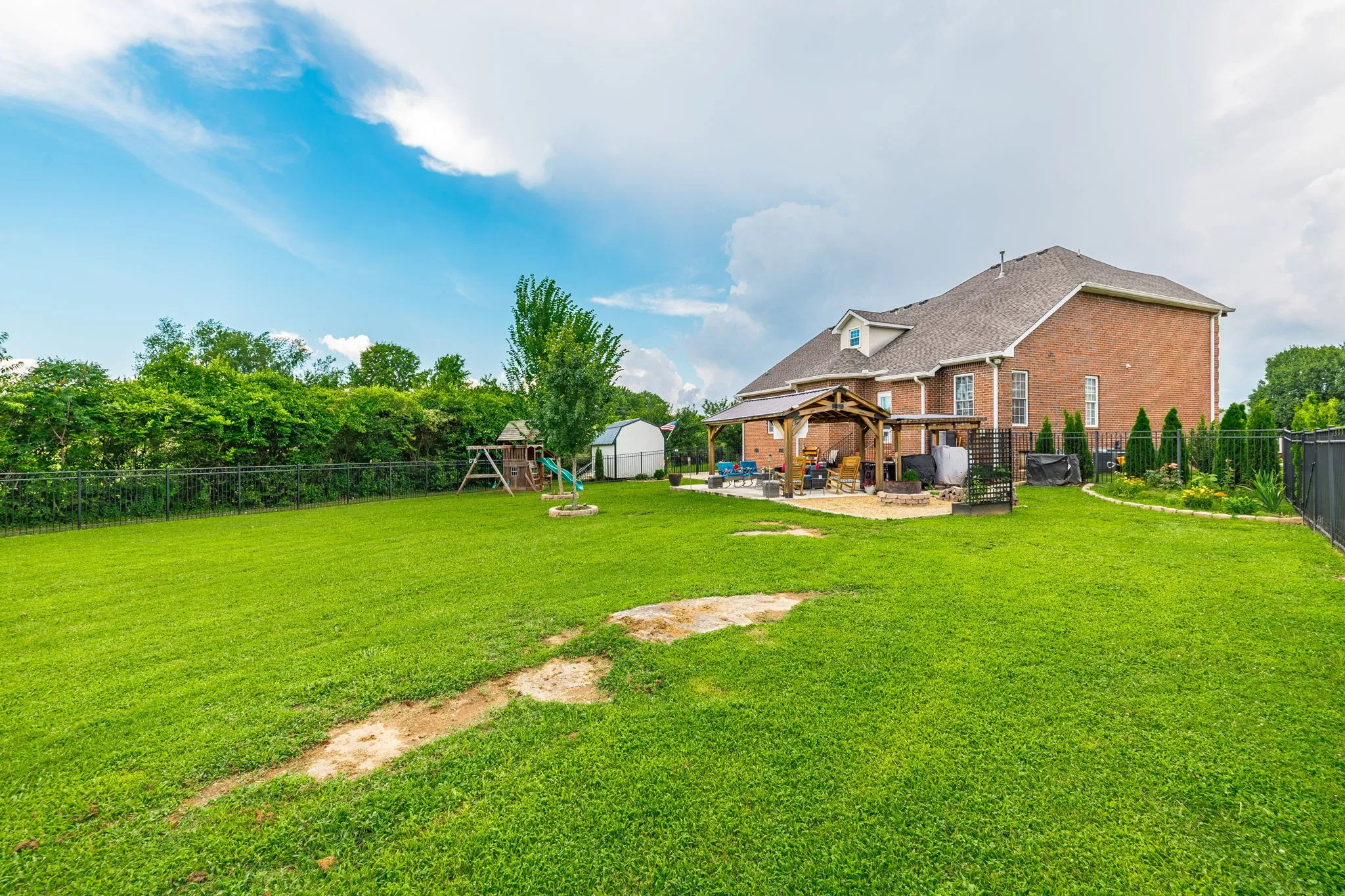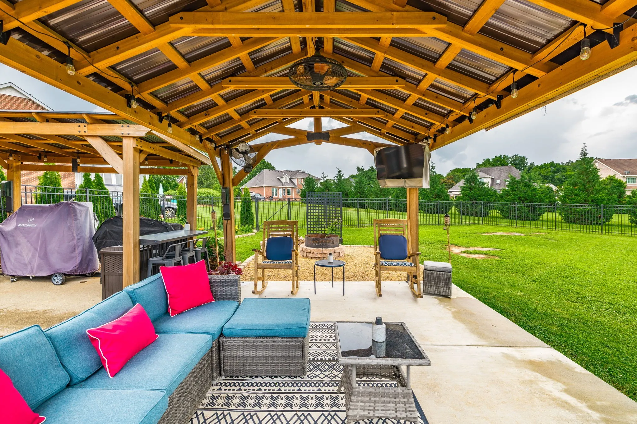 Upstairs, you’ll find a large bonus room and huge walk-in storage, providing space for everyone. Outside, enjoy the ultimate backyard setup with two covered pergolas, a fire pit area, a large outdoor storage shed, and plenty of room to entertain or relax in total privacy.