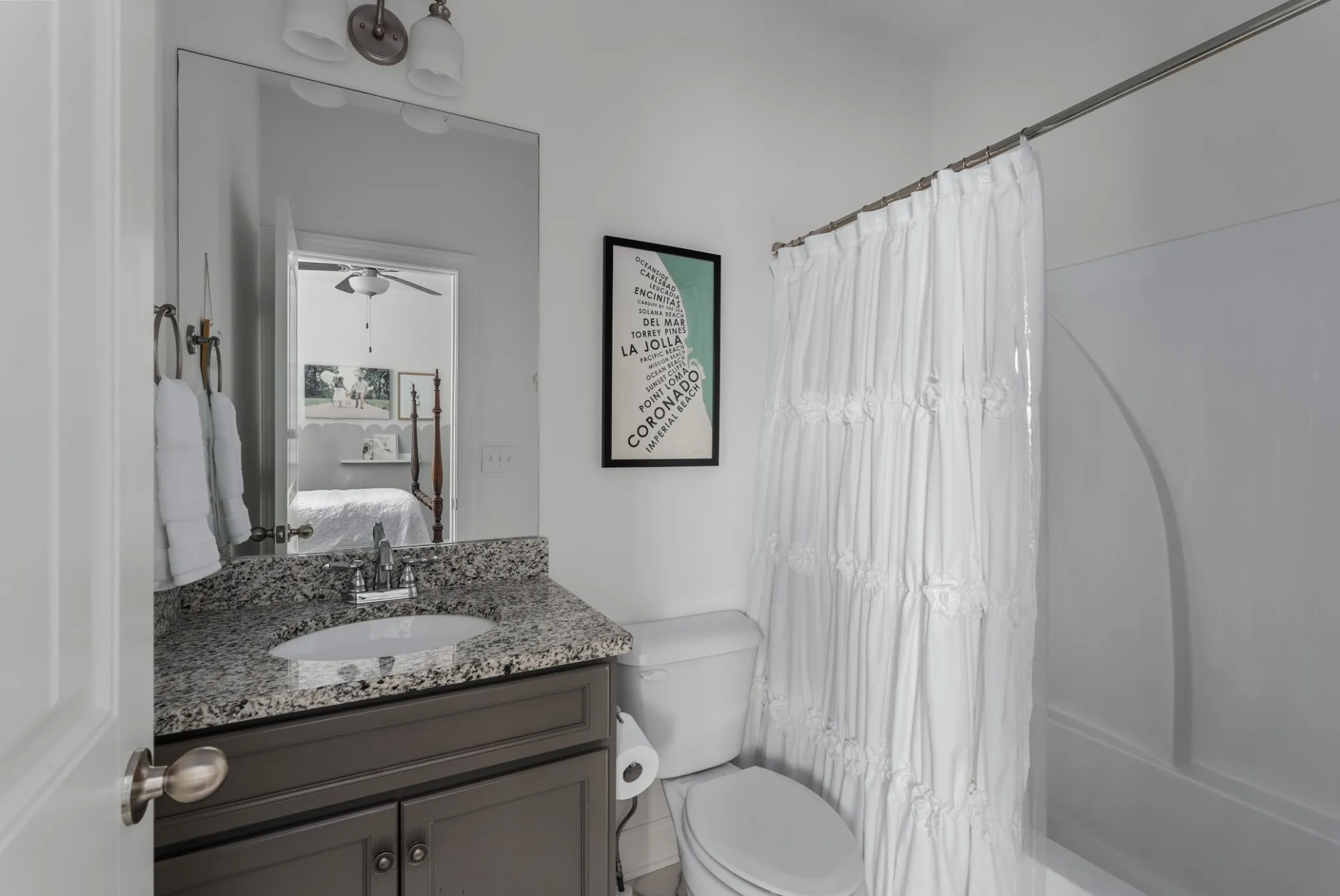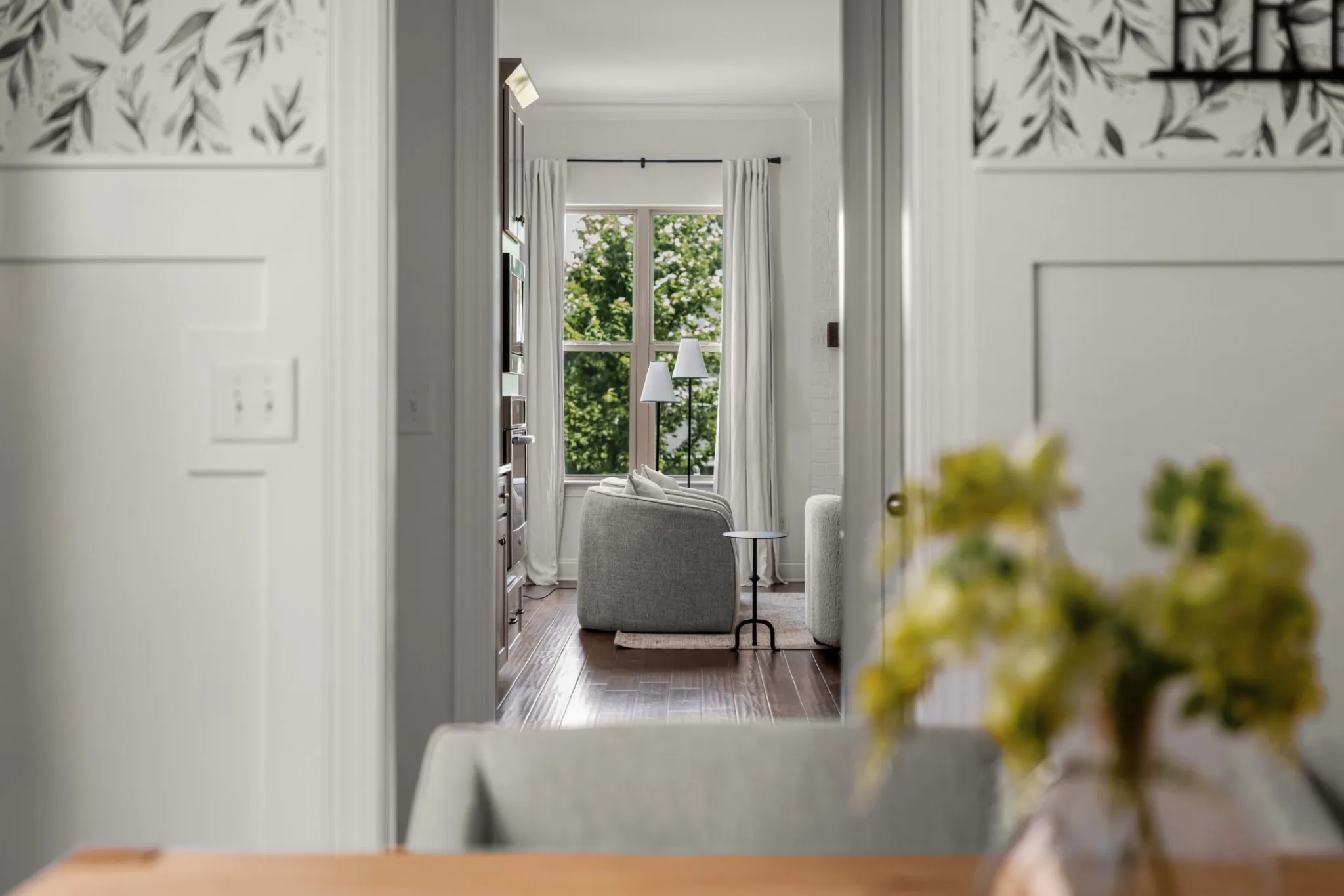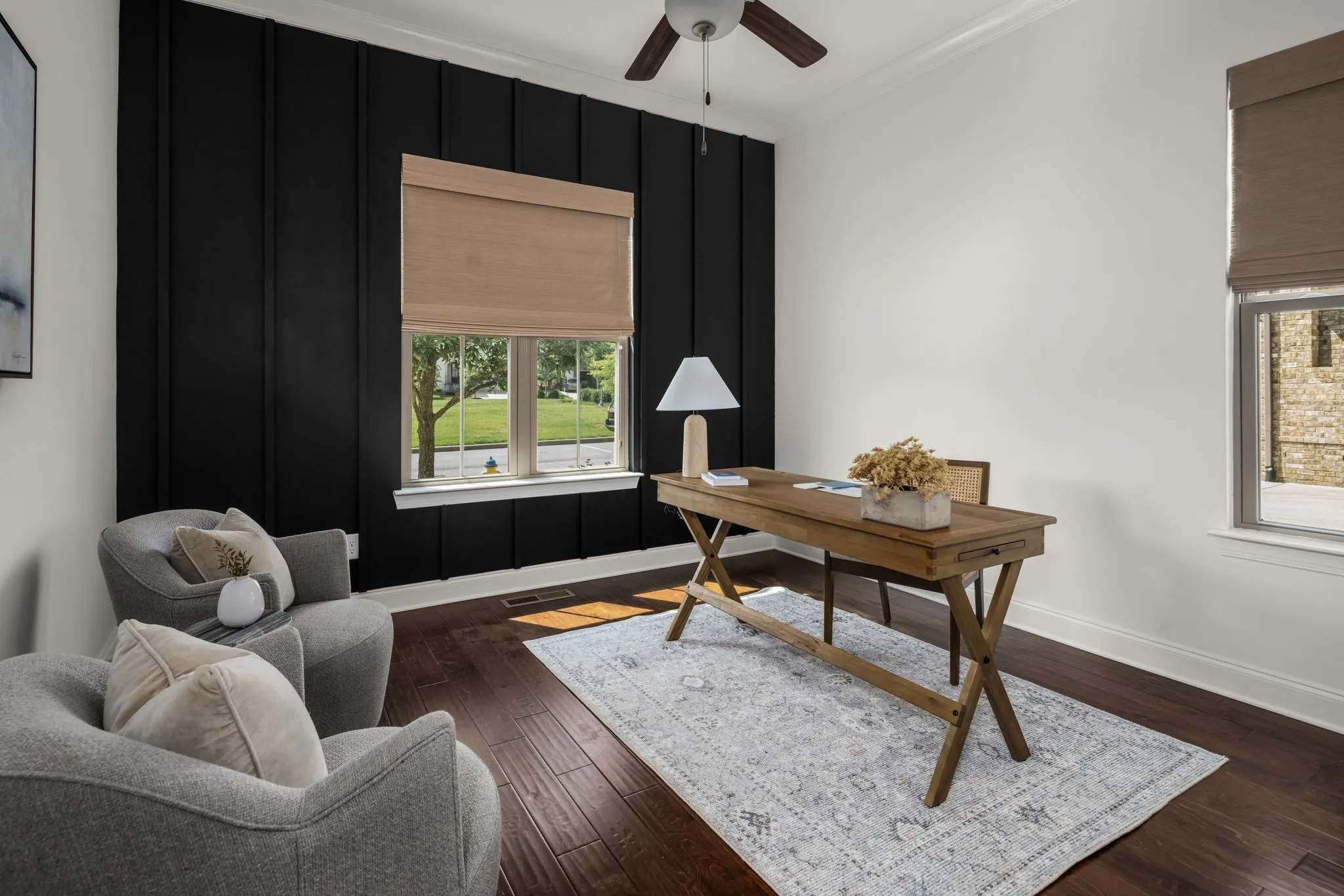 Inside, you'll find brand new designer lighting throughout, adding warmth and sophistication to every room. Rich hardwood floors, custom board-and-batten detailing, calming natural tones, and fresh kitchen hardware elevate the home's style. The spacious main level features a serene primary suite with a spa-inspired bath, including an oversized tile shower and a separate soaking tub.\n