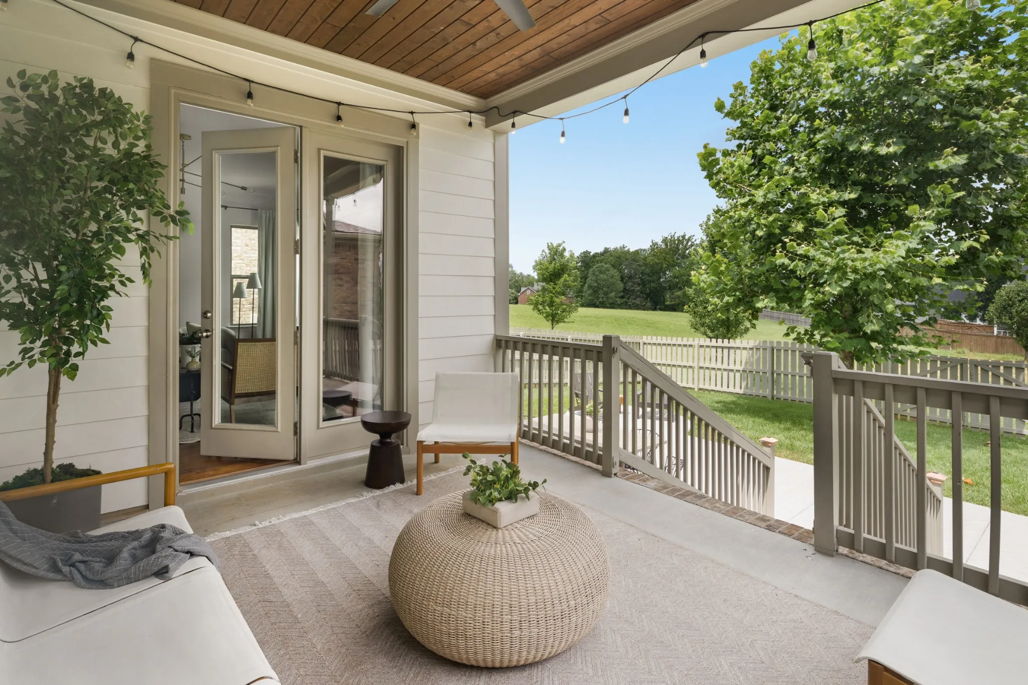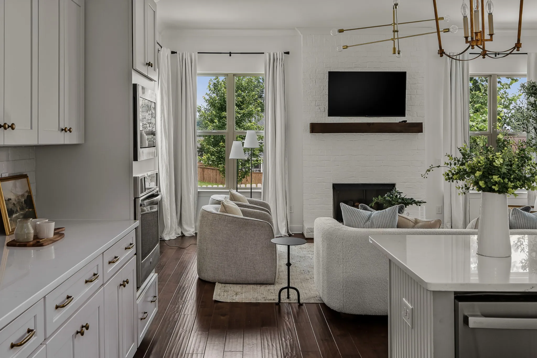 The open-concept kitchen is both stylish and functional, with a generous island, quartz countertops, a butler’s pantry, a large walk-in pantry, and a brand new dishwasher—perfect for everyday life and entertaining. The living area, anchored by a stunning floor-to-ceiling brick fireplace, flows seamlessly to the large outdoor covered porch with a new patio and fenced backyard below, designed for outdoor living at its best.\n
