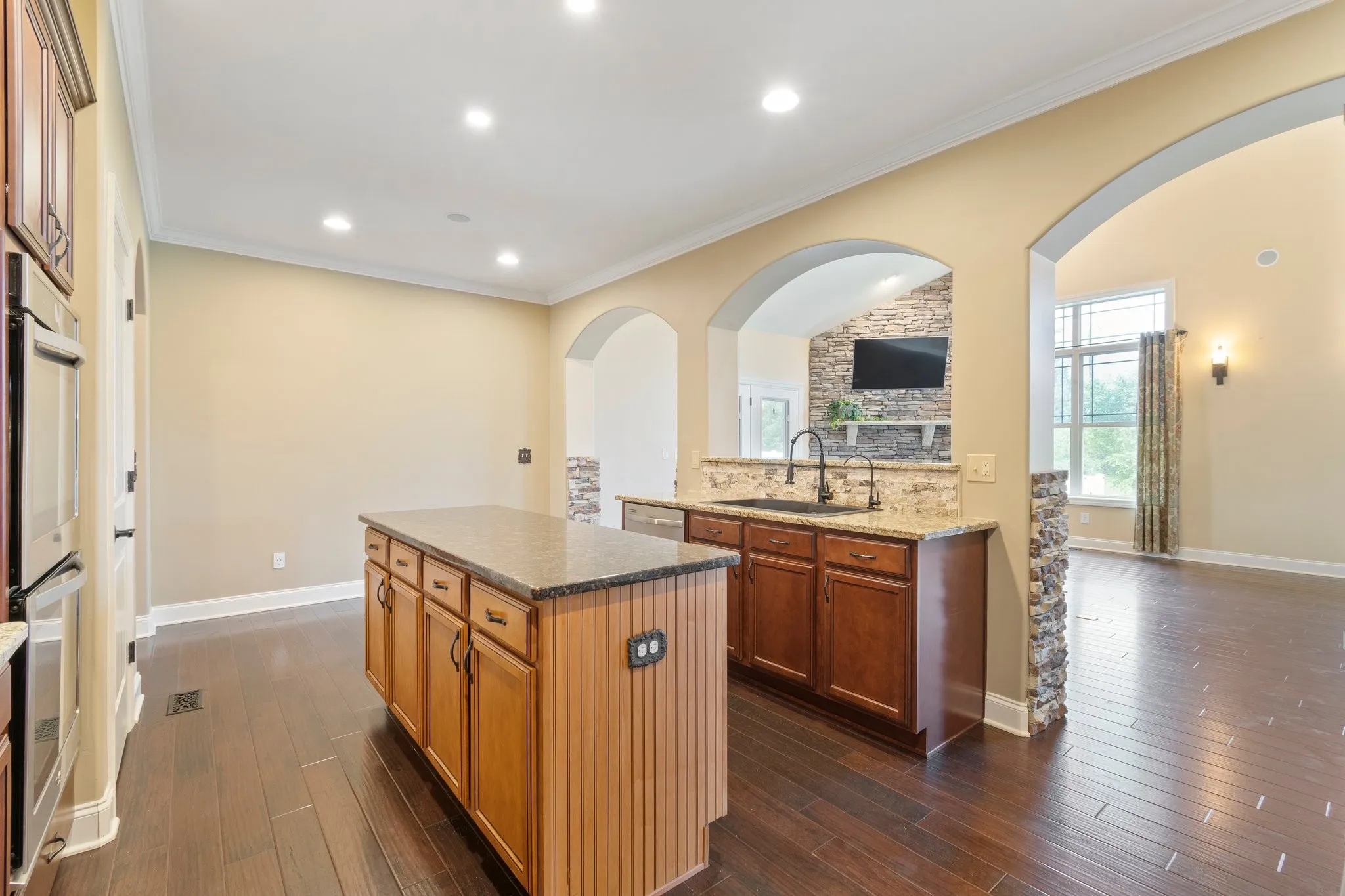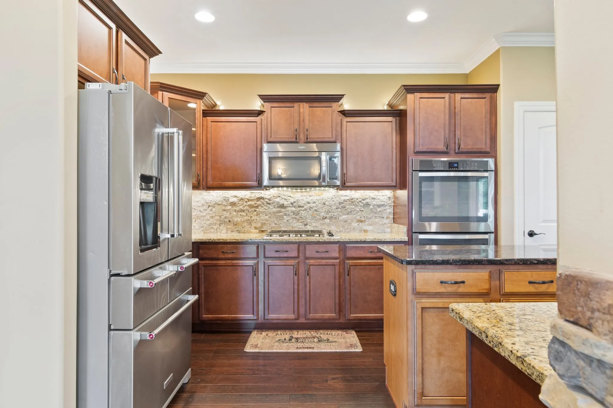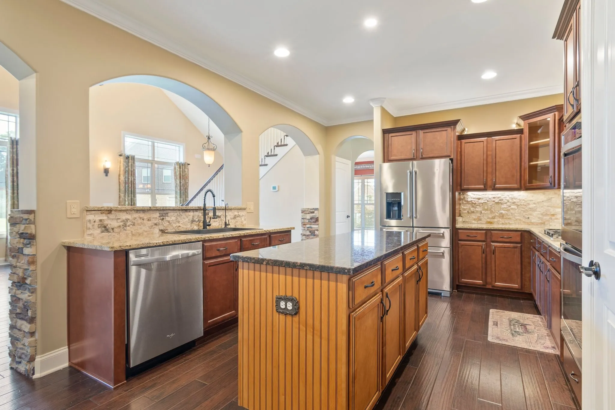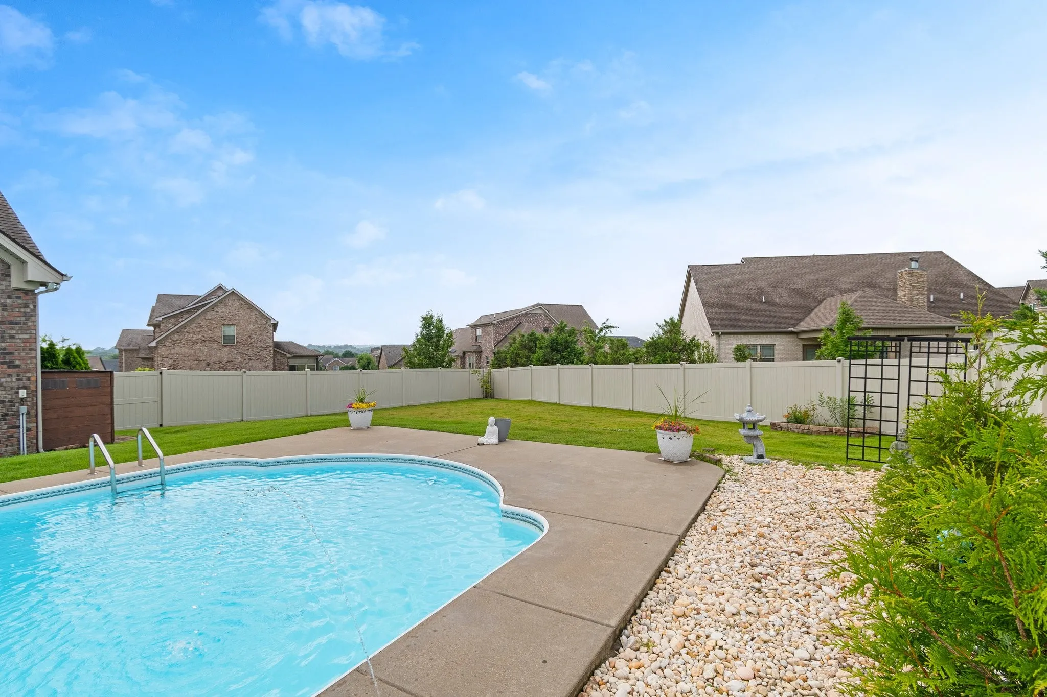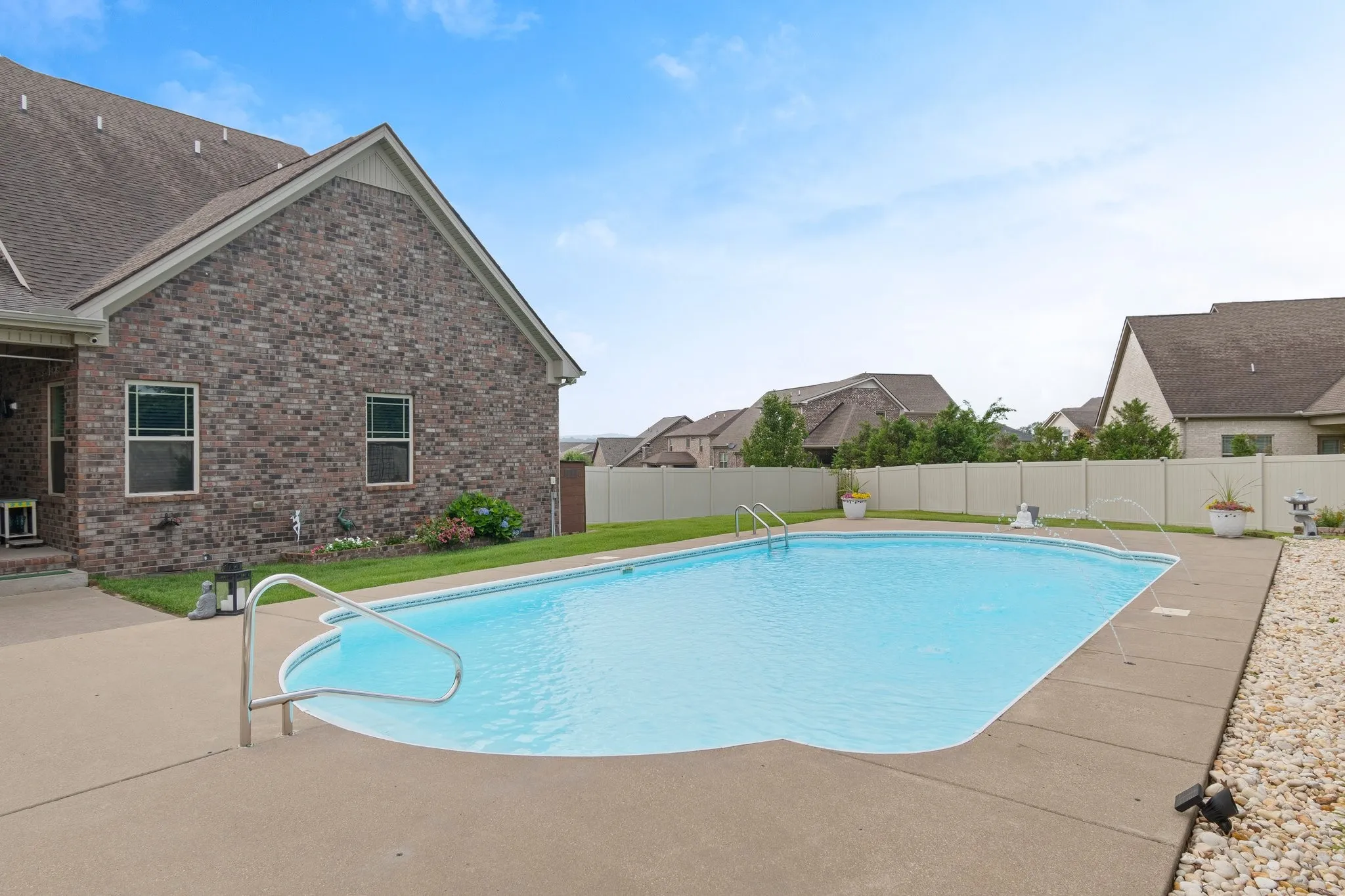 5 Bed, 4 Bath home with Heated Saltwater Pool on Half-acre Cul-de-Sac lot! Enjoy effortless living with a main-level primary suite, boasting double sinks with granite counters, a separate tiled shower, a soaking tub, and a custom closet. A second main-level bedroom and full bath offer ideal guest accommodations or flexible multi-generational living options. The heart of the home is a chef’s dream kitchen, featuring an abundance of cabinets, granite countertops, a pantry, a breakfast nook, and a spacious island. The stainless-steel appliances include double ovens, a gas cooktop, microwave, dishwasher, and refrigerator. The open bar area seamlessly connects to the inviting living room, complete with a cozy wood-burning stone fireplace. The upper level offers a versatile bonus room, perfect for entertaining or relaxing, enhanced by a wet bar featuring cabinets, a sink, granite countertop, and a mini refrigerator. This level also includes a private suite with a walk-in closet and en-suite bath with granite countertops, plus two additional spacious bedrooms sharing a bathroom with double vanities and granite countertops. Step outside to your own backyard oasis, designed for both relaxation and recreation. A covered, screened porch offers a tranquil escape, while the heated, saltwater pool takes center stage, complete with stunning lighting and fountains for a resort-like atmosphere. The expansive yard space is perfect for outdoor activities or simply unwinding by the fire pit. This meticulously maintained, one-owner home provides turnkey living, featuring a water filtration system and reverse osmosis. Don’t miss the opportunity to experience the exceptional lifestyle this Williamson County home offers. Schedule your private showing today!