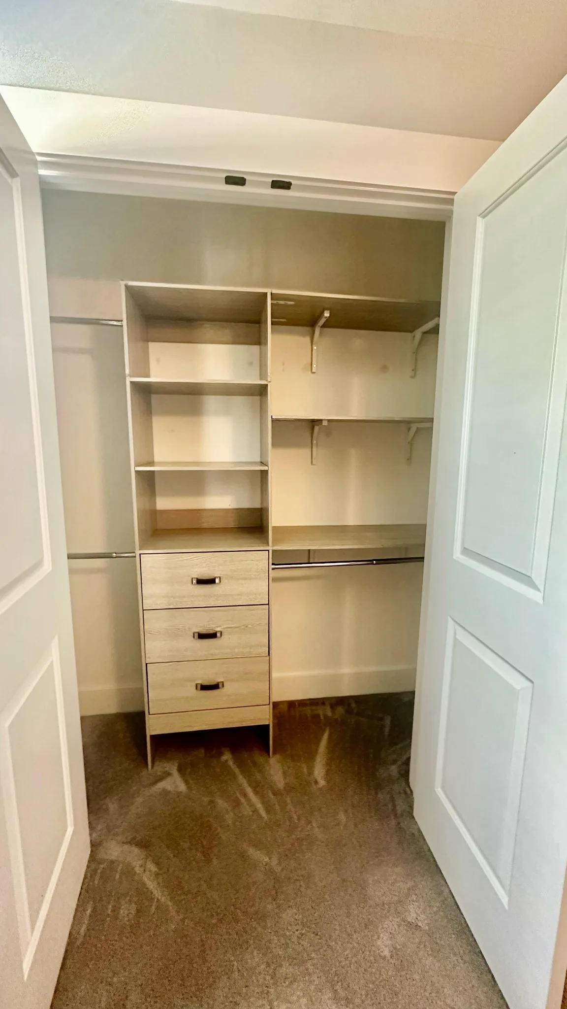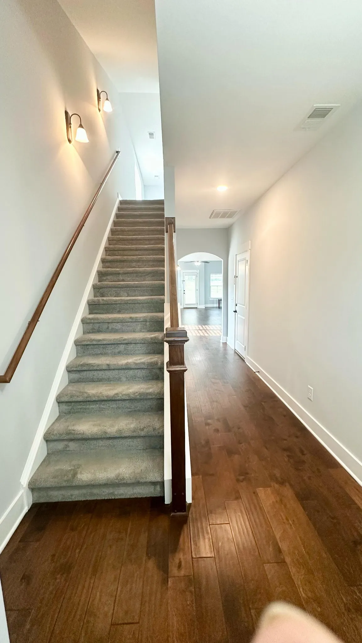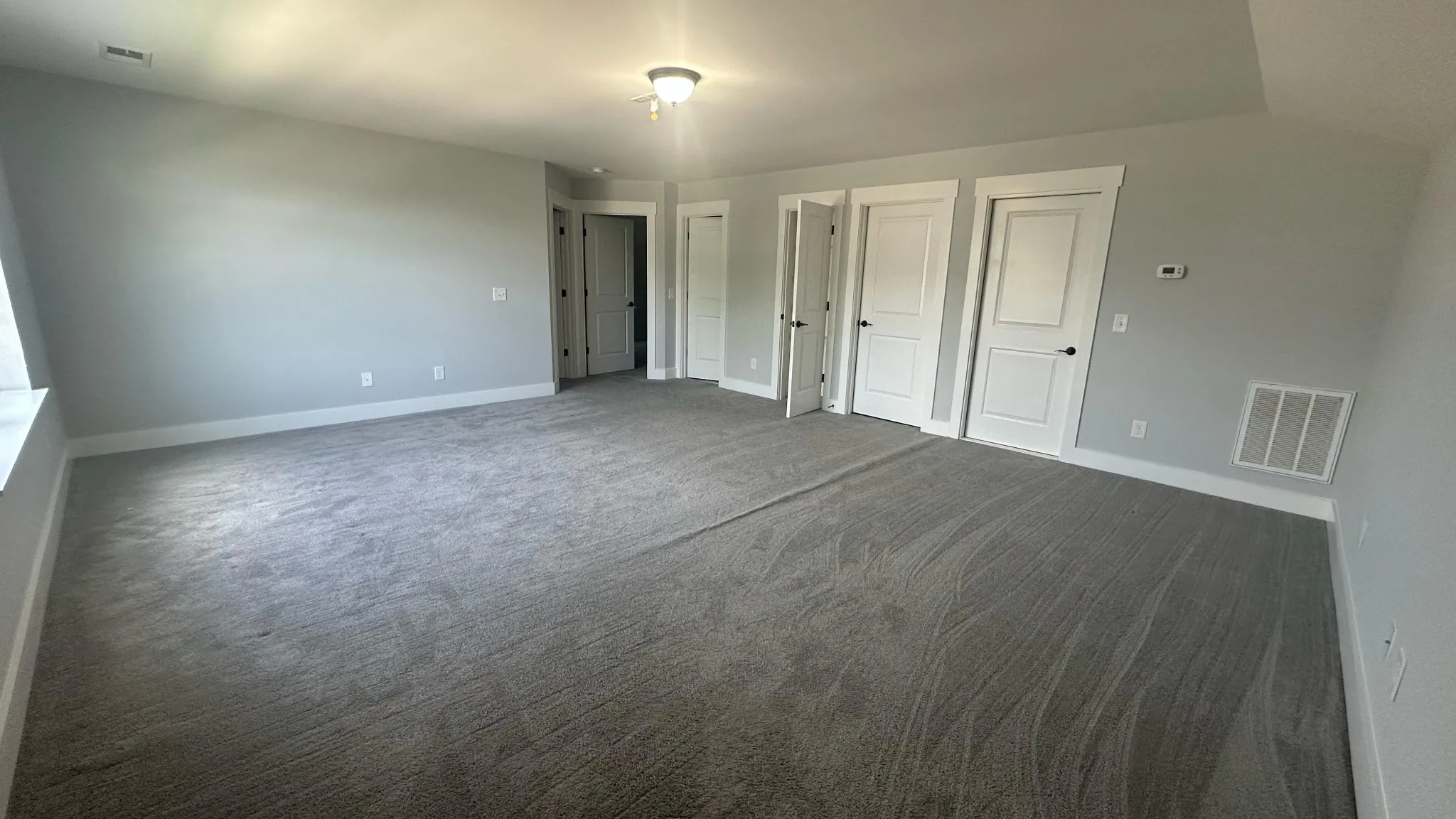Hardwood-style flooring and plush bedroom carpeting
