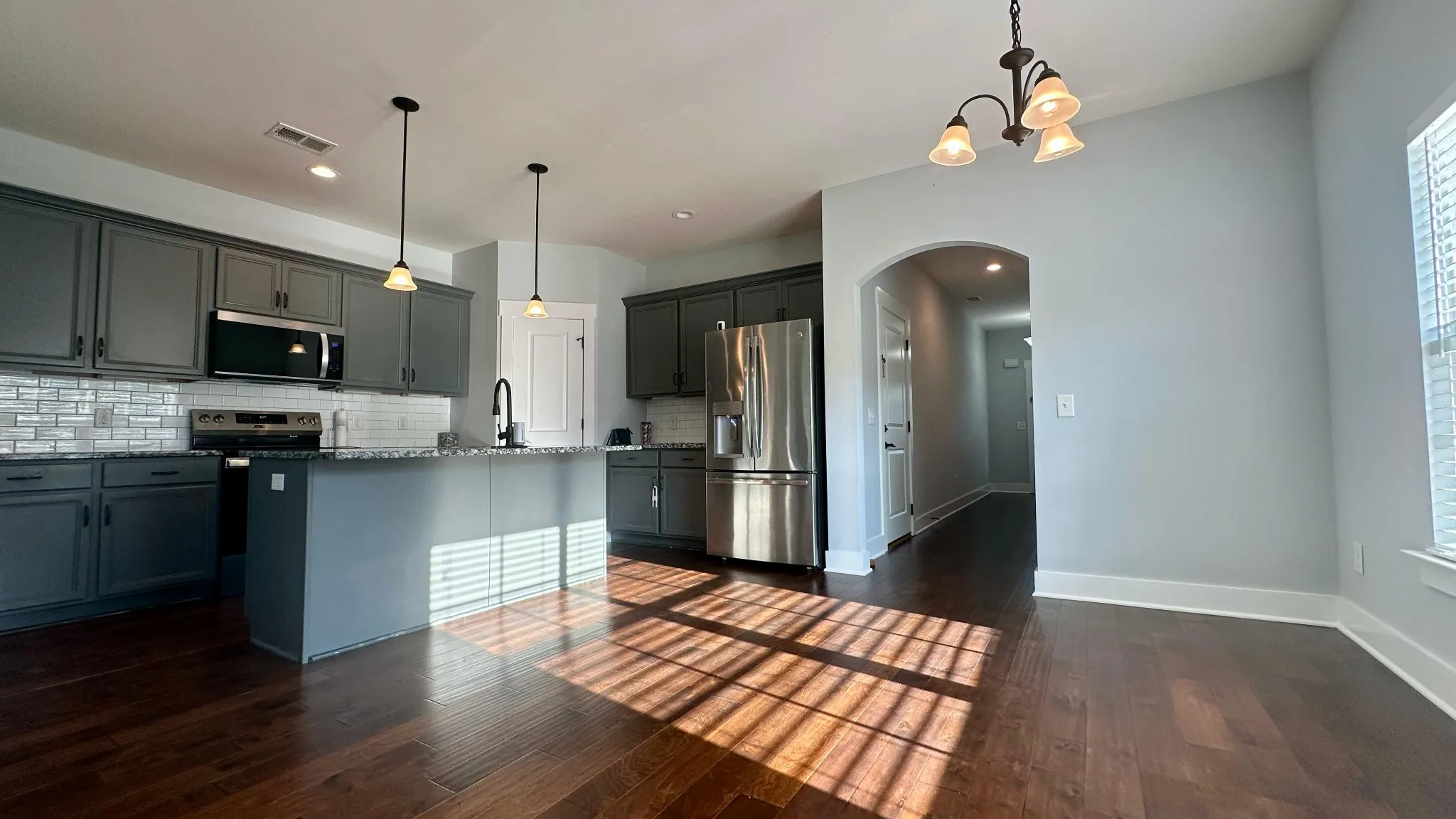 Stylish kitchen with stainless steel appliances, granite countertops, and a central island
