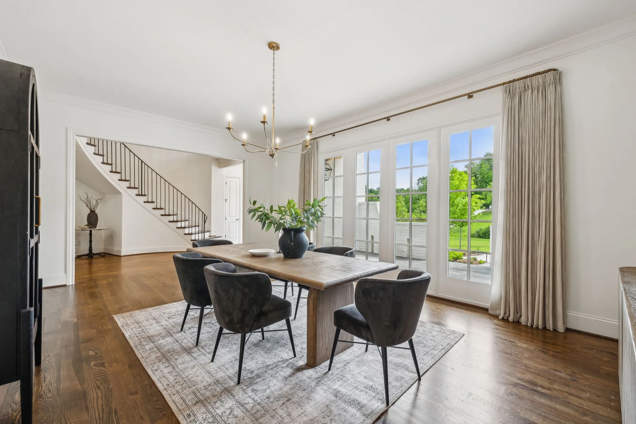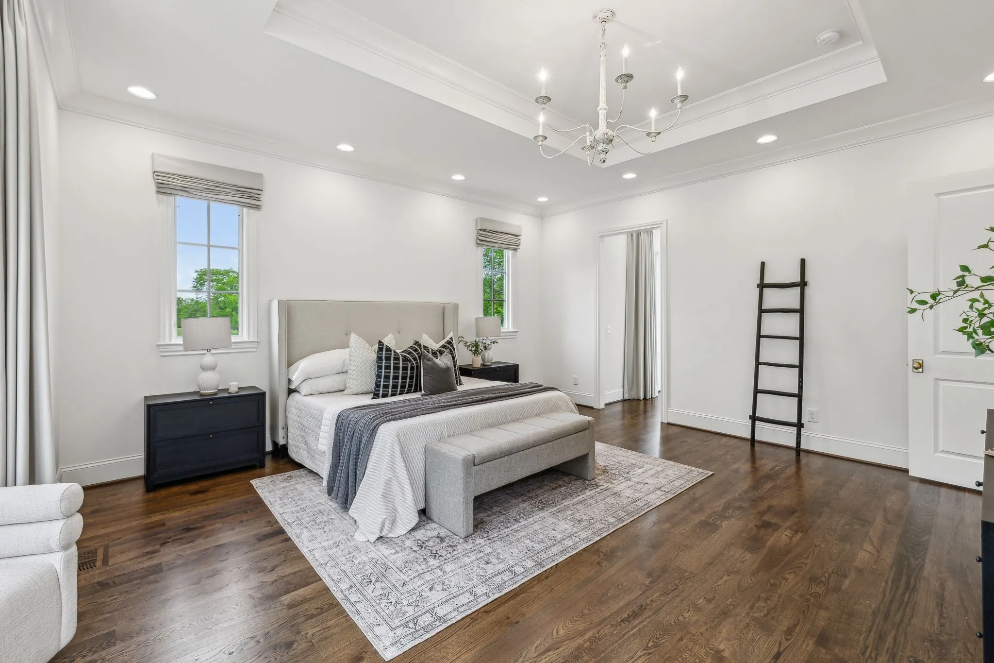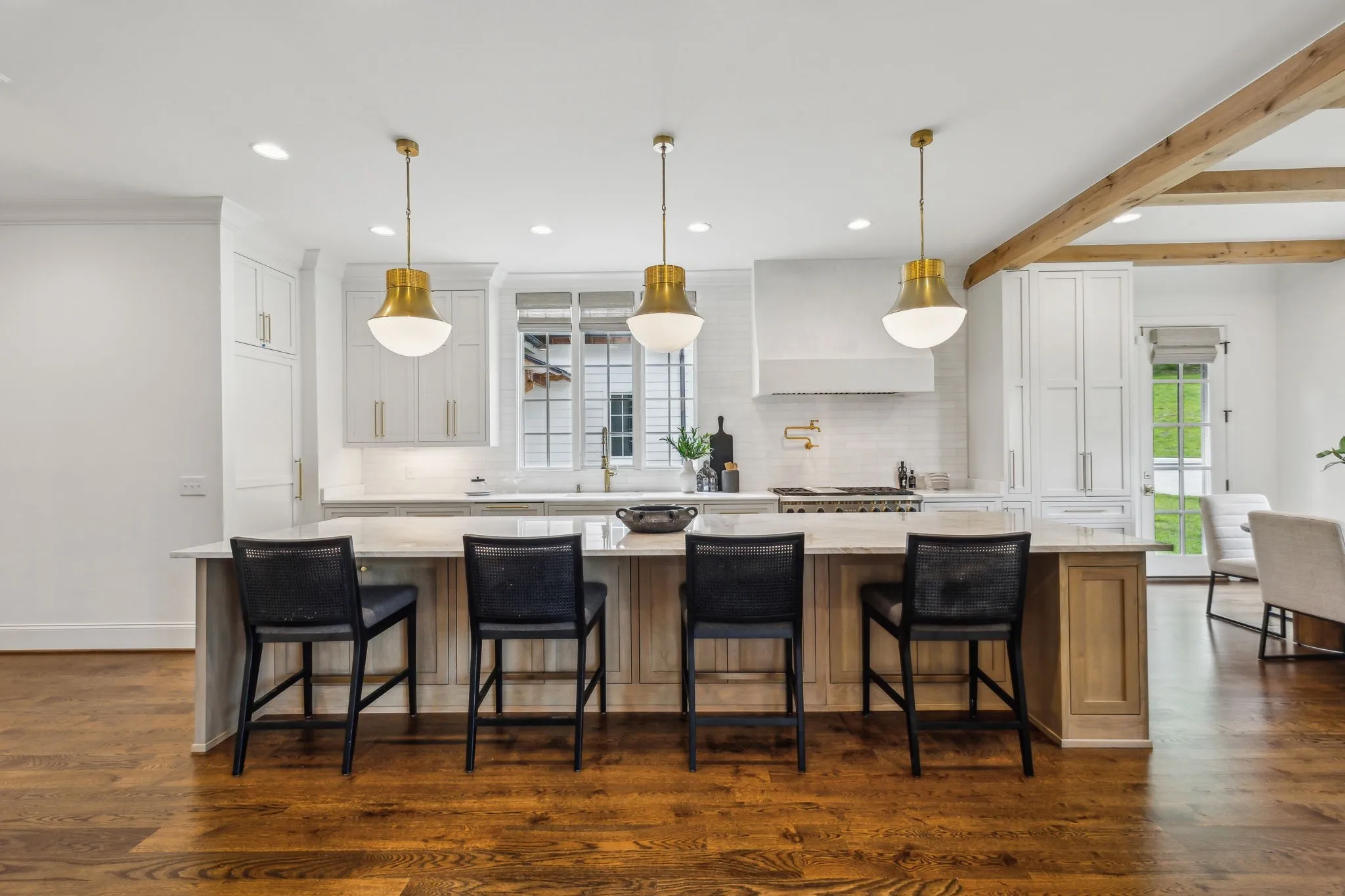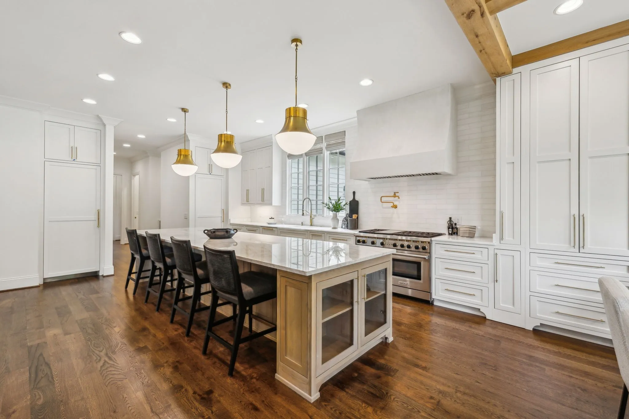 Inside, five impeccably designed bedrooms and five-and-a-half luxurious bathrooms showcase meticulous craftsmanship and attention to detail. At the heart of the home, a chef’s kitchen serves as a true culinary masterpiece, featuring a stunning Taj Mahal Quartzite island, custom cabinetry, and top-tier appliances—including a Thermador column refrigerator and freezer, Thermador microwave, and a professional Wolf gas range with six burners, a griddle, and a double oven. Thoughtfully curated designer lighting, elegant beam detailing, and refined crown molding add layers of warmth and sophistication throughout.
