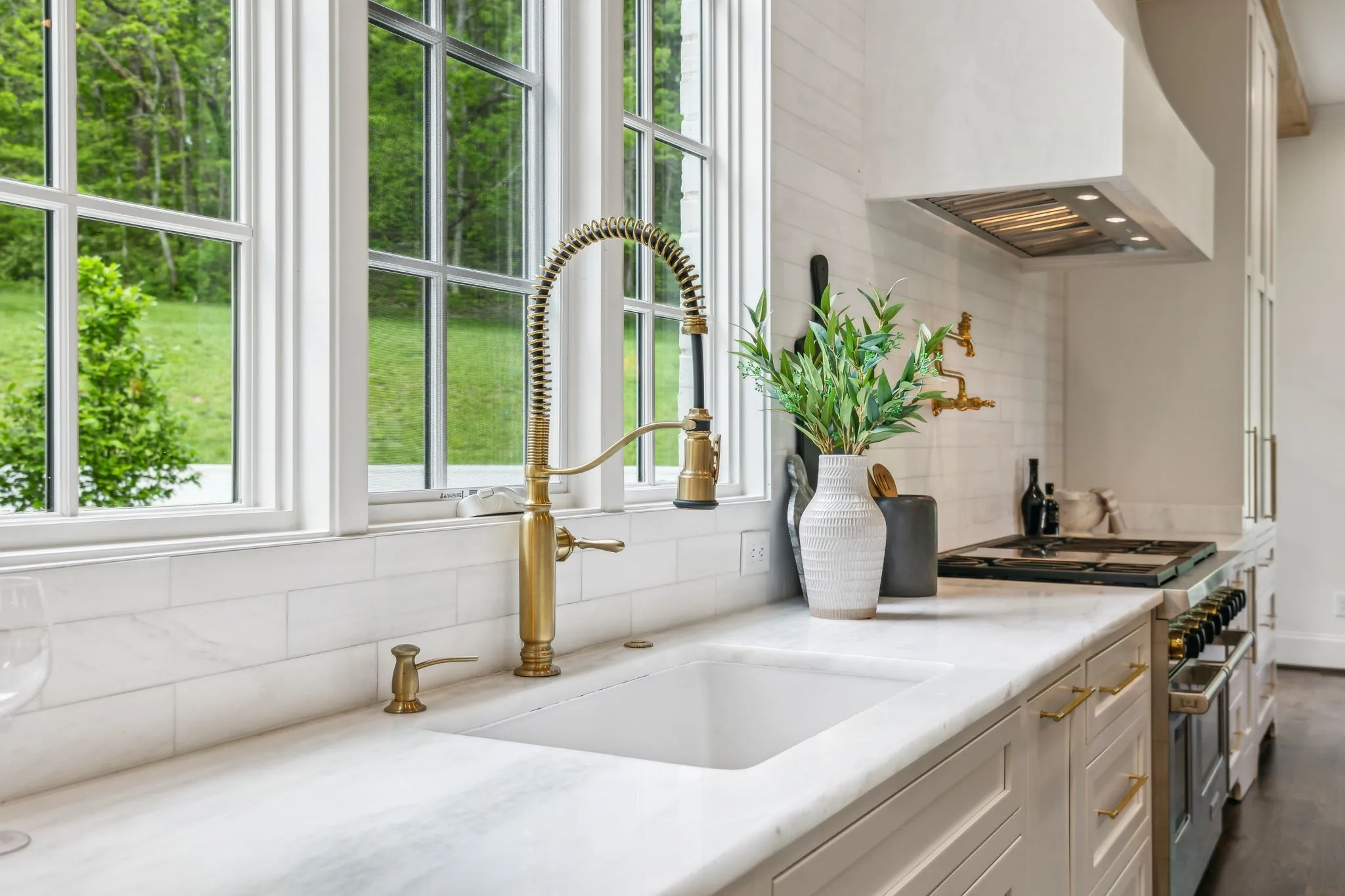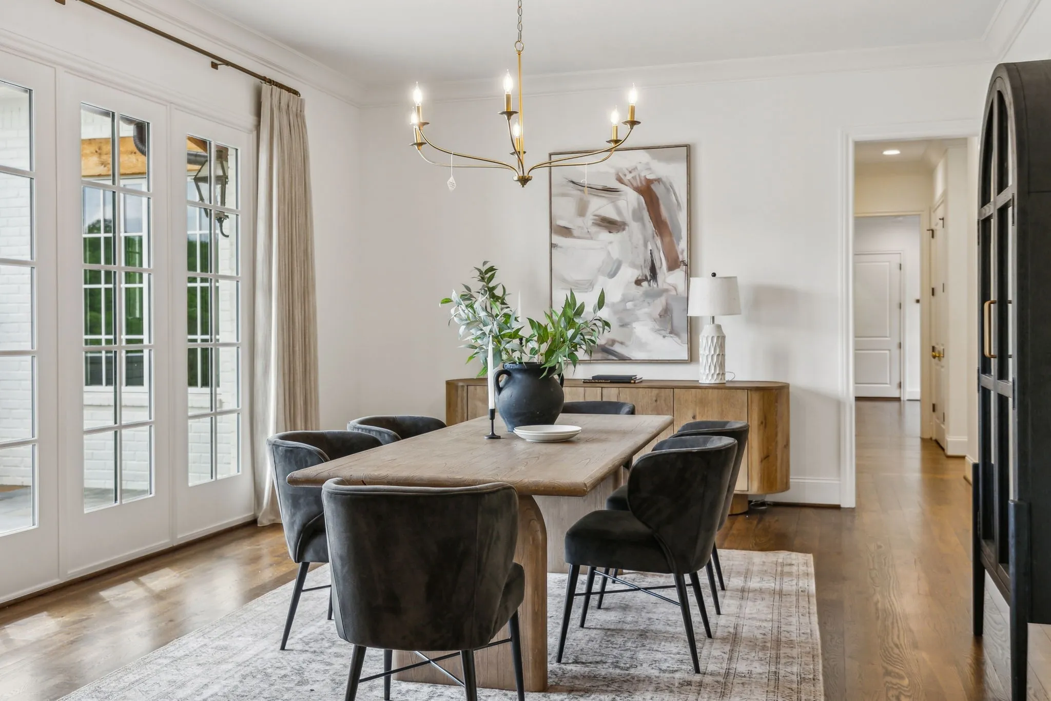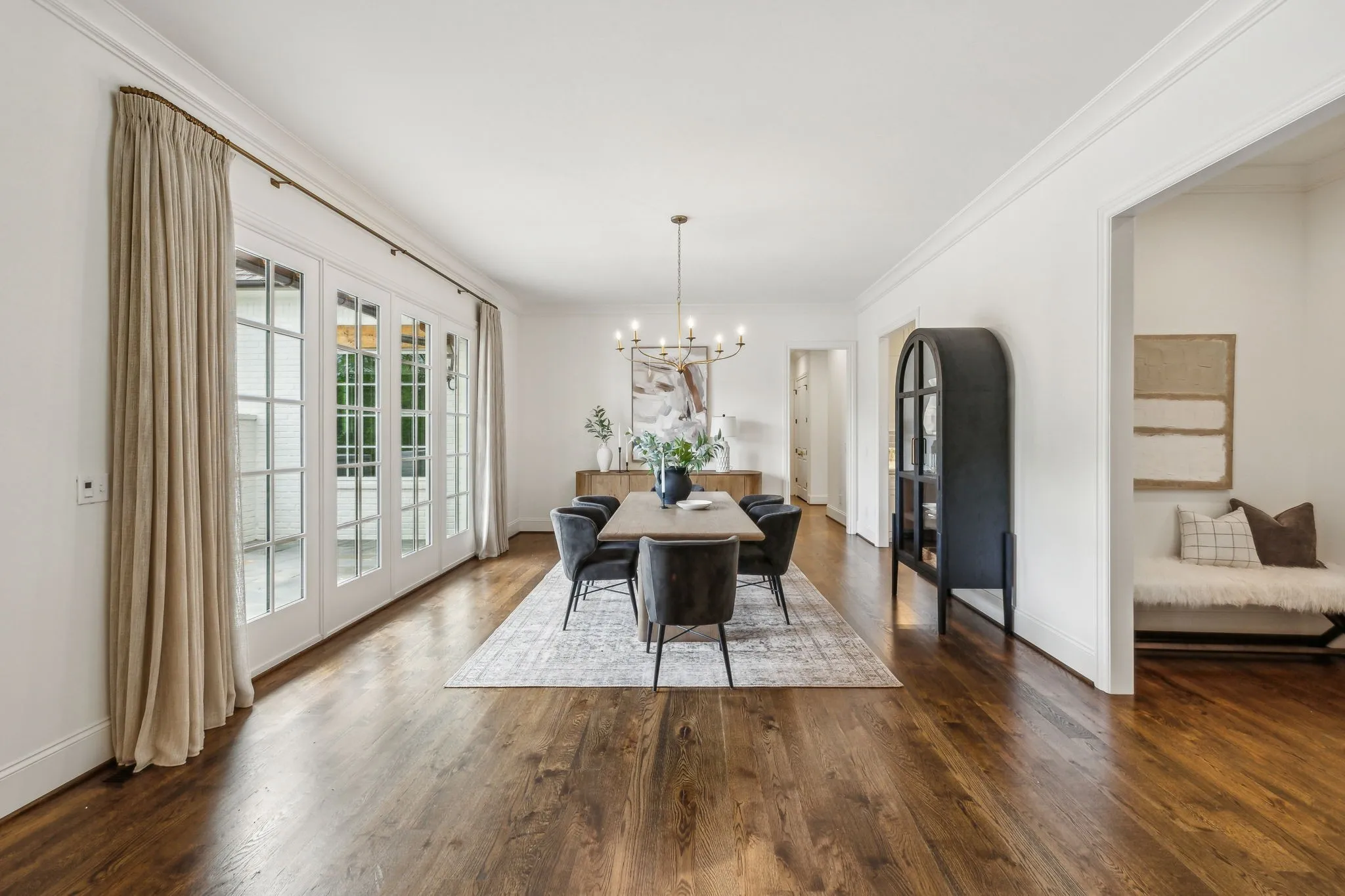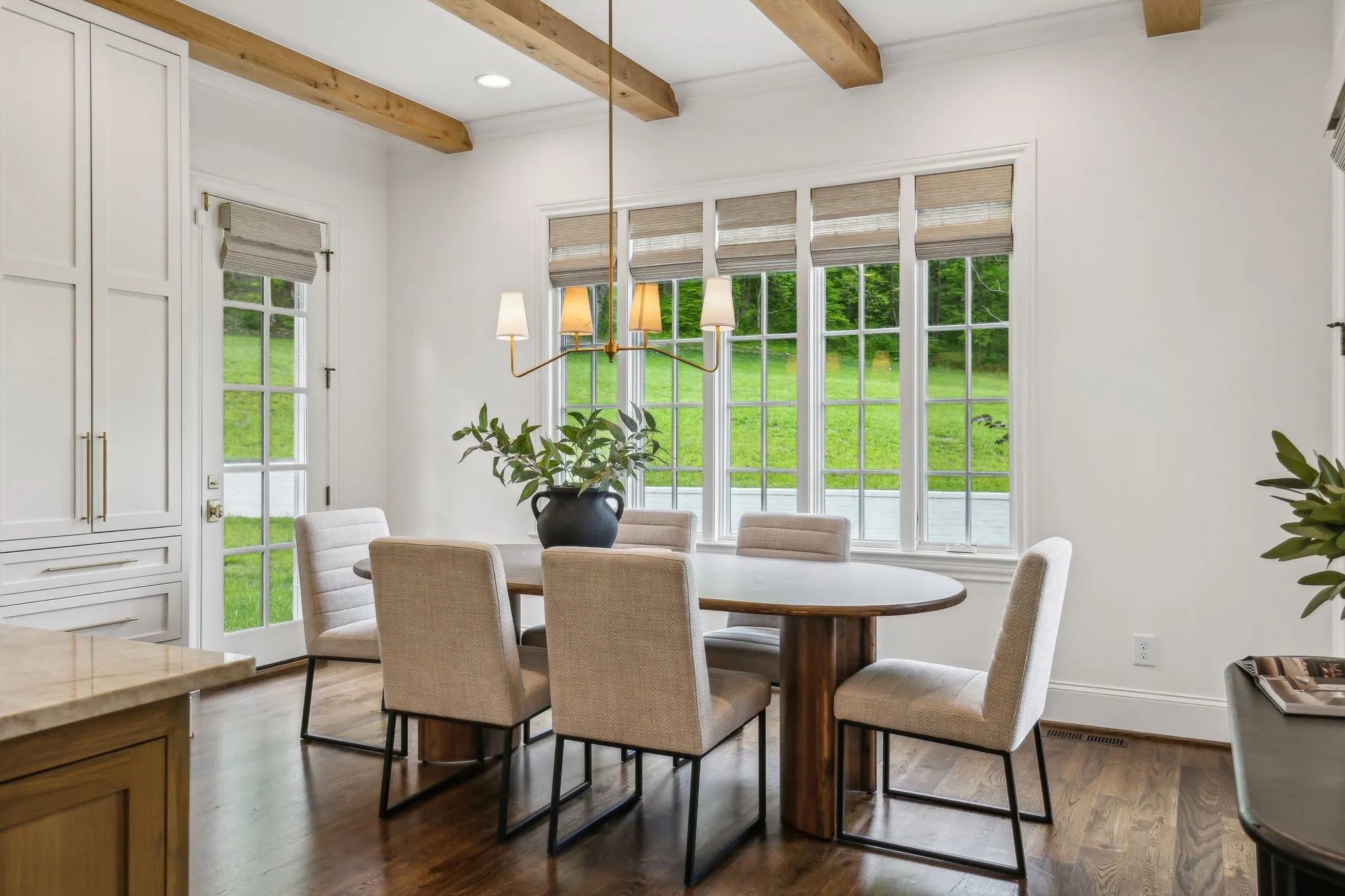 Inside, five impeccably designed bedrooms and five-and-a-half luxurious bathrooms showcase meticulous craftsmanship and attention to detail. At the heart of the home, a chef’s kitchen serves as a true culinary masterpiece, featuring a stunning Taj Mahal Quartzite island, custom cabinetry, and top-tier appliances—including a Thermador column refrigerator and freezer, Thermador microwave, and a professional Wolf gas range with six burners, a griddle, and a double oven. Thoughtfully curated designer lighting, elegant beam detailing, and refined crown molding add layers of warmth and sophistication throughout.