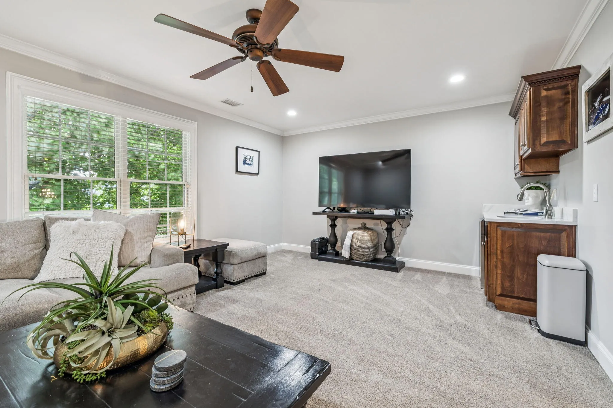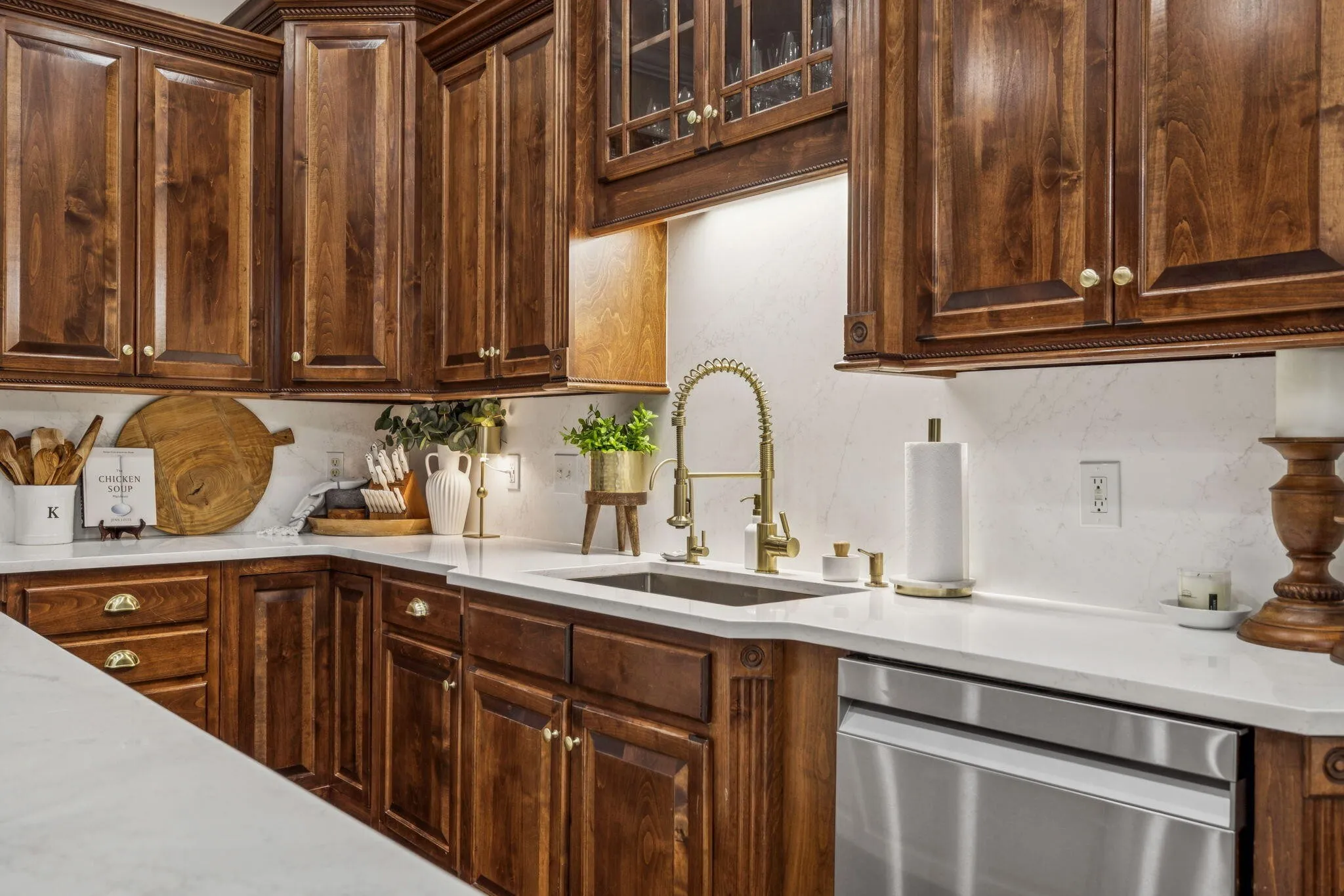 The heart of this home is its fabulously upgraded kitchen, complete with bright quartz countertops carried up the walls on the backsplash, new appliances, custom island, and upgraded faucets and lighting fixtures. Enjoy the health and convenience of a whole house water filtration and softener system, complemented by a reverse osmosis system for pristine water quality.
